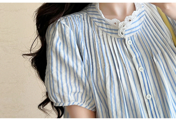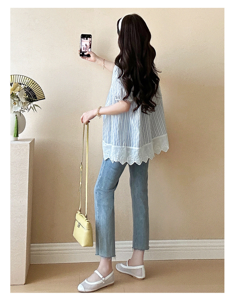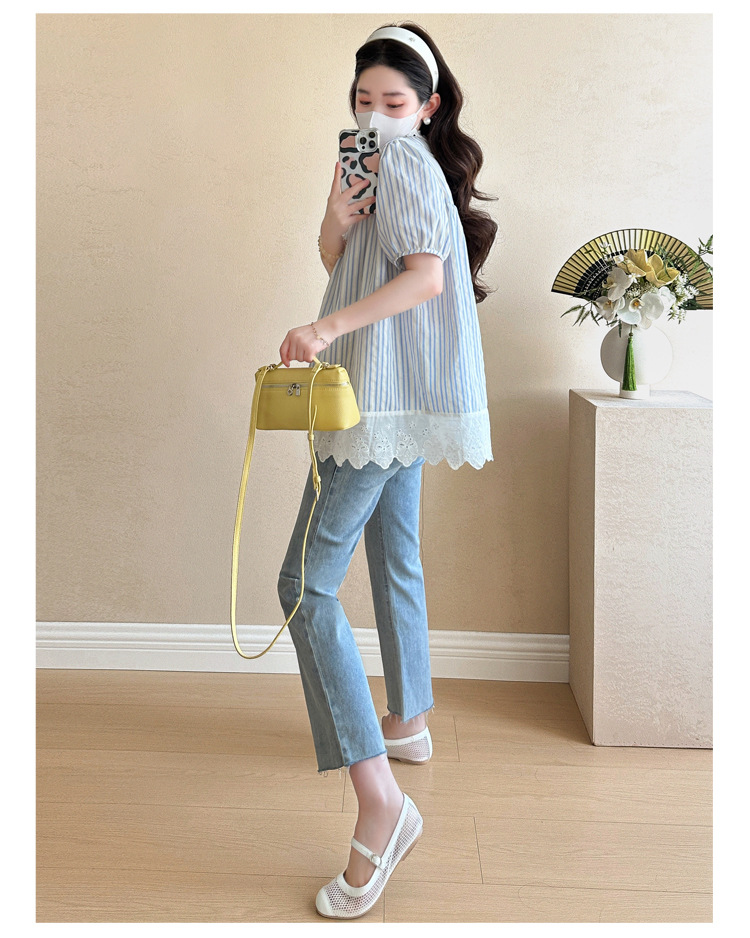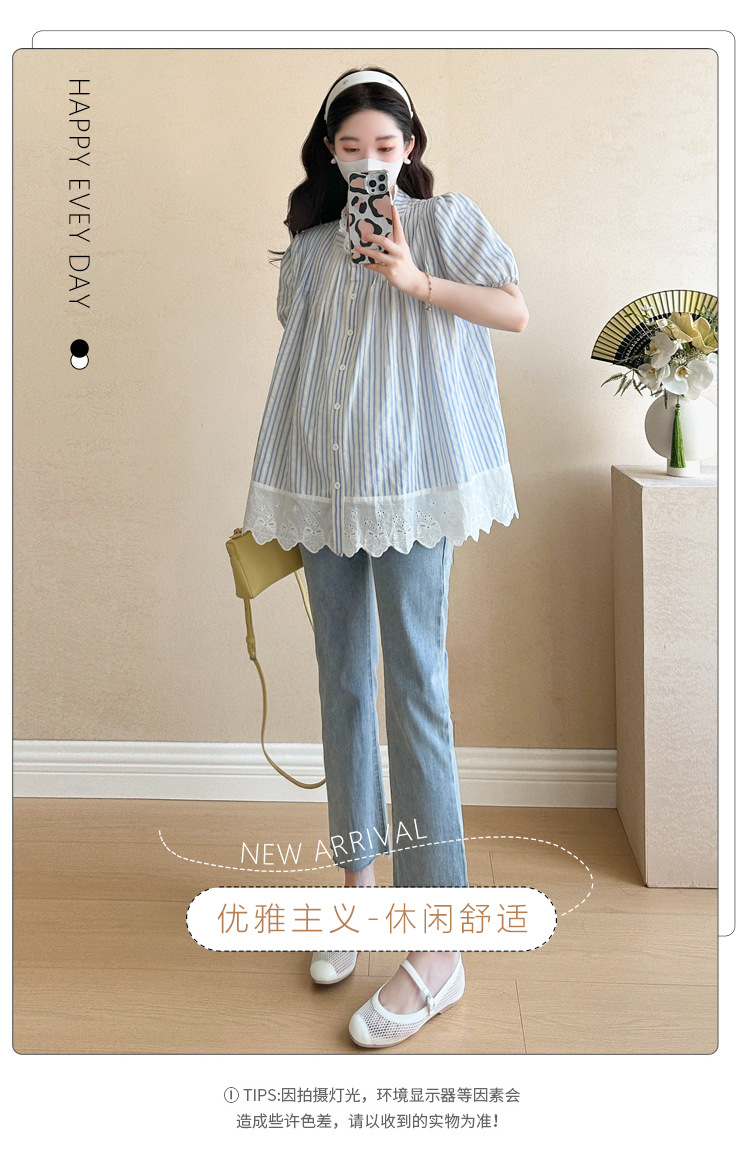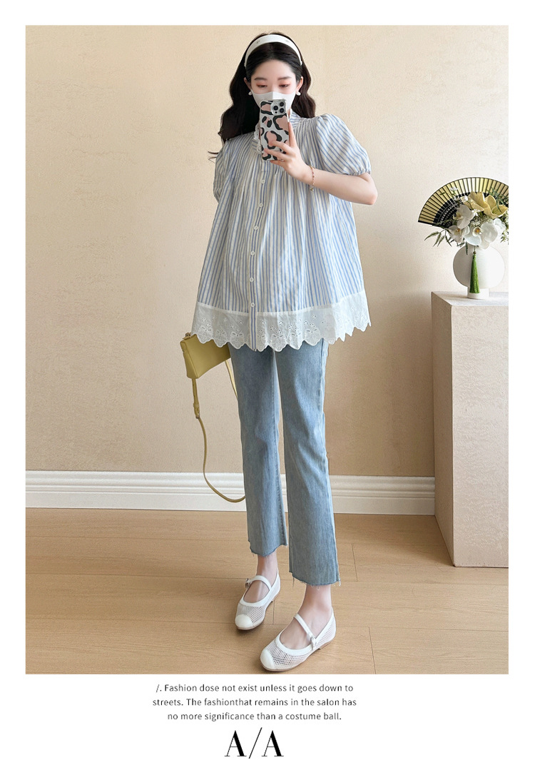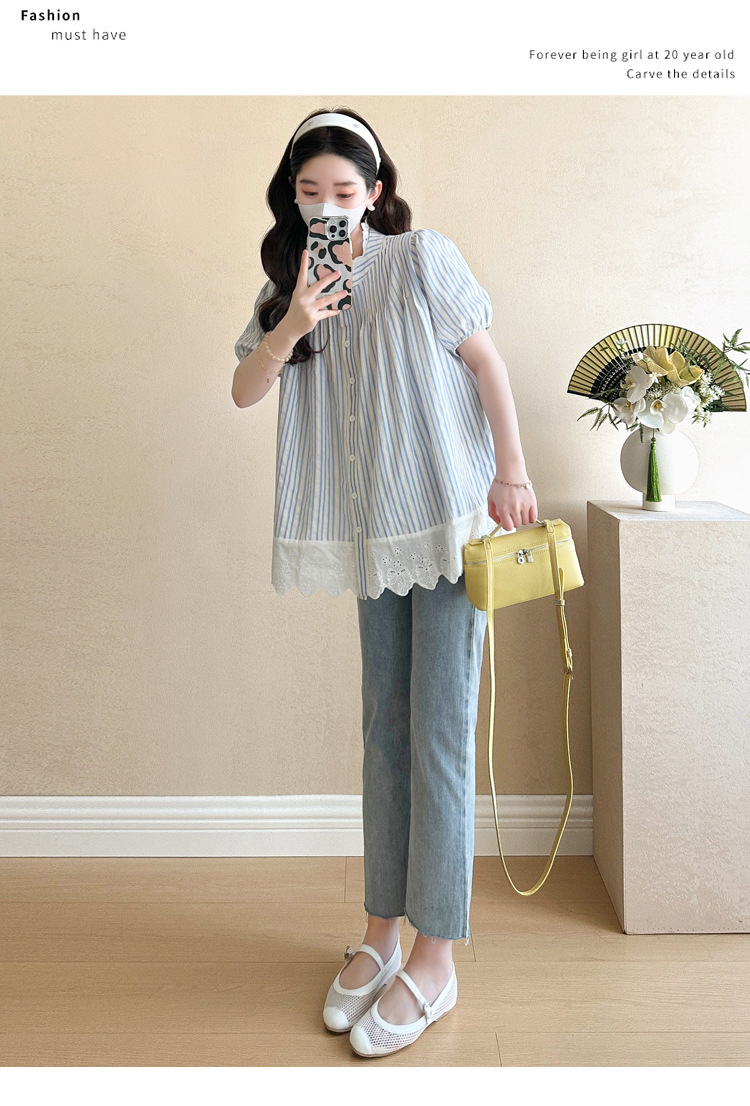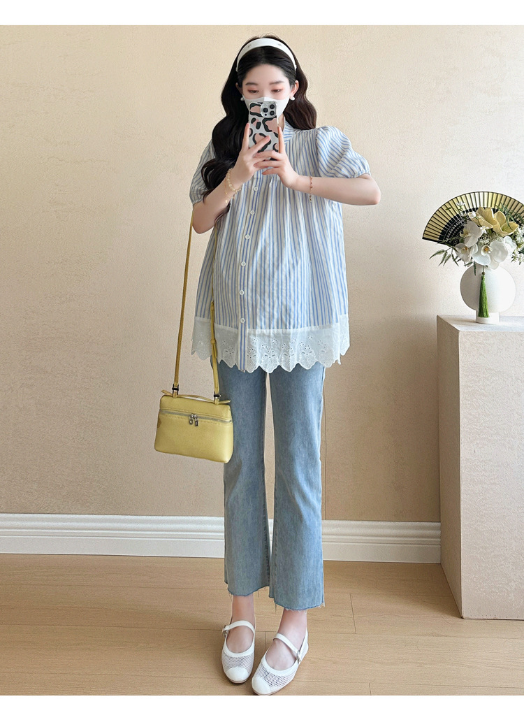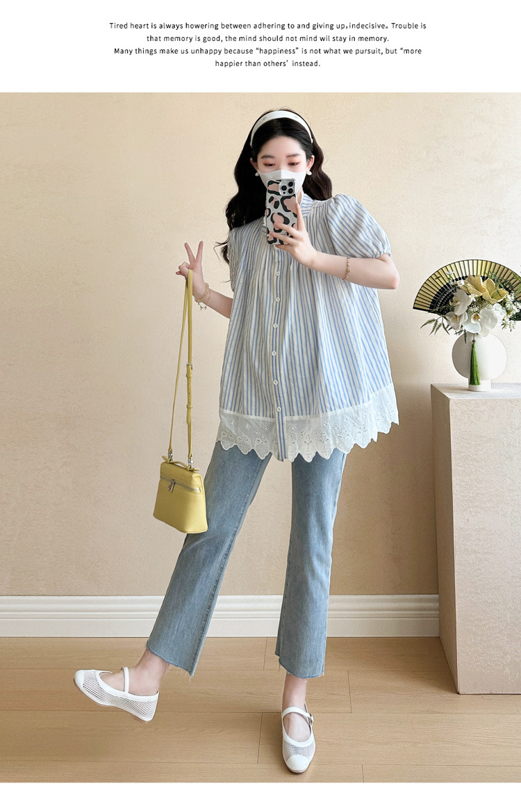 Пятно беременные рубашки летние новые хлопчатобумажные полоски плиссированные жаккардовые сшитые кружева для беременных топы могут открыть для кормления