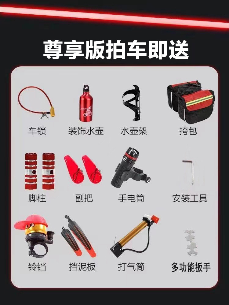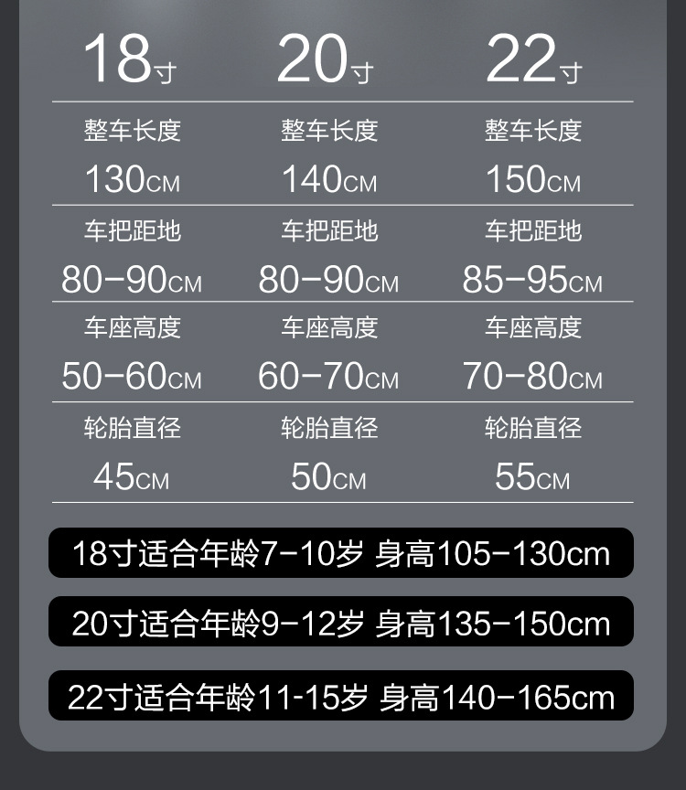 18inch (рост 115-135см); 20inch (рост 130-150см); 22inch (рост 140-160см); 24inch (рост 150-170см); 26inch (рост 160-180см)