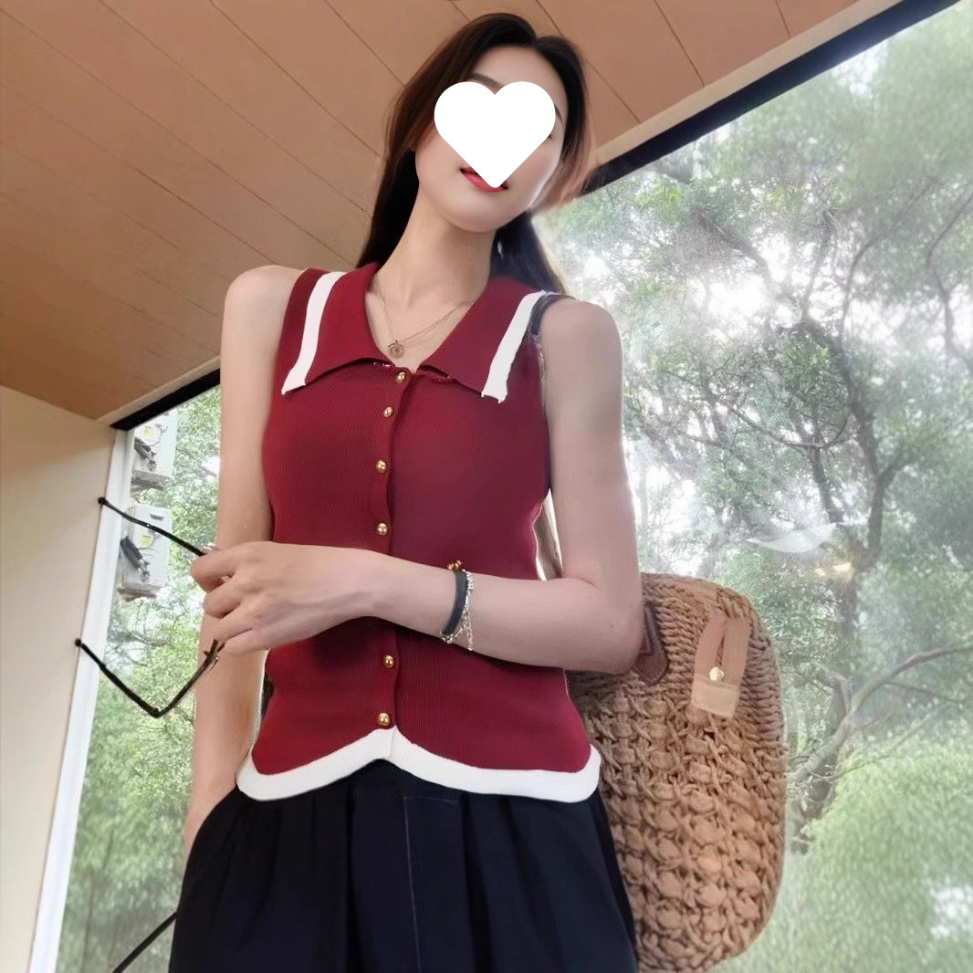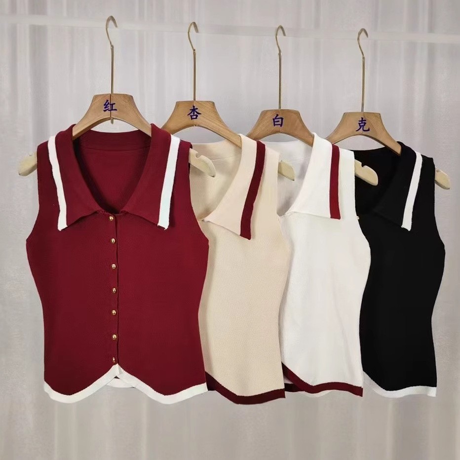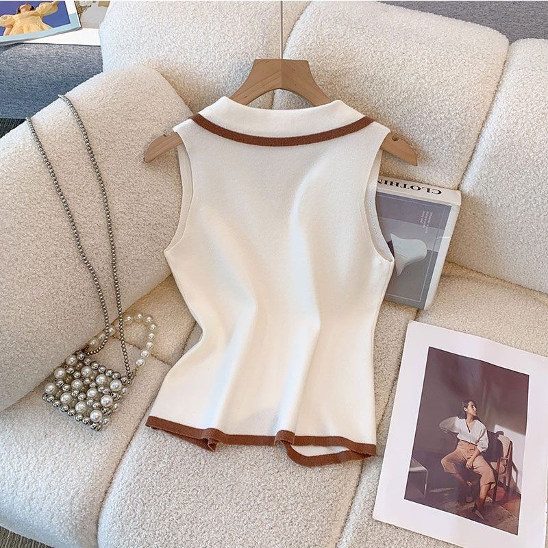 Летнее чувство высокого уровня без рукавов Французский трикотажный жилет с отворотом