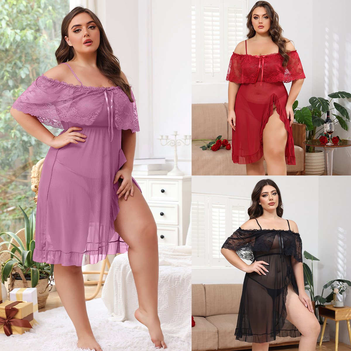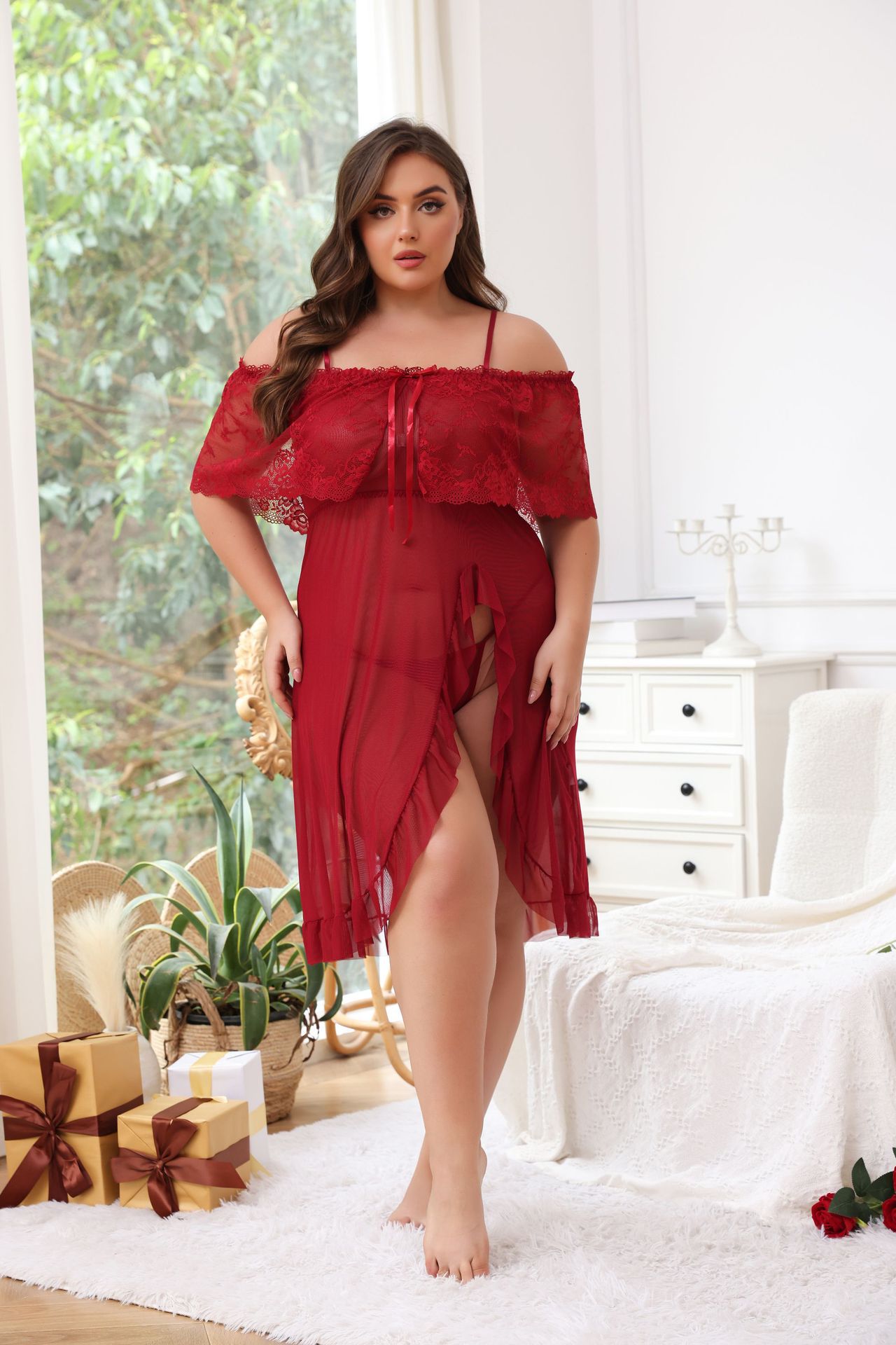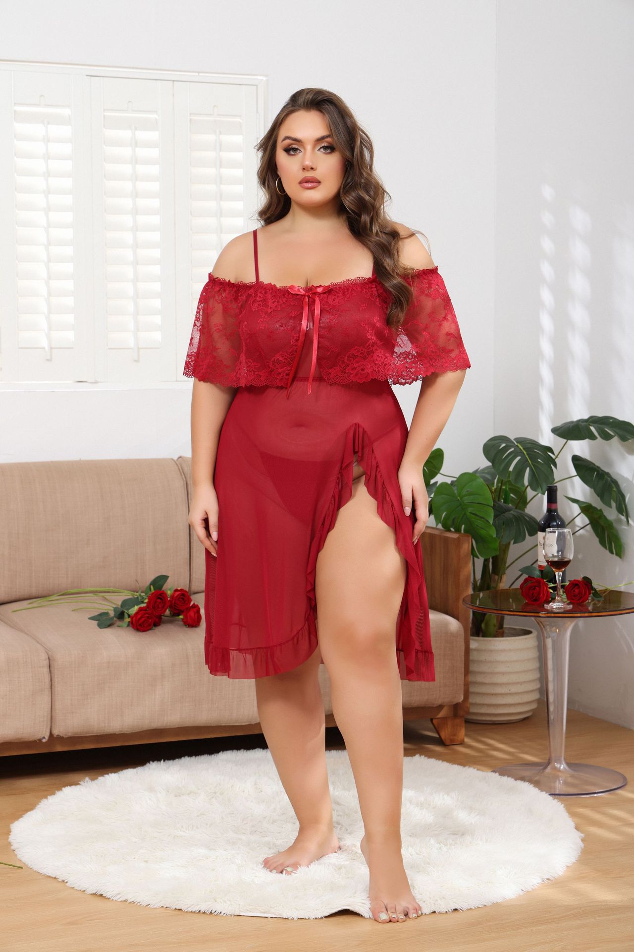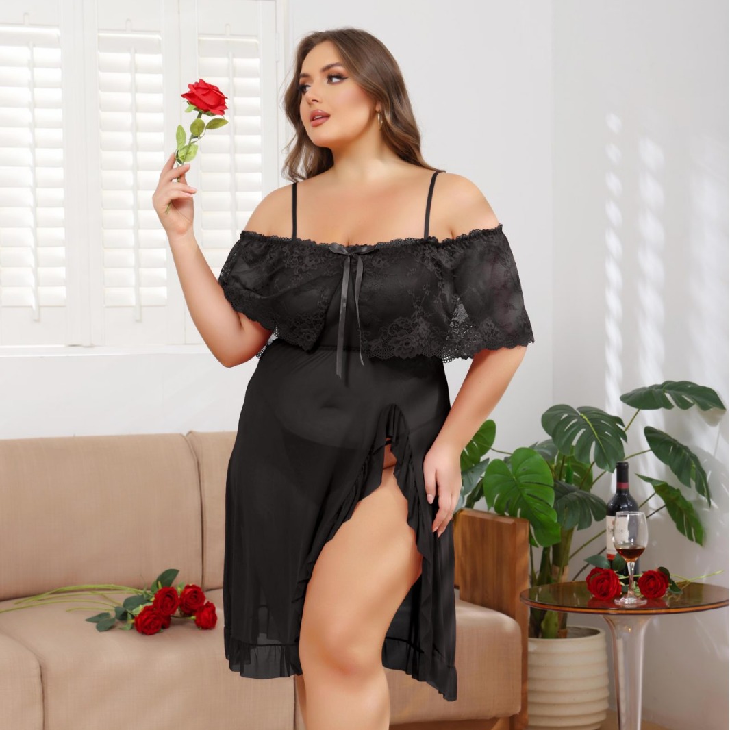 Сексуальная ночная сорочка из полупрозрачного кружева с бантом, плиссировкой и разрезом, без застежек, для соблазнительного образа