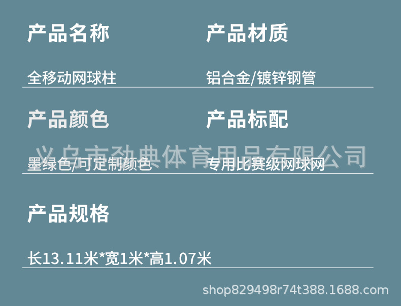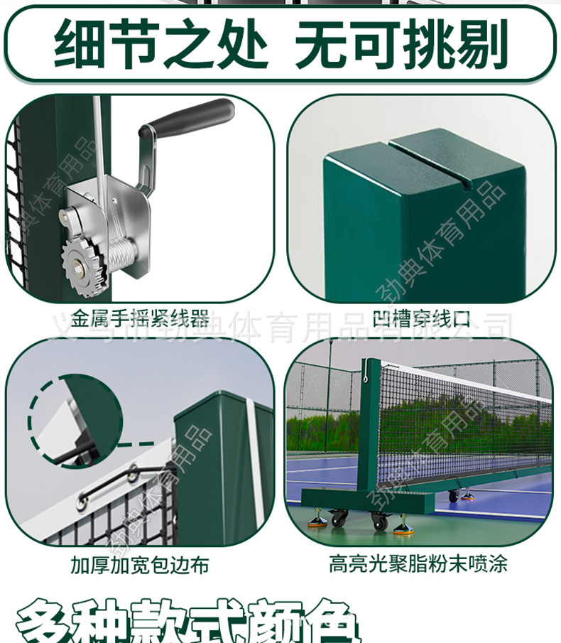 Мобильная теннисная стойка [включая стандартную теннисную сетку] из оцинкованной стальной трубы; Мобильная теннисная стойка [включая стандартную теннисную сетку] полностью из алюминиевого сплава; Мобильная теннисная стойка [включая двухслойную сетку соревновательного уровня + центральный ремень] натяжитель медного сердечника; Теннисный столб наземного типа [без сетки] из оцинкованной стальной трубы; Предварительно встроенный теннисный столб [без сетки] из оцинкованной стальной трубы; Алюминиевый сплав - подземный теннисный столб [без сетки] натяжитель медного сердечника; Теннисный столб из алюминиевого сплава напольного типа [без сетки] натяжитель медного сердечника; стандартная теннисная сетка; Смелая теннисная сетка для соревнований; Двухслойная теннисная сетка для соревнований