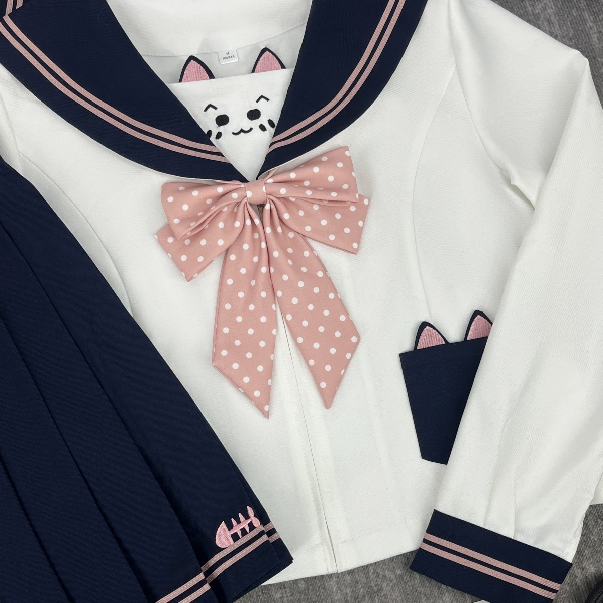 Sweet Meow Nana: Розовая кофта с длинным рукавом + Розовый двухслойный галстук-бабочка в горошек + Подходящая мини-юбка; Sweet Meow Nana: Розовый комплект с коротким рукавом: рубашка на пуговицах + розовый двухслойный галстук-бабочка в горошек + юбка в тон; Sweet Meow Nana: Розовая кофта с длинным рукавом + Розовый двухслойный галстук-бабочка в горошек; Sweet Meow Nana: Розовая рубашка с короткими рукавами на пуговицах + розовый двухслойный галстук-бабочка в горошек; Сладкая Мяу Нана: розовая короткая юбка + носки