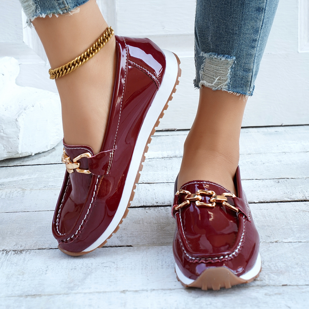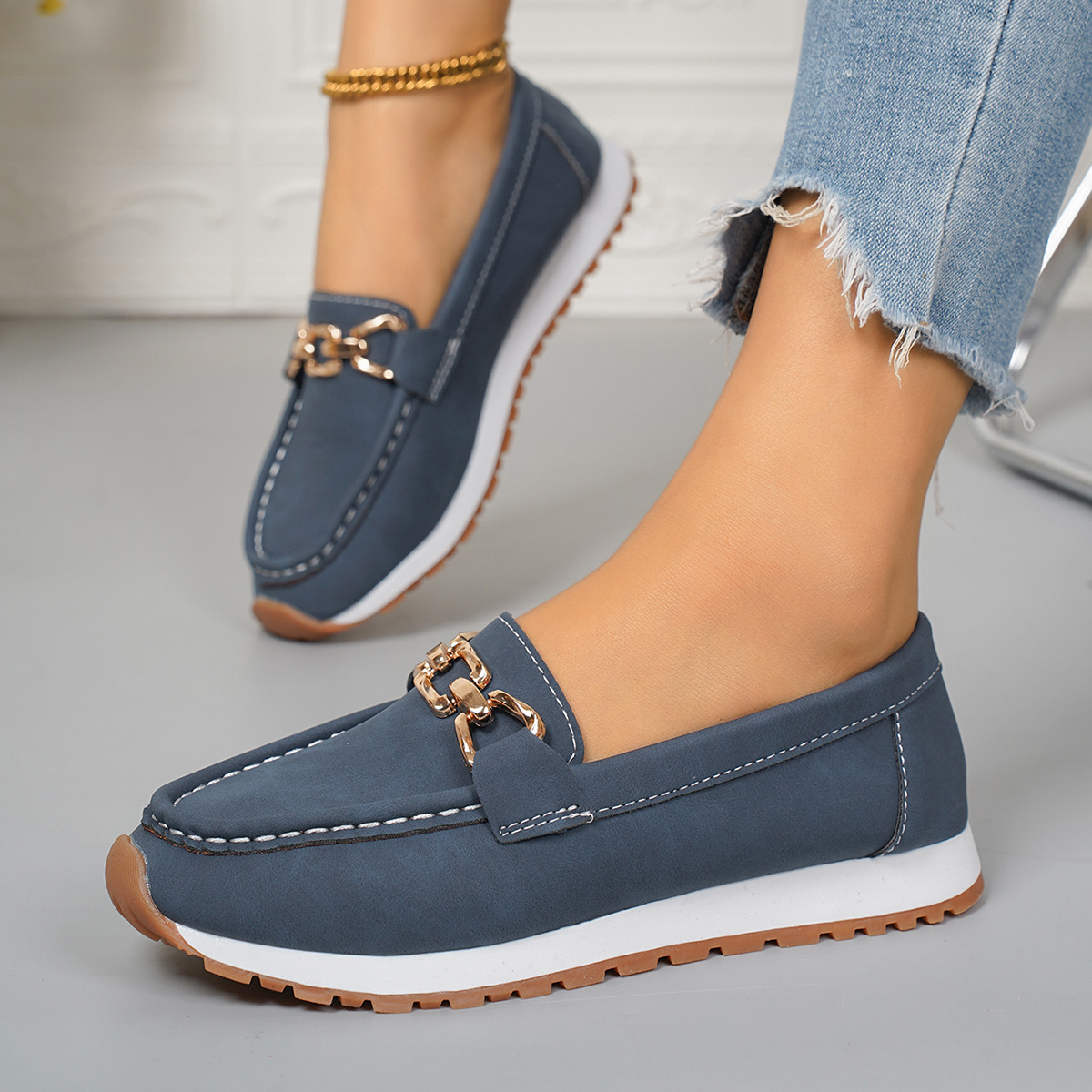 2025 новый стиль трансграничная мода с круглой головкой ножки с толстой подошвы мода повседневная большая пара размер женщины с глубоким ртом металлическая цепочка одиночная обувь для женщин
