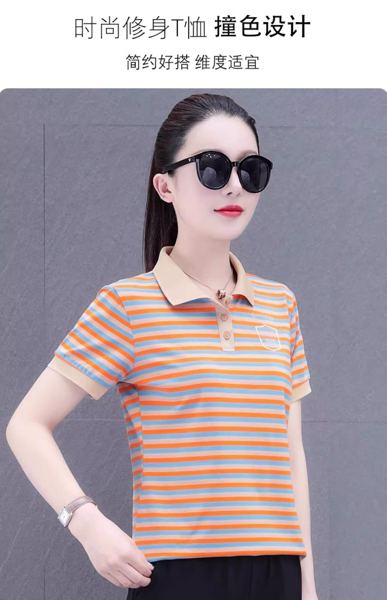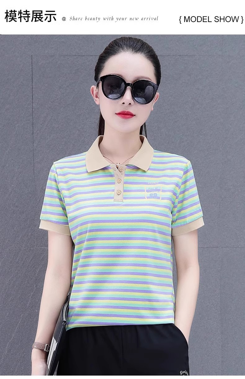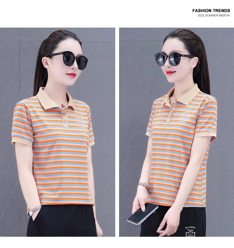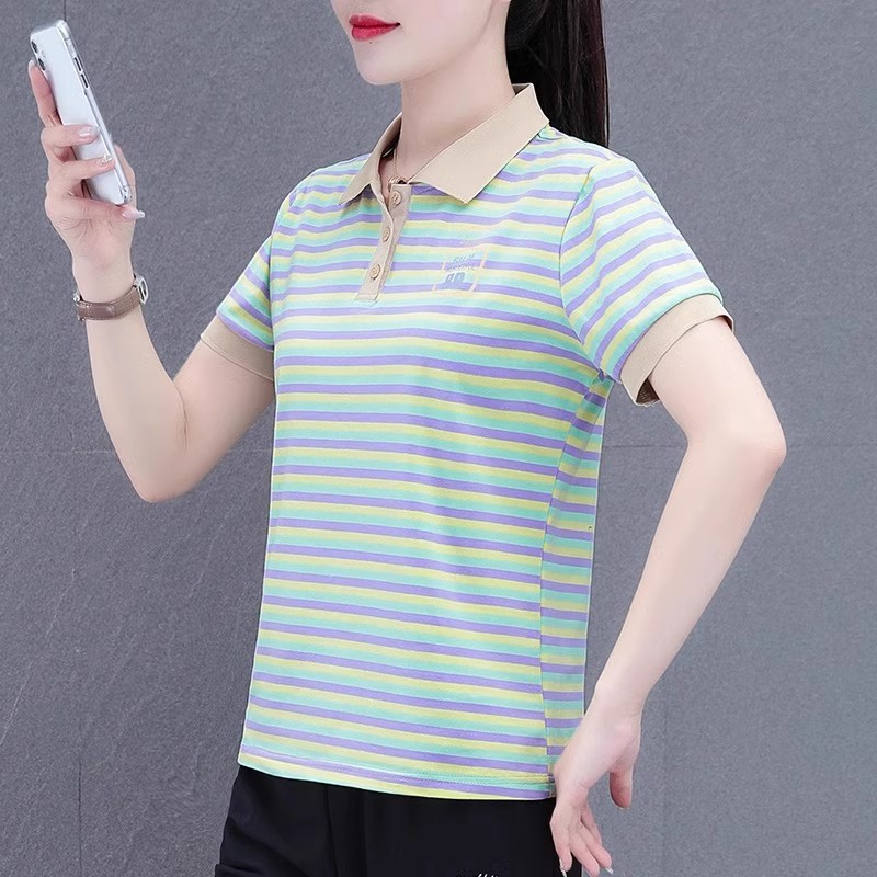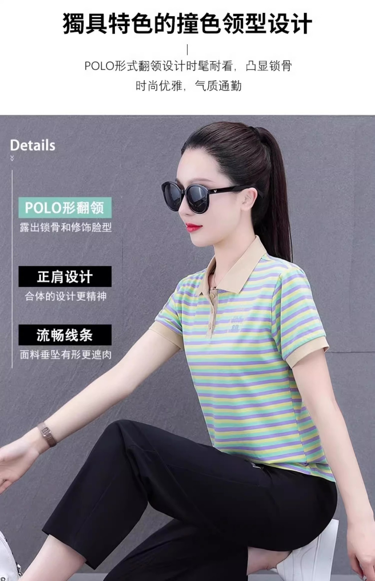 Летняя женская футболка с коротким рукавом, поло в полоску, повседневный свободный облегающий топ с воротником и короткими рукавами