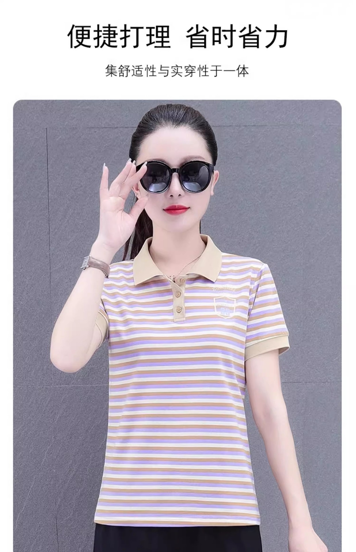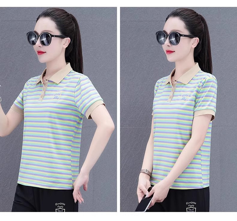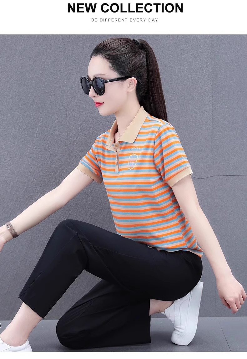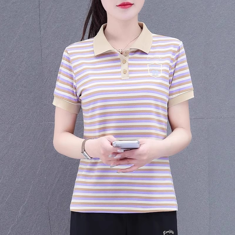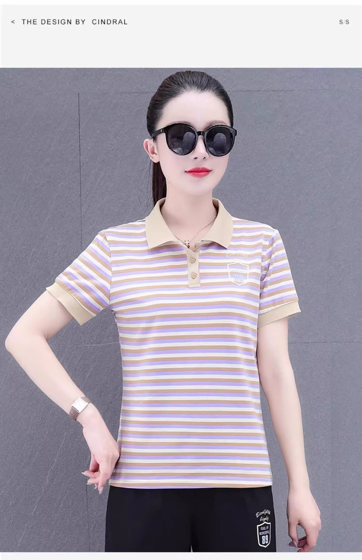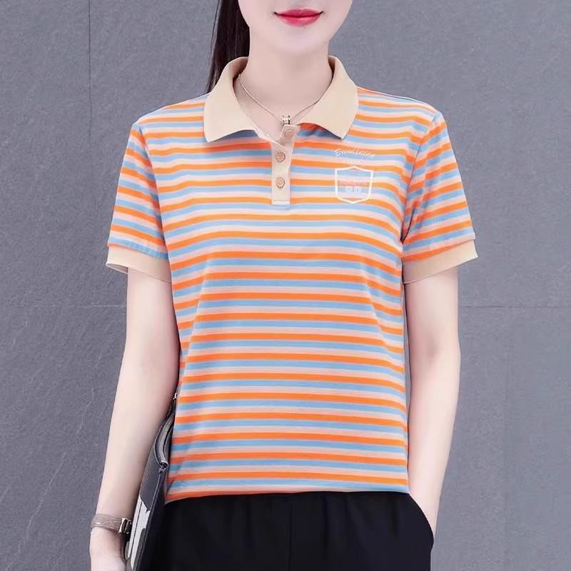 Летняя женская футболка с коротким рукавом, поло в полоску, повседневный свободный облегающий топ с воротником и короткими рукавами