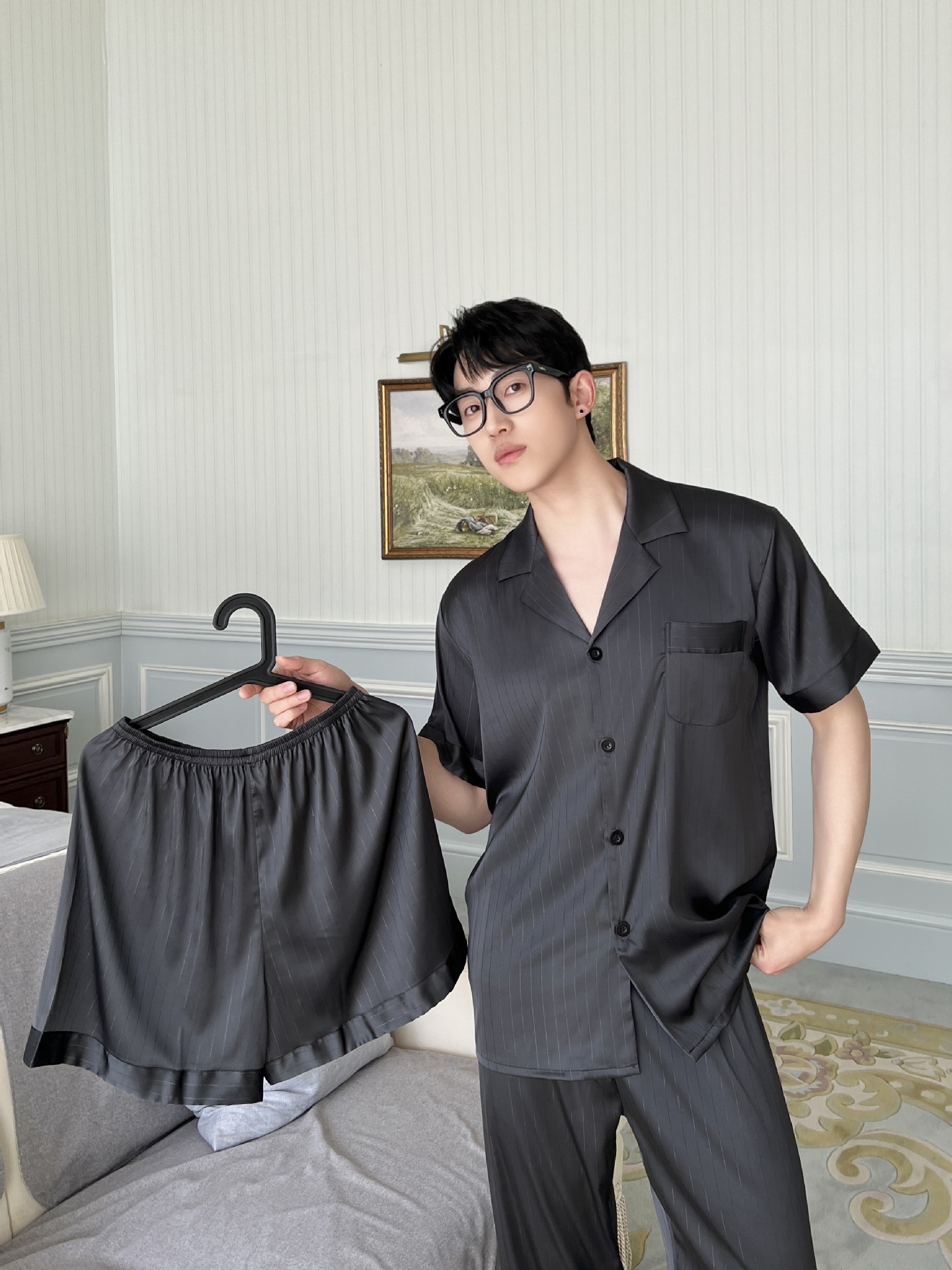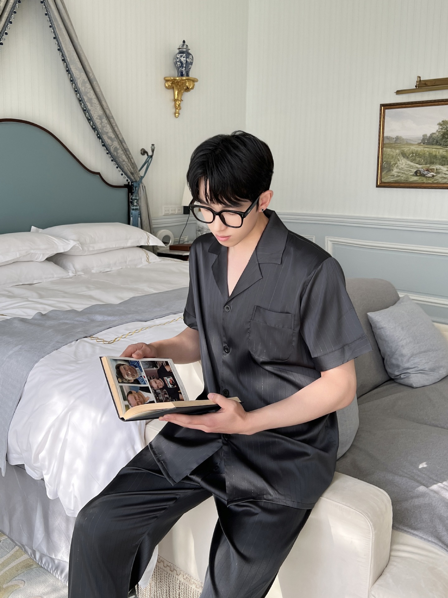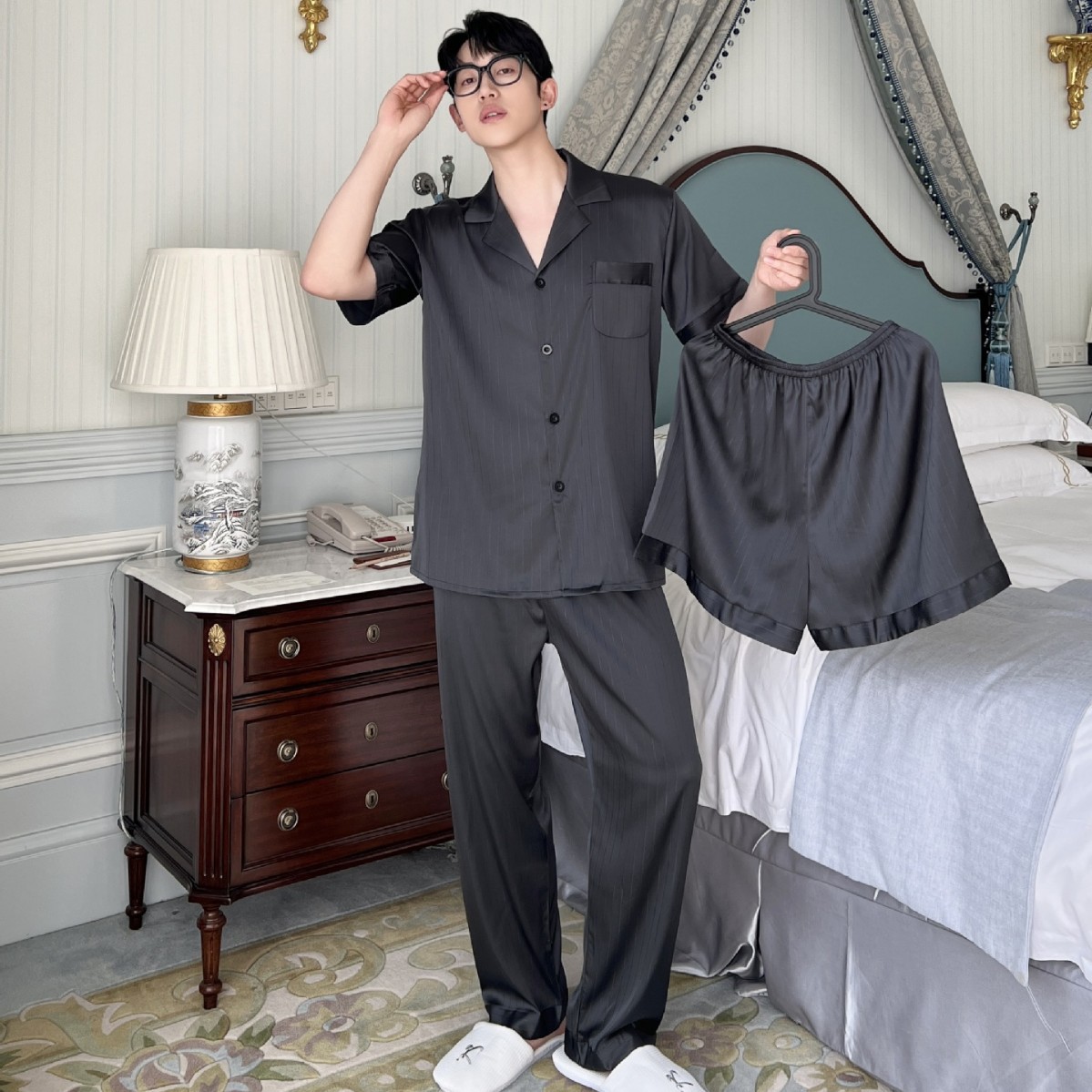 Весна и лето новая серебряная шелковая мужская пижама с короткими рукавами тонкий кардиган лацканный воротник продвинутый смысл простой повседневный большой размер домашней одежды