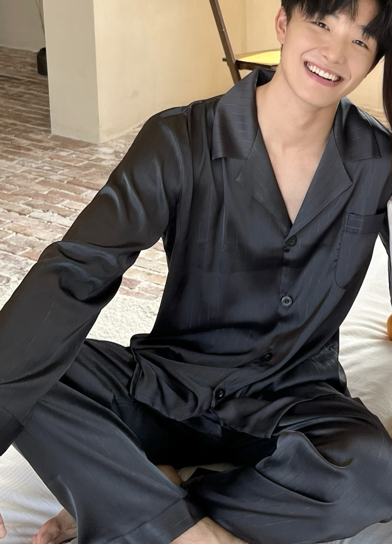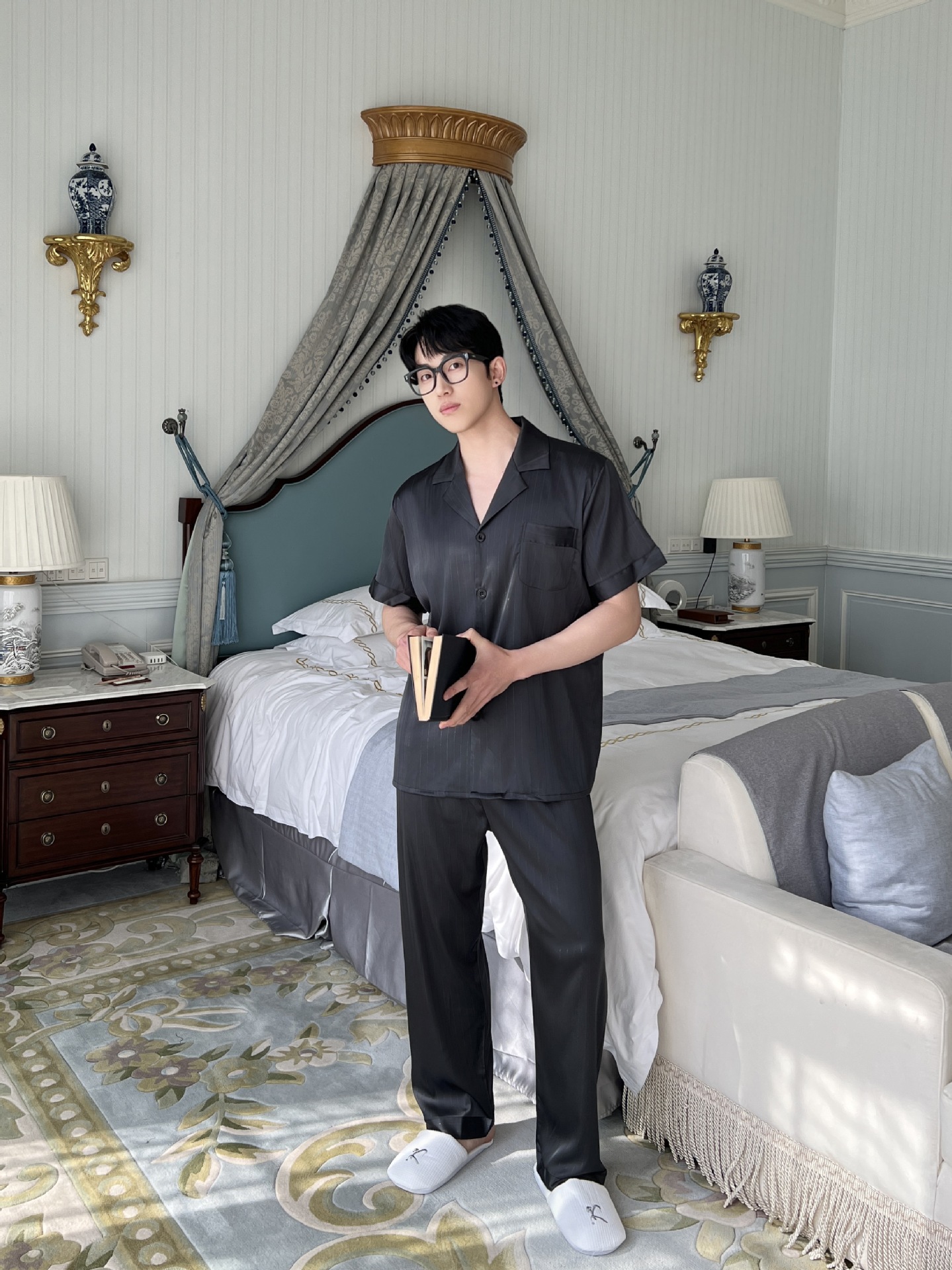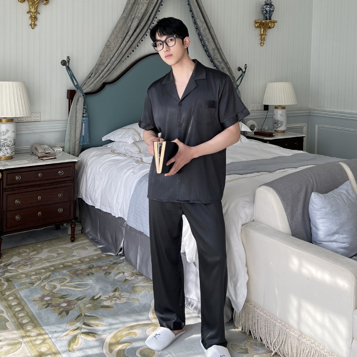 Весна и лето новая серебряная шелковая мужская пижама с короткими рукавами тонкий кардиган лацканный воротник продвинутый смысл простой повседневный большой размер домашней одежды