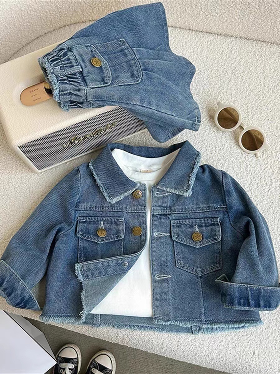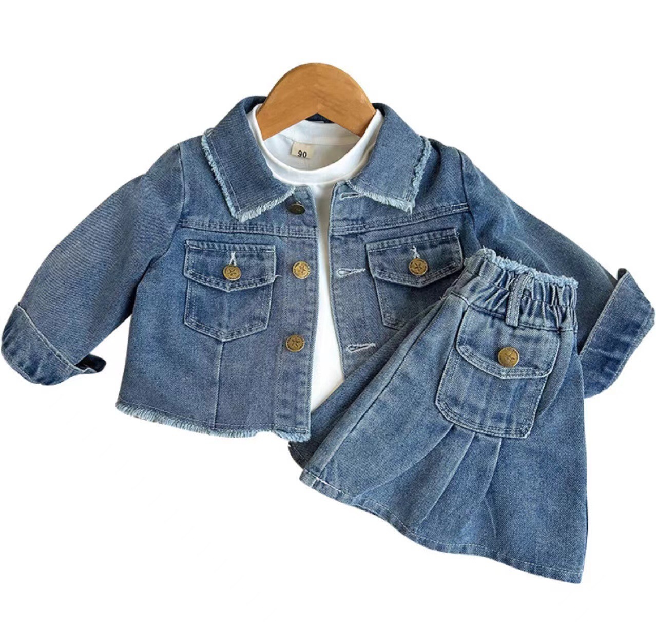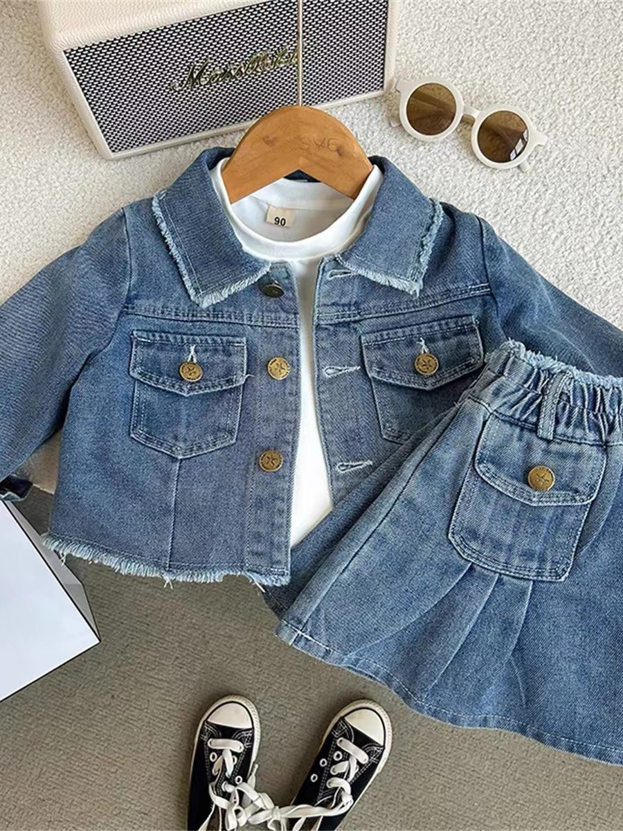 2025 Корейский стиль джинсовая куртка для девочек ретро лацканы длинный рукав плиссированная юбка костюм модный двухсоставной комплект