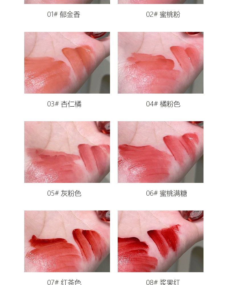 01 # тюльпан; 02 # персиковый порошок; 03 # Миндальный Апельсин; 04 # Оранжево-розовый; 05 # серо-розовый; 06 # Персики, наполненные сахаром; 07 # темно-коричневый; 08 # варенье красное