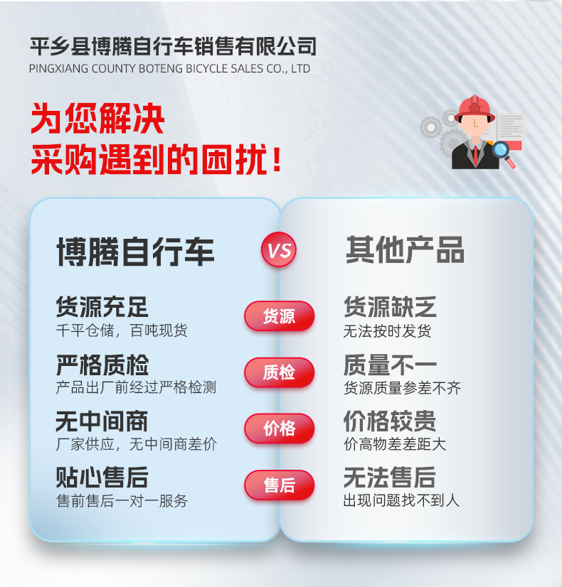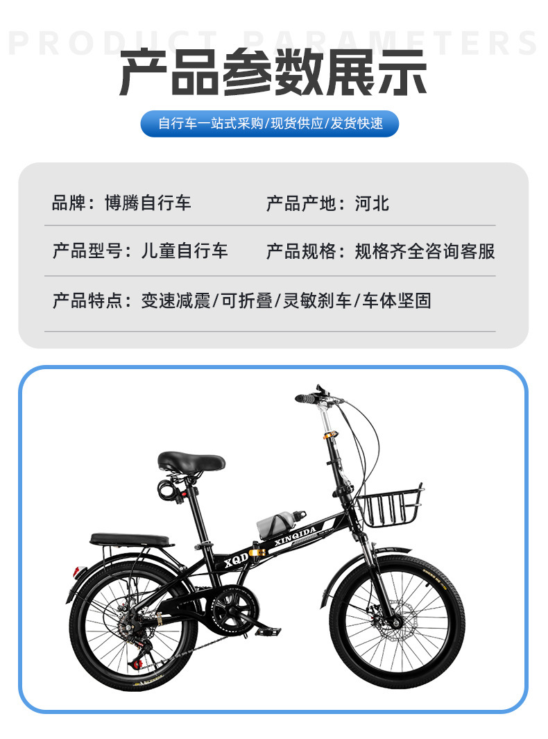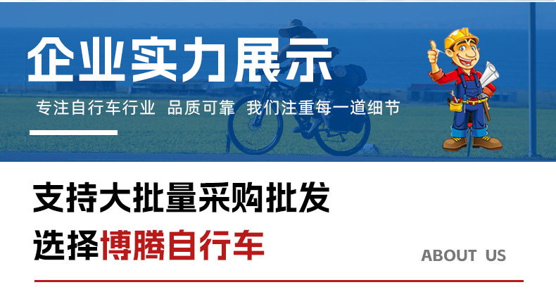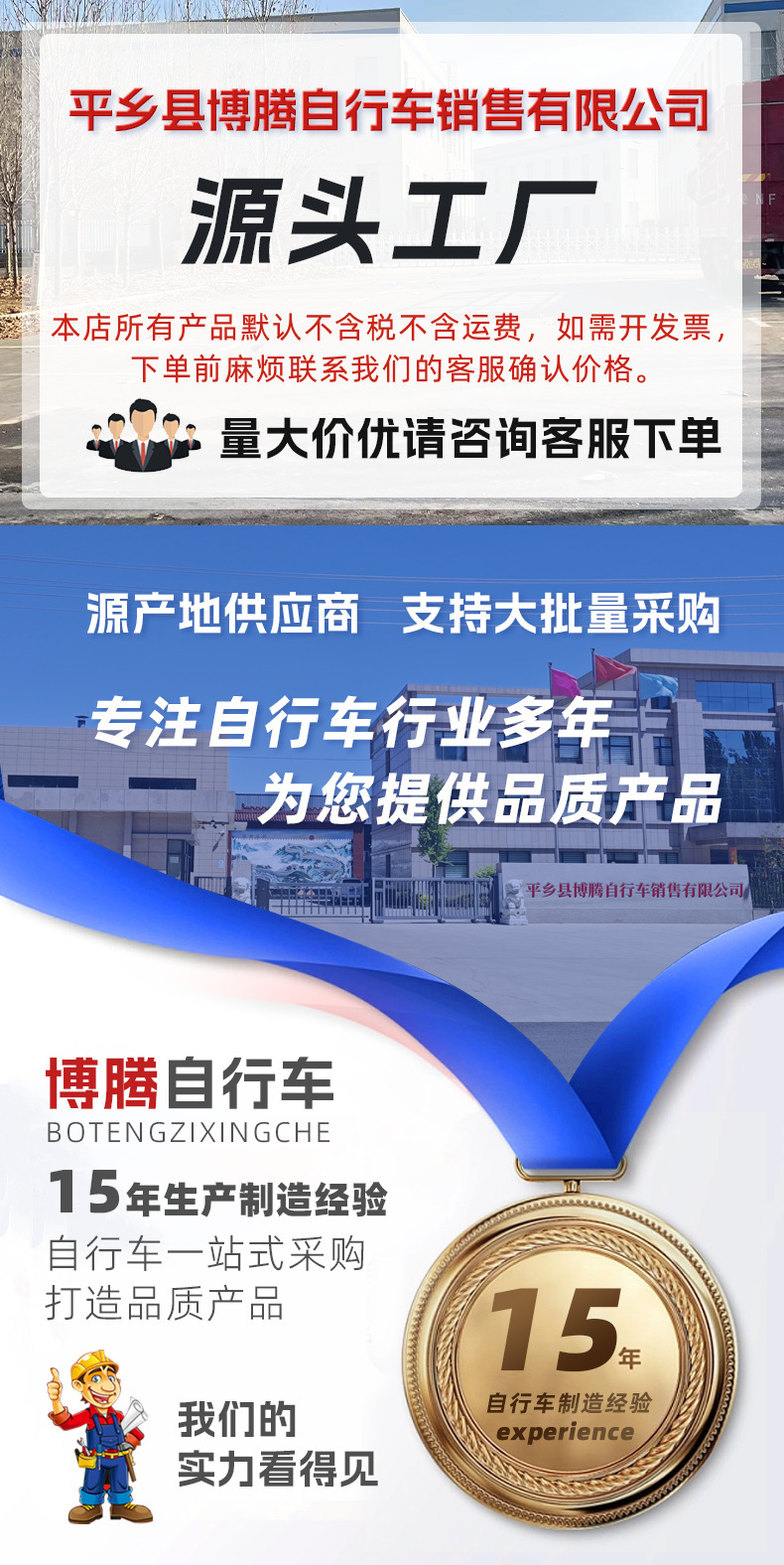 本公司是一家专业生产:儿童自行车、折叠自行车、成人自行车,等产品的有限责任公司,有多种型号自行车,适合不同年龄段的人群,深受大家的喜爱。公司于2000年成立于河北省平乡县,本公司拥有完整的装配流水线,配合科学质量管理体系,选用优质材料生产,产品以个性化设计配合人体工程学理念,质量长期稳定,将利润给经销商,产品畅销全国各地,十年来产品受到了大量消费者的赞誉,十年铸就品牌,专业值得信赖,因细致而完美,努力创新,挑战自我,我们承诺:让您满意。本公司的诚信、实力和产品质量获得同行业的认可。欢迎各界朋友莅临平乡县博腾自行车销售有限公司参观、指导和业务洽谈。