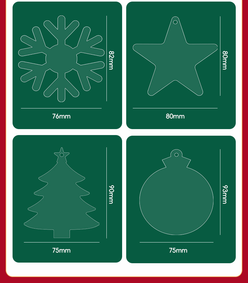 Рождественский круг 1:80*75*2мм; Рождественский круг 2:93*75*2мм; Рождественский круг 3:93*75*2мм; Пентаграмма: 80*80*2 мм; Снежинка: 82*76*2 мм; Рождественская елка: 90*75*2 мм