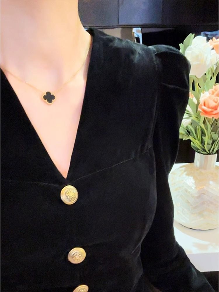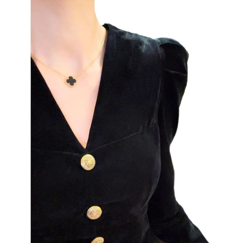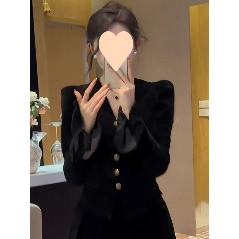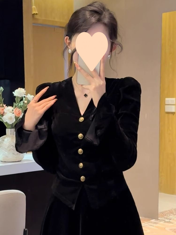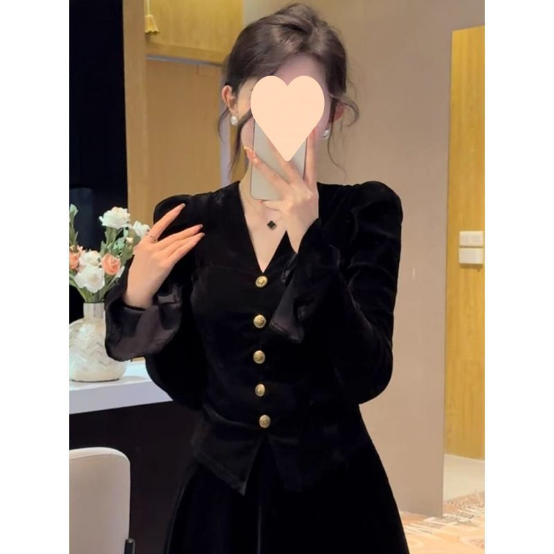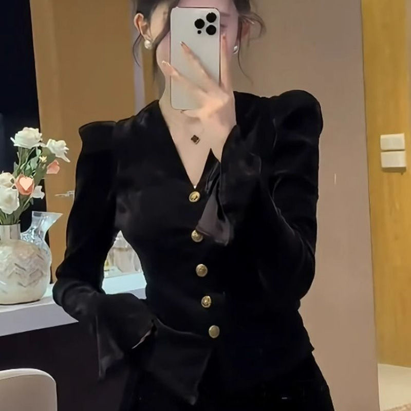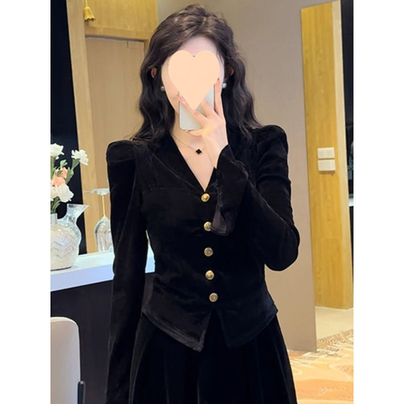 Черная блузка с воротником и пышными рукавами, новинка 2024 года, женская осенне-зимняя, уникальная и изысканная, высококачественный французский бархатный топ, нежный и изящный.