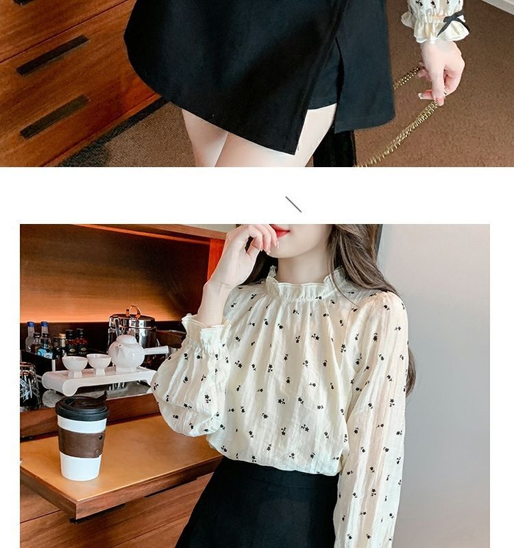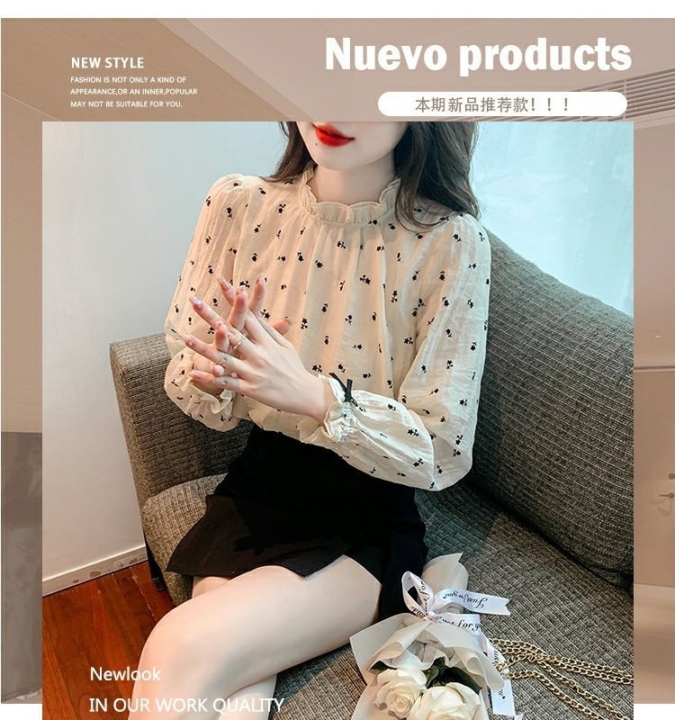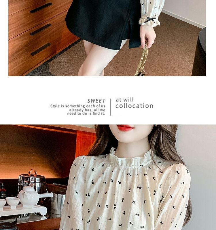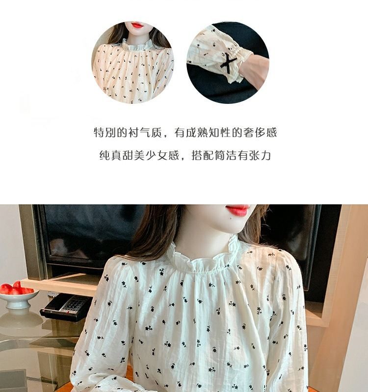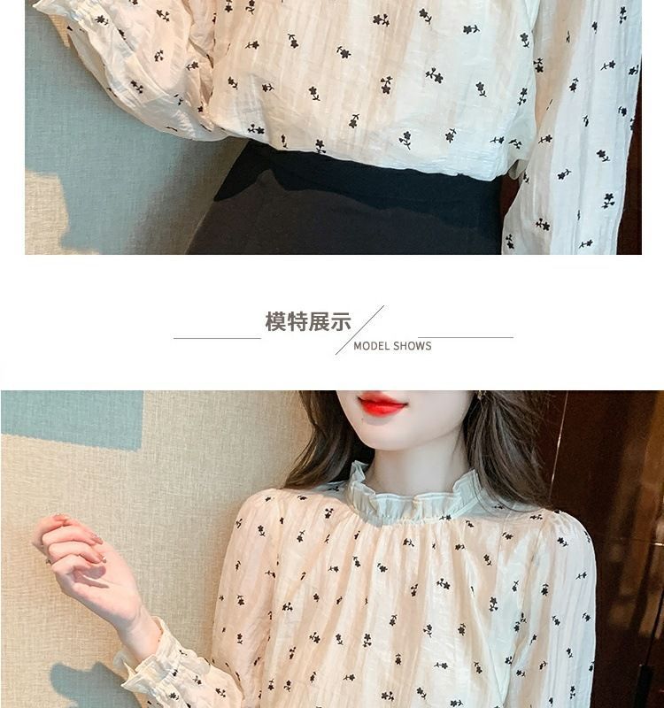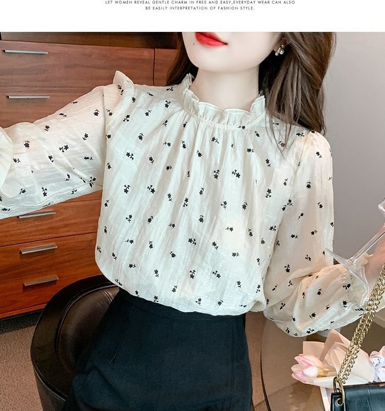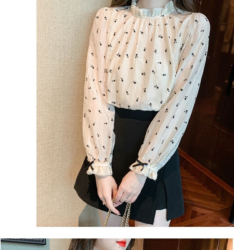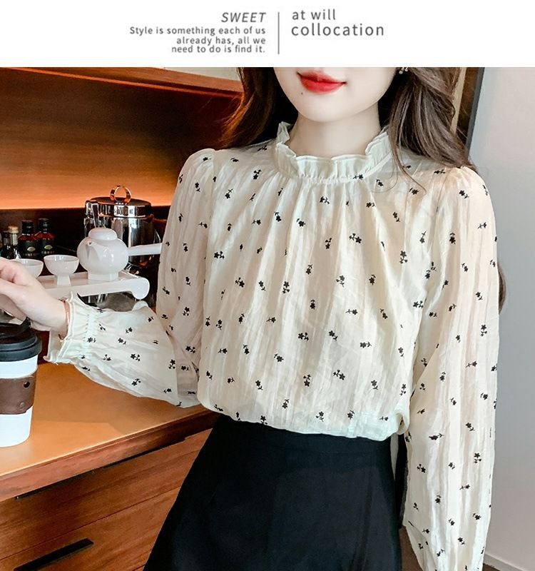 Весенне-осенняя женская рубашка во французском стиле, приталенная, с цветочным принтом, с воротником-стойкой, универсальная, с длинным рукавом, элегантная.