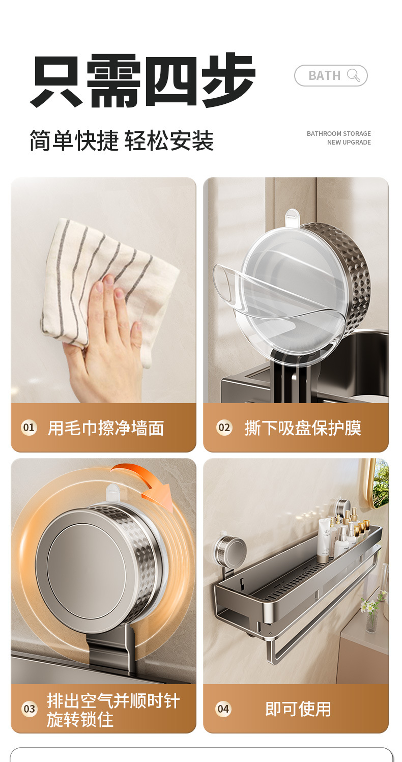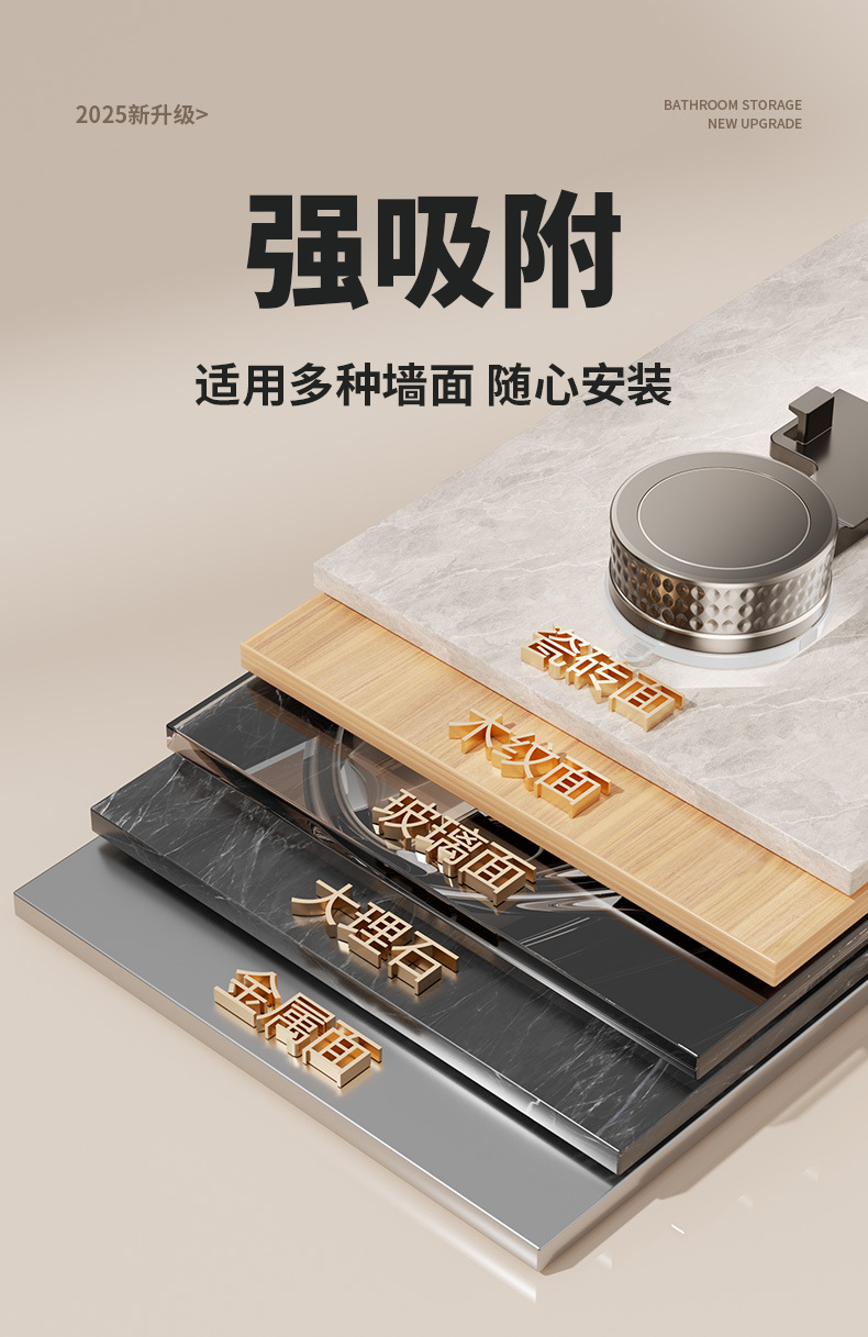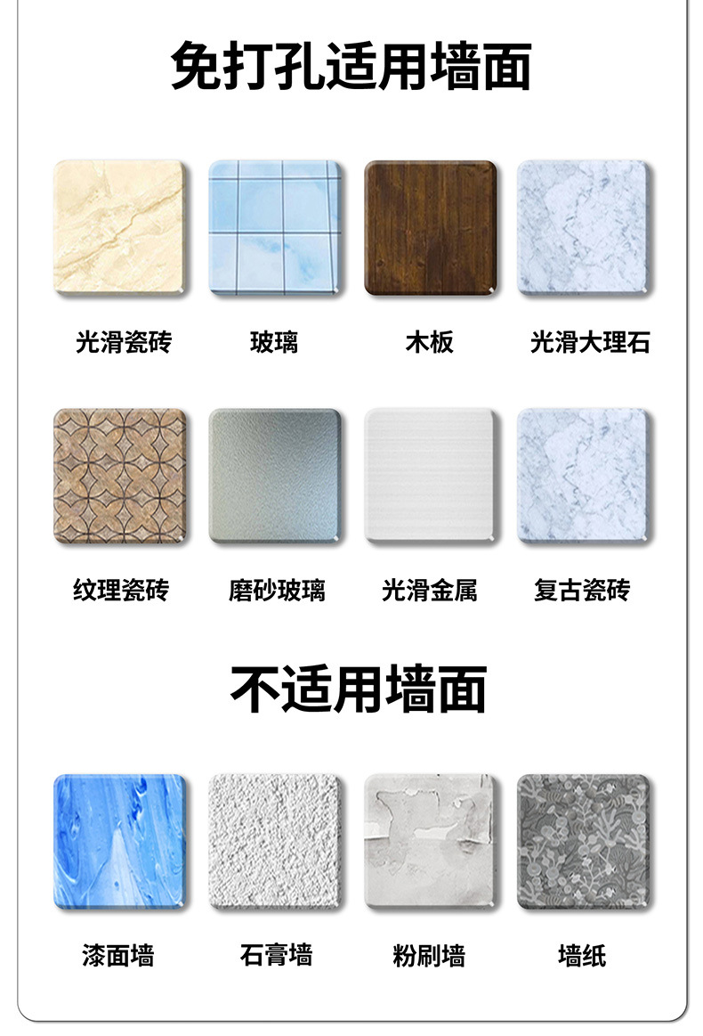 (2)安装请注意,墙面需是平整坚固光滑的玻璃瓷砖等。不可用在粉刷墙,墙纸,石灰墙等不平整不坚固的墙面上。
