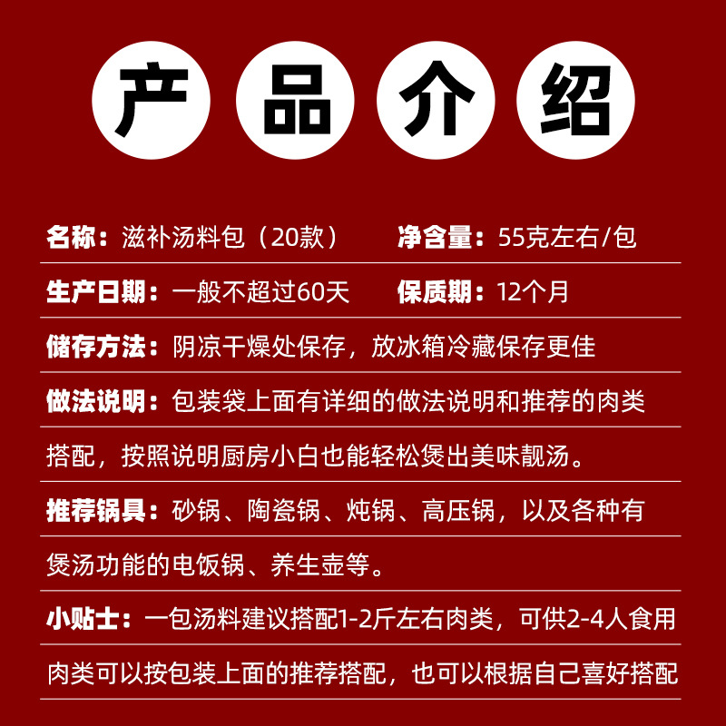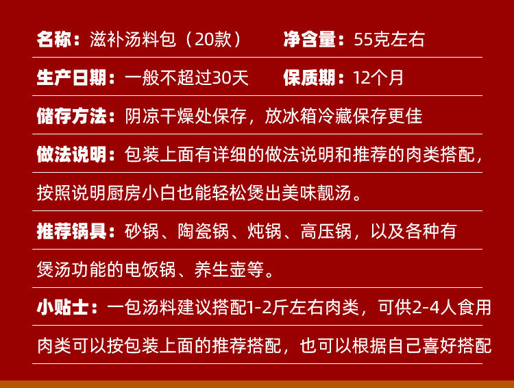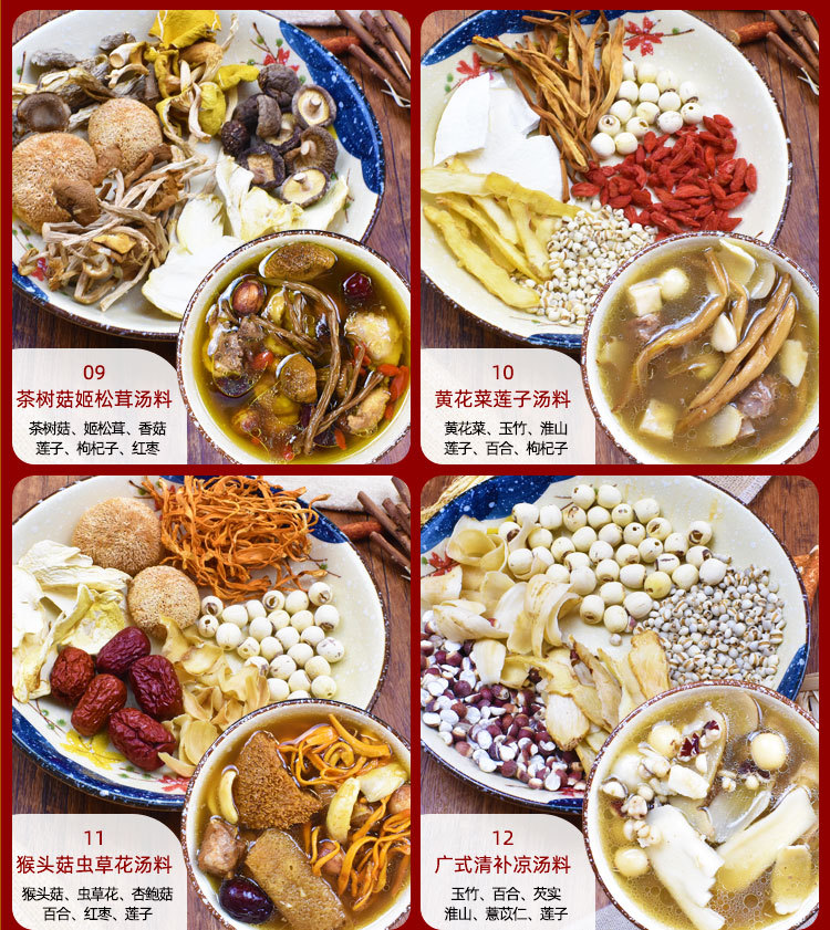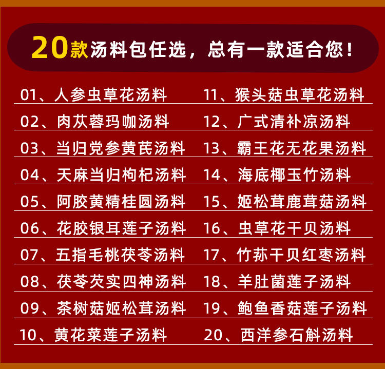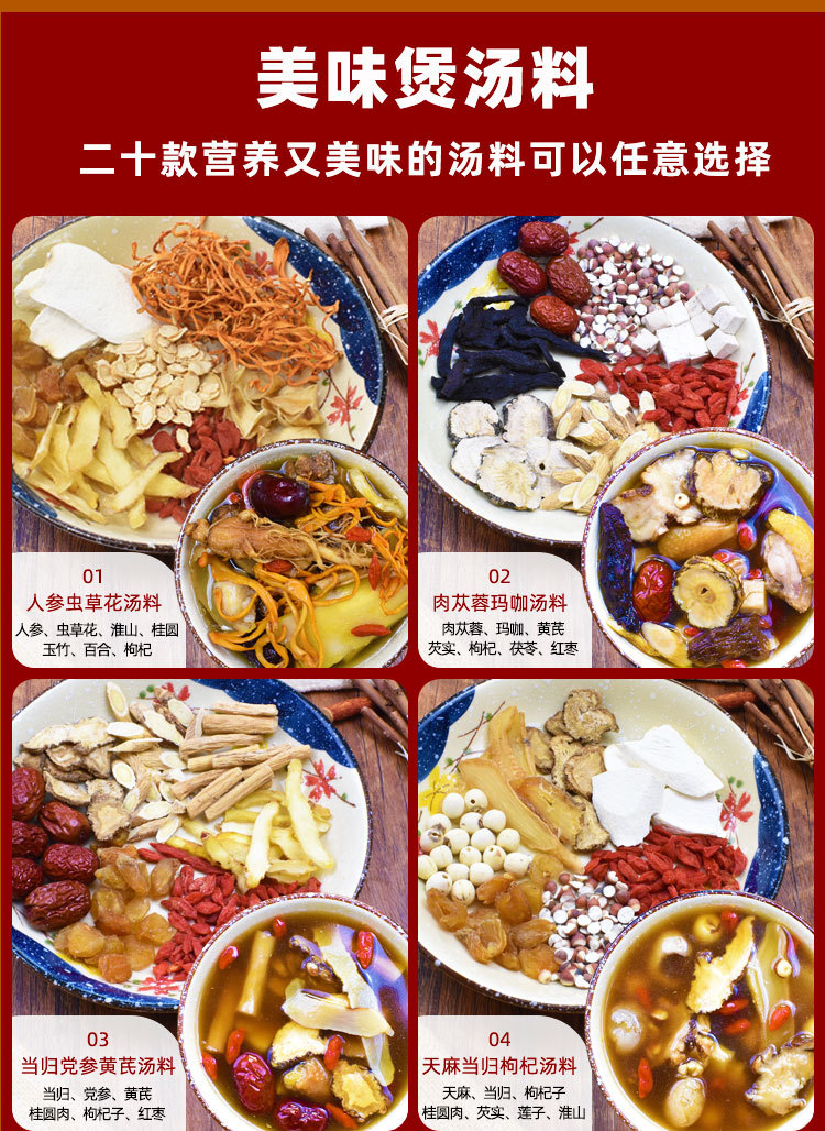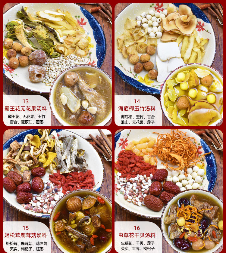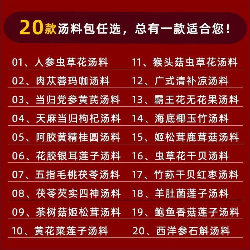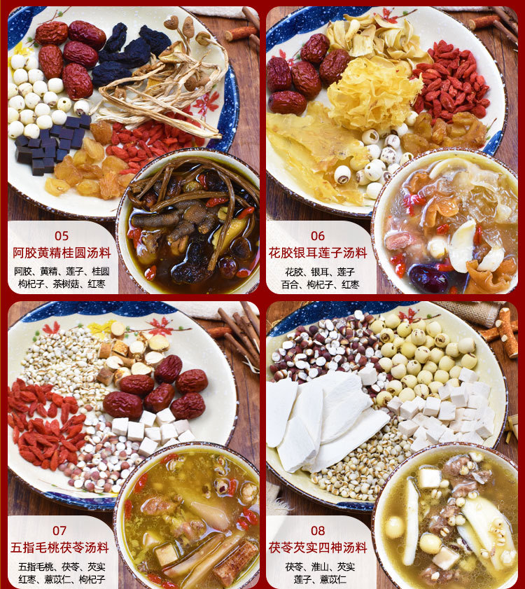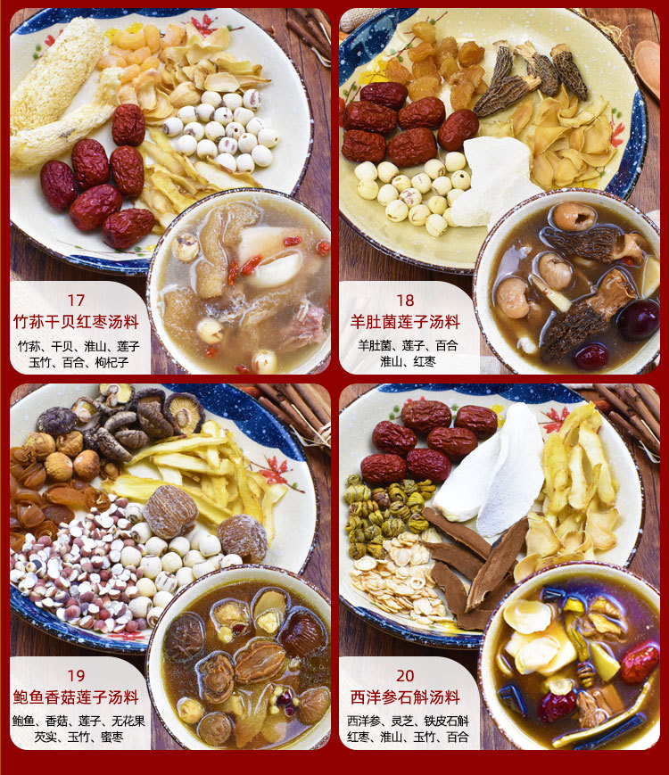 01. Цветочный суп с женьшенем и кордицепсом 53 г; 02. Суп Cistanche Deserticola и мака 63г.; 03. Смесь для супа с данггуи, кодонопсисом и астрагалом, 46 г; 04. Суп из гастродии, дудника и ягод годжи 56г.; 05. Желатин из ослиной шкуры, желтая эссенция и суп лонган 53г.; 06. Суп из рыбьей пасти, белых грибов и семян лотоса 48г.; 07. Суп «Пять пальцев» и тукхао 60г; 08. Суп Пория, Горгон и Сишень 60г; 09. Суп из грибов чайного дерева Agaricus blazei 48г; 10. Суп из ландышей и семян лотоса 50г.; 11. Цветочный суп Hericium cordyceps 55г.; 12. Освежающий суп в кантонском стиле 60г.; 13. Суп из инжира Баованхуа 55 г; 14. Суп из кокосового язу на морском дне 50г.; 15. Суп из грибов Agaricus blazei и бархатных рогов 48г.; 16. Суп из гребешков с цветками кордицепса 60г.; 17. Суп из бамбукового гриба, сушеных гребешков и красных фиников 51г.; 18. Суп из семян морелей и лотоса 62г.; 19. Суп из морского ушка, грибов шиитаке и семян лотоса 57г.; 20. Суп из американского женьшеня и дендробиума 57г.; 00. Индивидуальная формула (свяжитесь со службой поддержки клиентов)