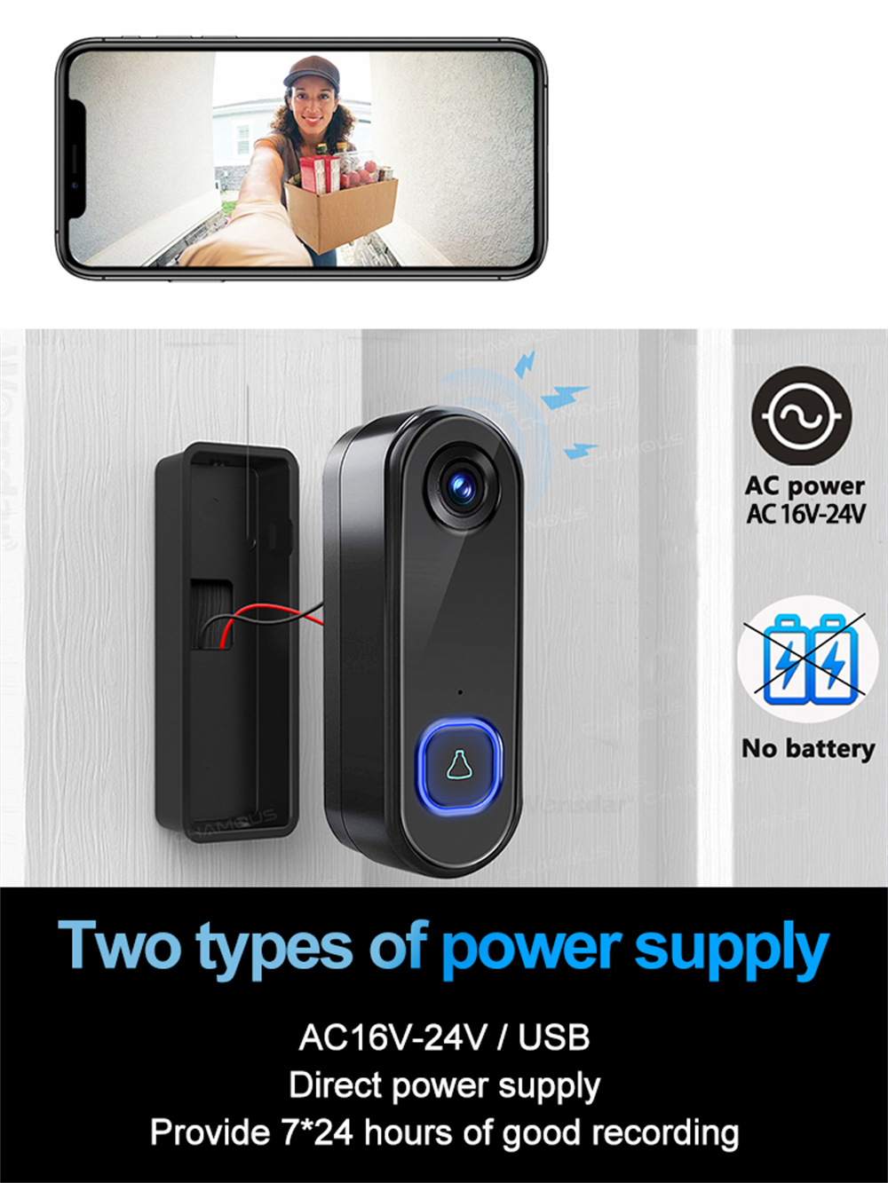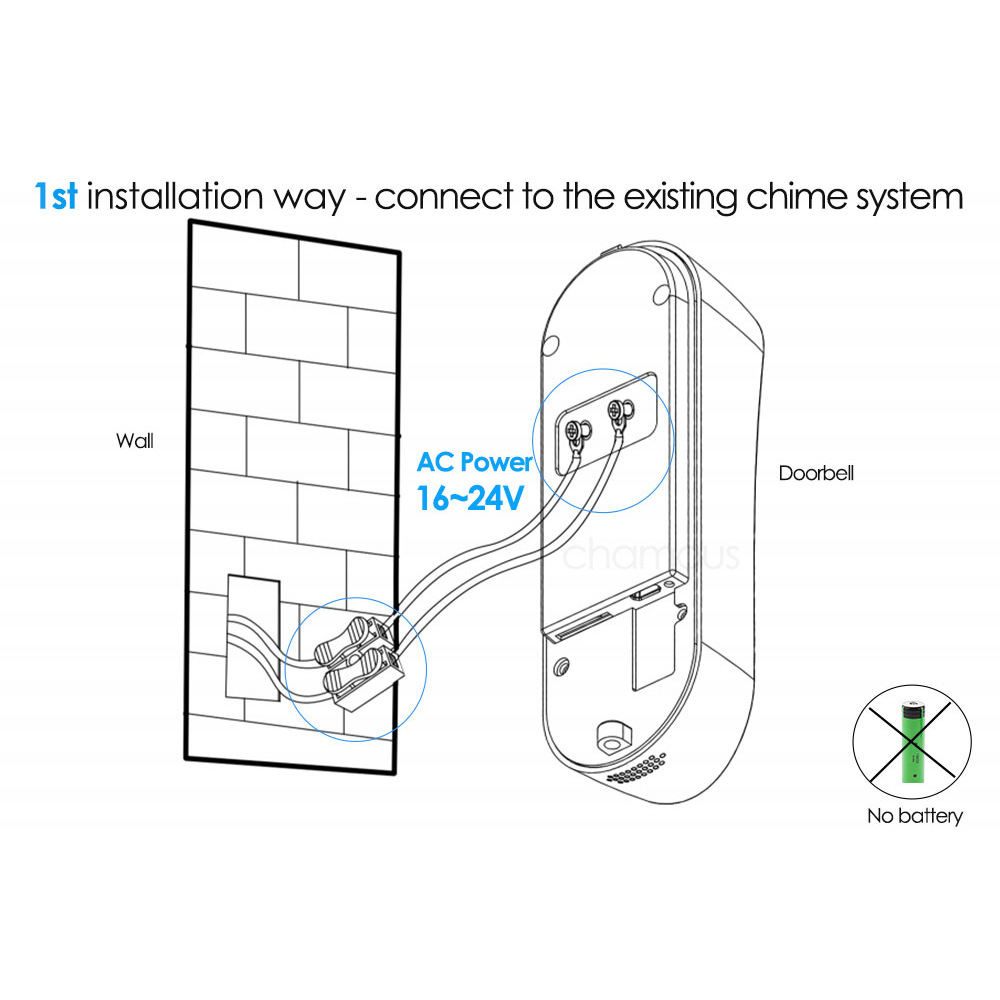 3[支持AC16V-24V电源安装]您可以将其连接到家用电源适配器。门铃有正极和负极连接线,可以根据说明进行安装。