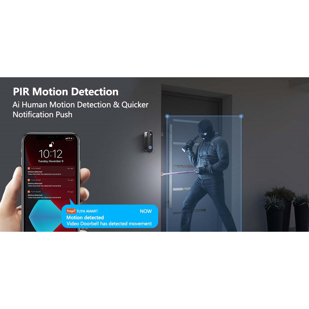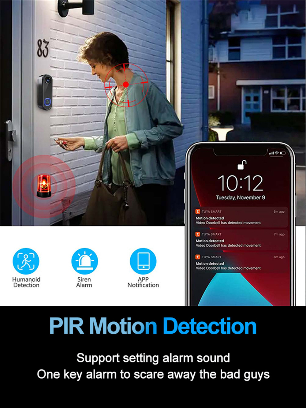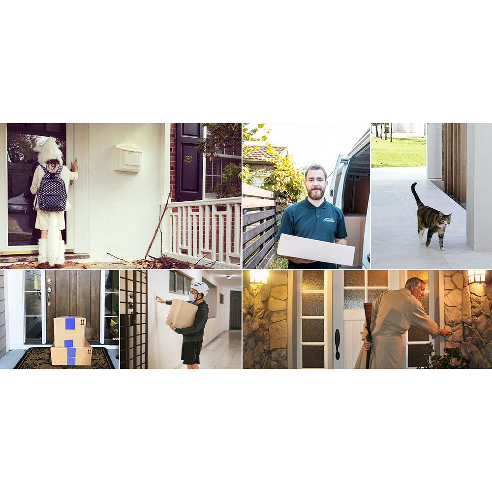 4[闹钟支持(音量可调)]您可以在门铃激活运动检测后打开闹钟,吓跑坏人或不速之客。您可以在应用程序中设置闹钟声音,以避免打扰邻居。