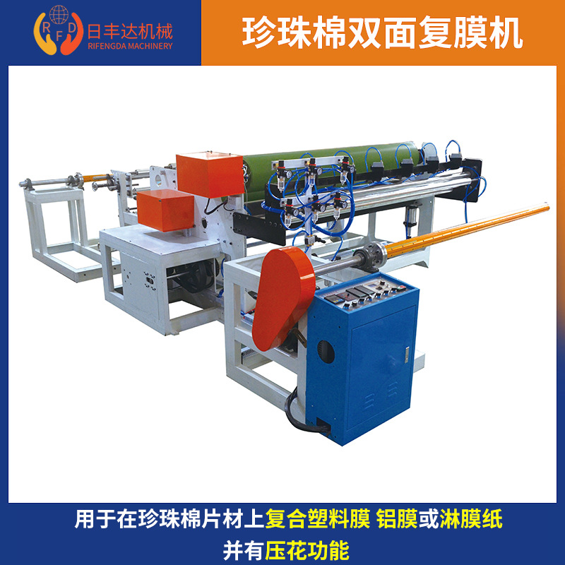珍珠棉复膜机可将EPE片材和薄膜或铝泊、纸张,通过电热辊加热融合成复合材料。该复合材料可以是压花材料,也可以是光面材料。