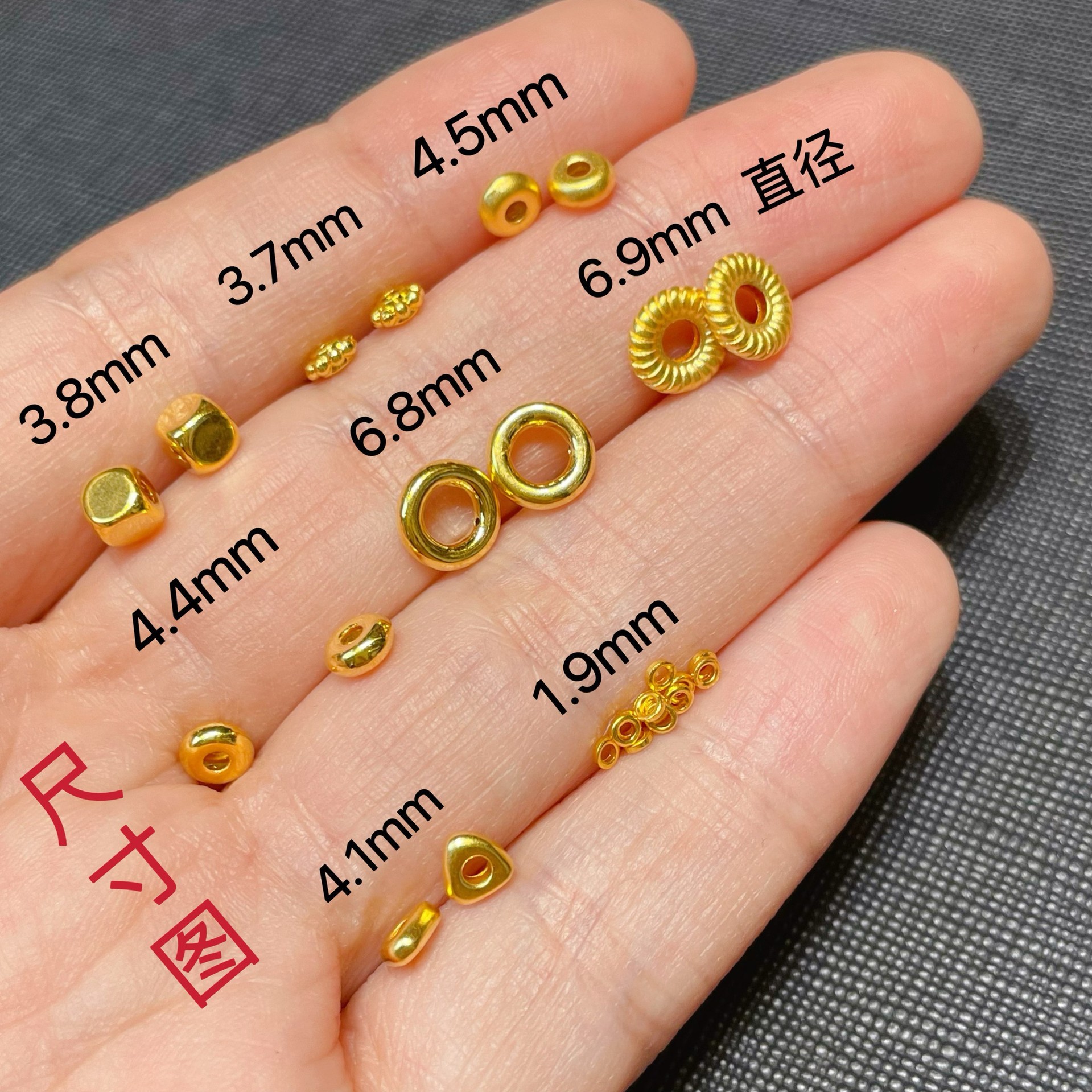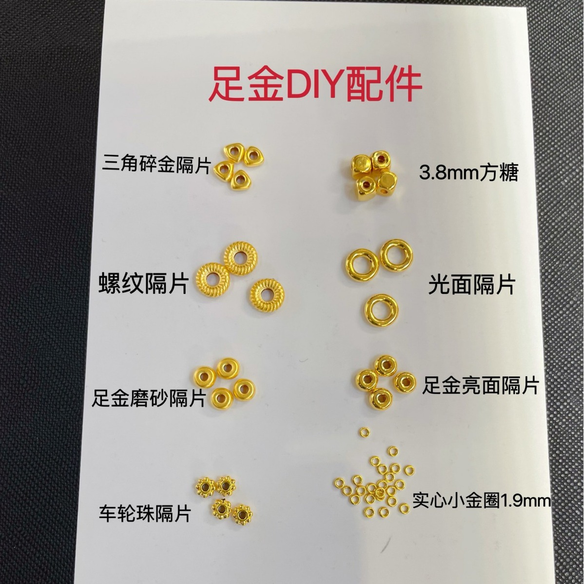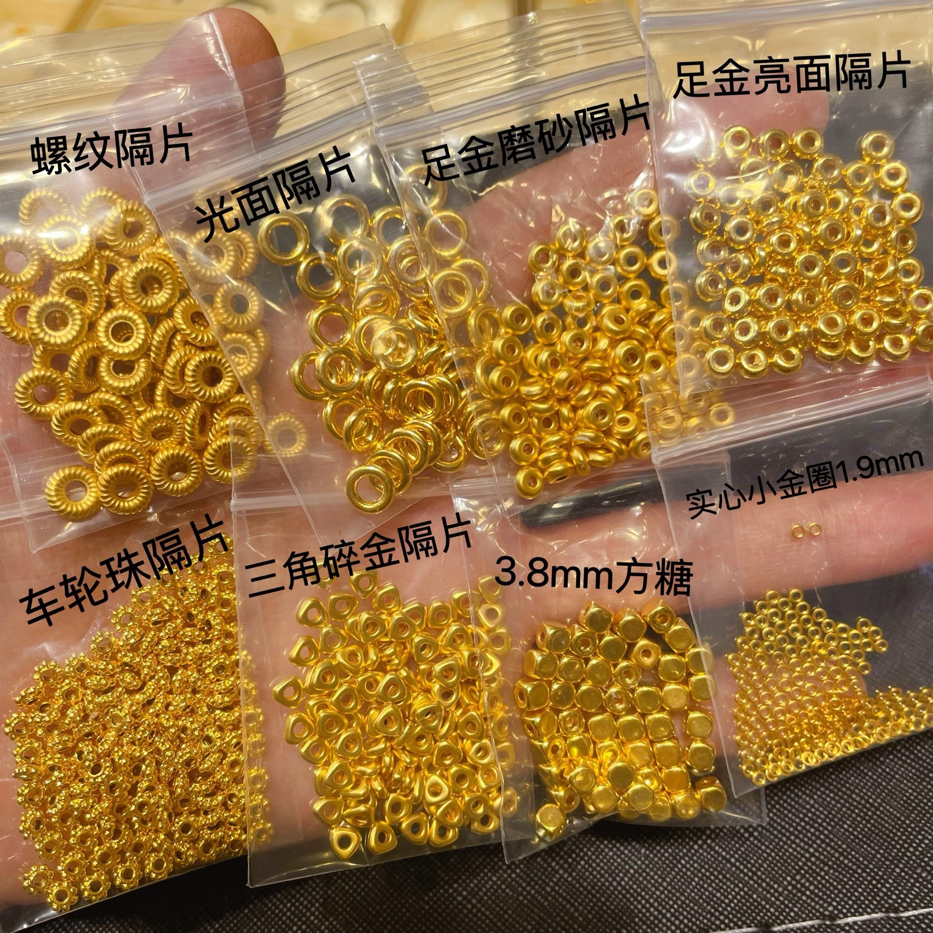 Проставка для колесных бусин из чистого золота составляет около 0,033 грамма.; Треугольные золотые хлопья имеют массу около 0,03 грамма.; Бусины из кубиков сахара диаметром 3,8 мм составляют около 0,1 грамма.; Расстояние между резьбами составляет около 0,075 грамма.; Глянцевая прокладка весит около 0,075 грамма.; Проставка из чистого золота с матовой поверхностью составляет около 0,042 грамма.; Глянцевая прокладка из чистого золота весит около 0,042 грамма.; Твердый маленький золотой круг 1,9 мм, около 0,22 г, 10 шт.; Бусины из кубиков сахара диаметром 4 мм составляют около 0,035 грамма.; Бусины из кубиков сахара диаметром 4 мм составляют около 0,052 грамма.