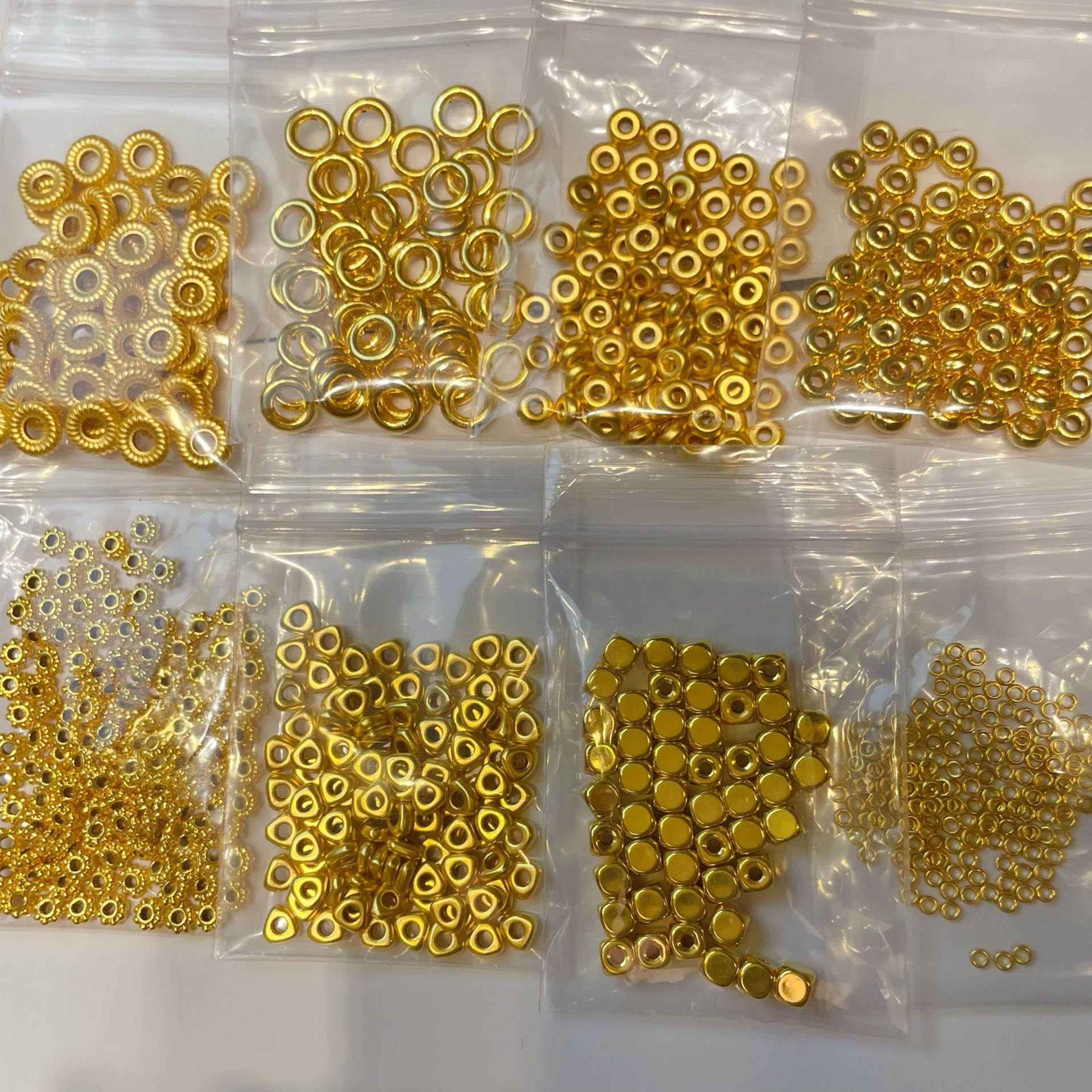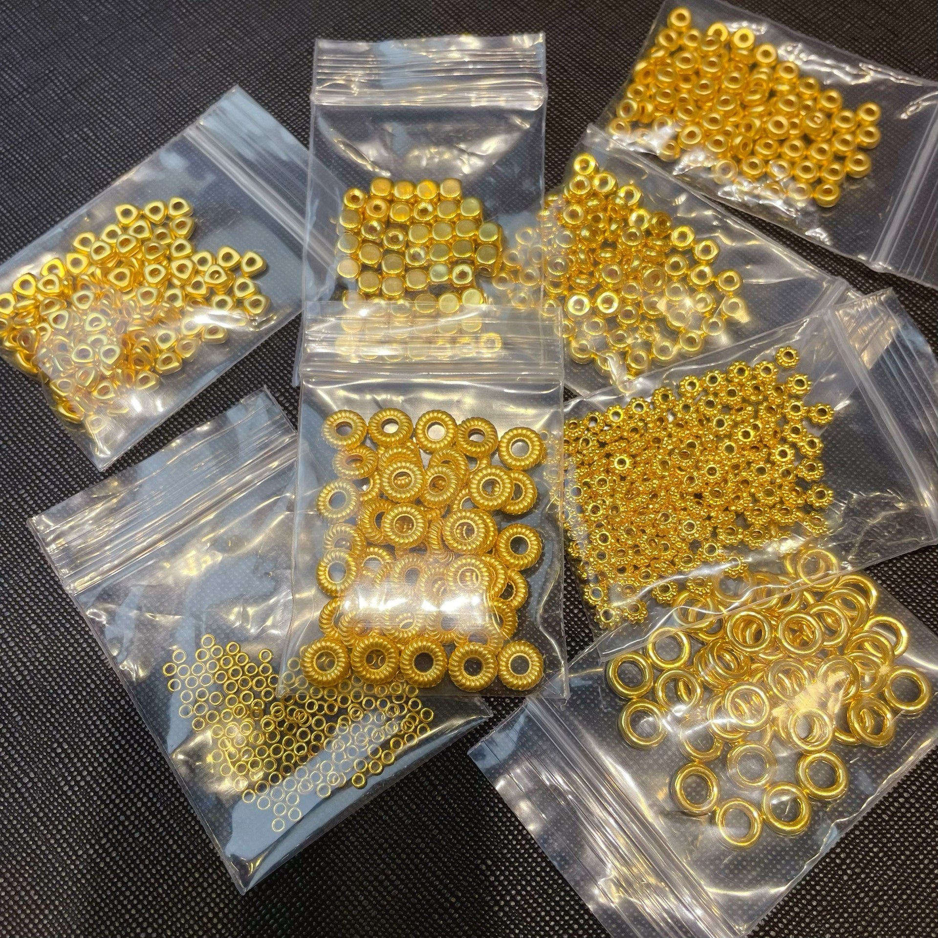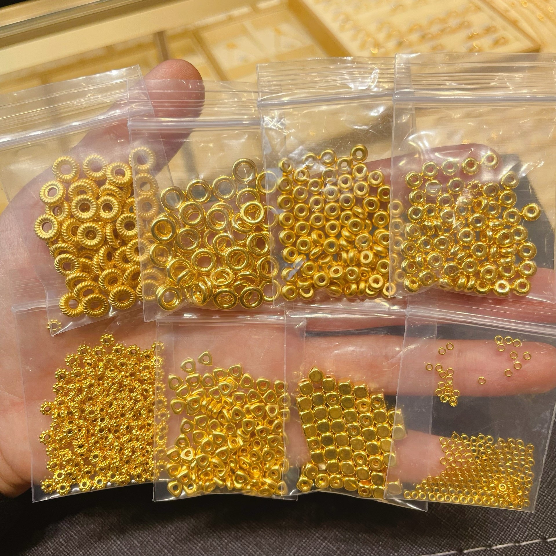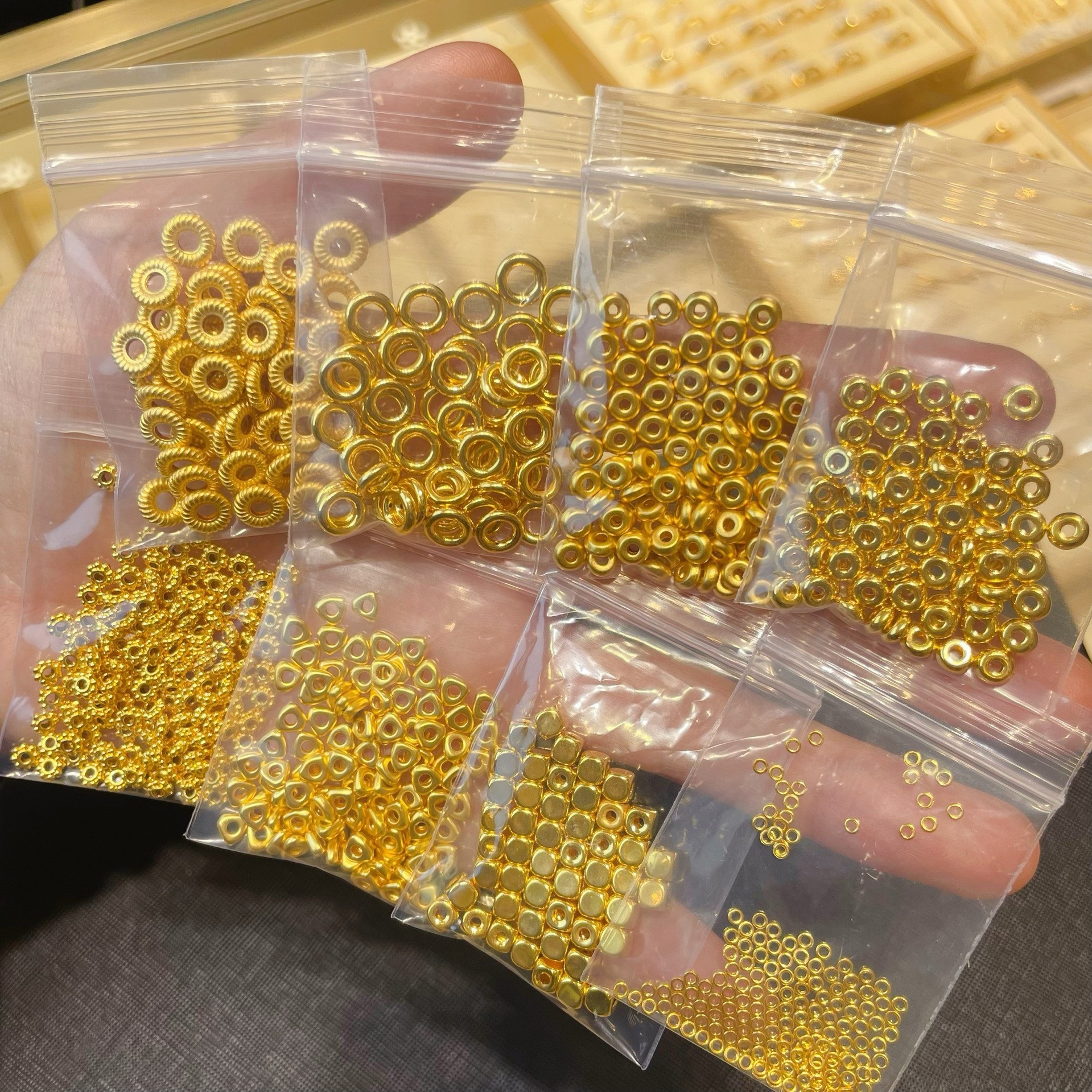 Проставка для колесных бусин из чистого золота составляет около 0,033 грамма.; Треугольные золотые хлопья имеют массу около 0,03 грамма.; Бусины из кубиков сахара диаметром 3,8 мм составляют около 0,1 грамма.; Расстояние между резьбами составляет около 0,075 грамма.; Глянцевая прокладка весит около 0,075 грамма.; Проставка из чистого золота с матовой поверхностью составляет около 0,042 грамма.; Глянцевая прокладка из чистого золота весит около 0,042 грамма.; Твердый маленький золотой круг 1,9 мм, около 0,22 г, 10 шт.; Бусины из кубиков сахара диаметром 4 мм составляют около 0,035 грамма.; Бусины из кубиков сахара диаметром 4 мм составляют около 0,052 грамма.