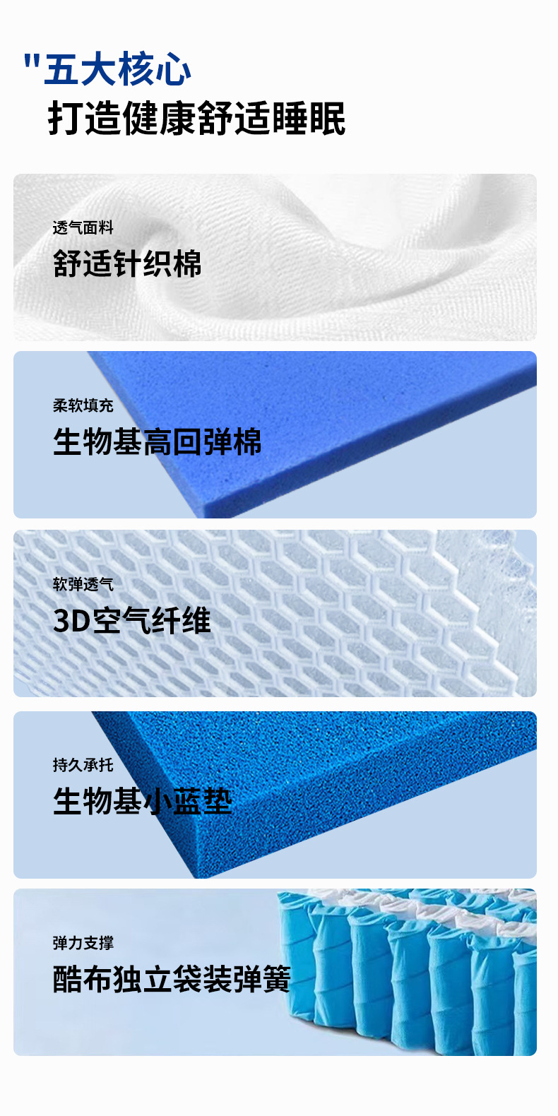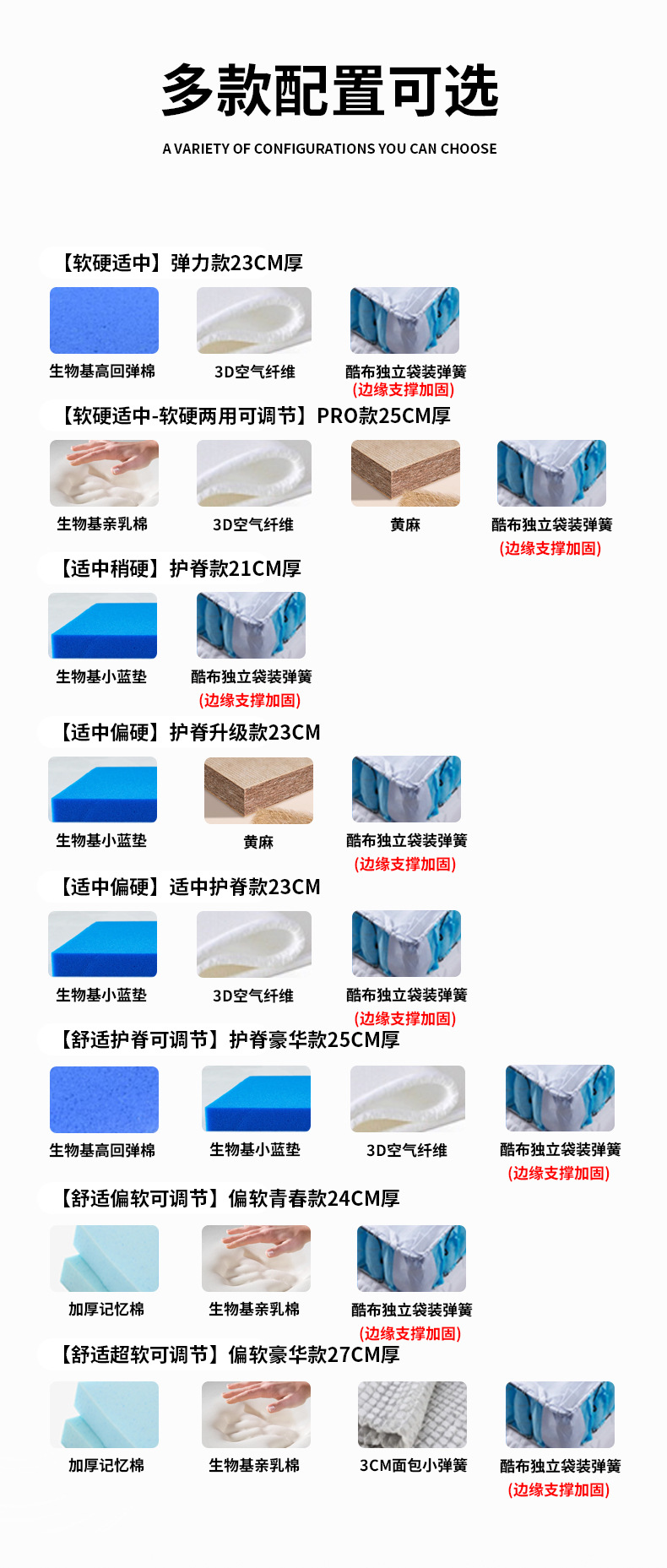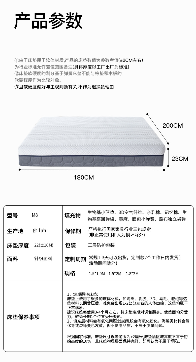Эластичная модель M8: умеренная мягкость и твердость - толщина 23 см [высокоэластичный хлопок на биологической основе + 3D + независимая пружина из прохладной ткани]; Модель M8Pro: регулируется как для мягкого, так и для жесткого использования - толщина 25 см [био-основанный хлопок для груди + 3D + независимая пружина из прохладной ткани + джут]; Модель защиты позвоночника M8: умеренная и слегка жесткая - толщина 21 см [маленькая синяя подушечка на биологической основе + независимая пружина из прохладной ткани]; Модель с улучшенной защитой позвоночника M8: от средней до жесткой - толщина 23 см [маленькая синяя подушечка на биологической основе + джут + независимая пружина из прохладной ткани]; Модель средней защиты позвоночника M8: умеренная и слегка твердая - толщина 23 см [маленькая синяя подушечка на биологической основе + 3D + независимая пружина из прохладной ткани]; Роскошная модель защиты позвоночника M8: удобная регулируемая защита позвоночника -25 см [высокоэластичный хлопок на биологической основе + 3D + маленькая синяя подушечка на биологической основе + независимая пружина из прохладной ткани]; Мягкая и молодежная модель M8: удобная и мягкая, регулируемая - толщина 24 см [пена с эффектом памяти с медленным отскоком + био-хлопок, благоприятный для груди + независимая пружина из прохладной ткани]; Мягкая роскошная модель M8: удобная, очень мягкая и регулируемая - толщина 27 см [пена с эффектом памяти с медленным отскоком + био-хлопок, приятный для груди + мини-пружина + независимая пружина из прохладной ткани]