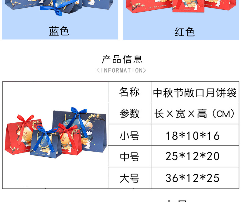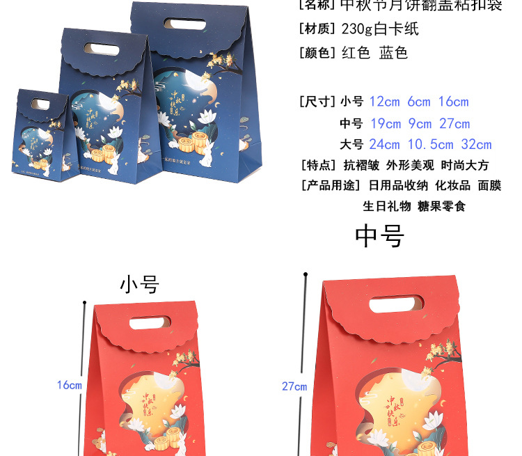 Сумка для лунного пирога с откидной крышкой, красная; откидная крышка, небольшой размер 12*6*16 см; Сумка для лунного пирога с откидной крышкой, красная; средний размер 19*9*27 см; Сумка для лунных пирожных с откидной крышкой, красная; большой размер с откидной крышкой: 24*10,5*32 см; Сумка для лунных пирожных с откидной крышкой, синяя; маленький размер 12*6*16 см; Сумка для лунных пирожных с откидной крышкой, синяя; средний размер 19*9*27 см; Сумка для лунных пирожных с откидной крышкой, синяя; большой размер с откидной крышкой: 24*10,5*32 см; Открытый пакет для красных лунных пирожных; размер: 18*10*16 см; Открытый пакет для красных лунных пирожных; средний размер 25*12*20 см; Открытый красный пакет для лунных пирожных; большой размер 36*12*25 см; Открытый пакет для лунных пирожных синего цвета; размер: 18*10*16 см.; Открытый пакет для лунных пирожных синего цвета; средний размер 25*12*20 см; Открытый синий пакет для лунных пирожных; большой размер 36*12*25 см