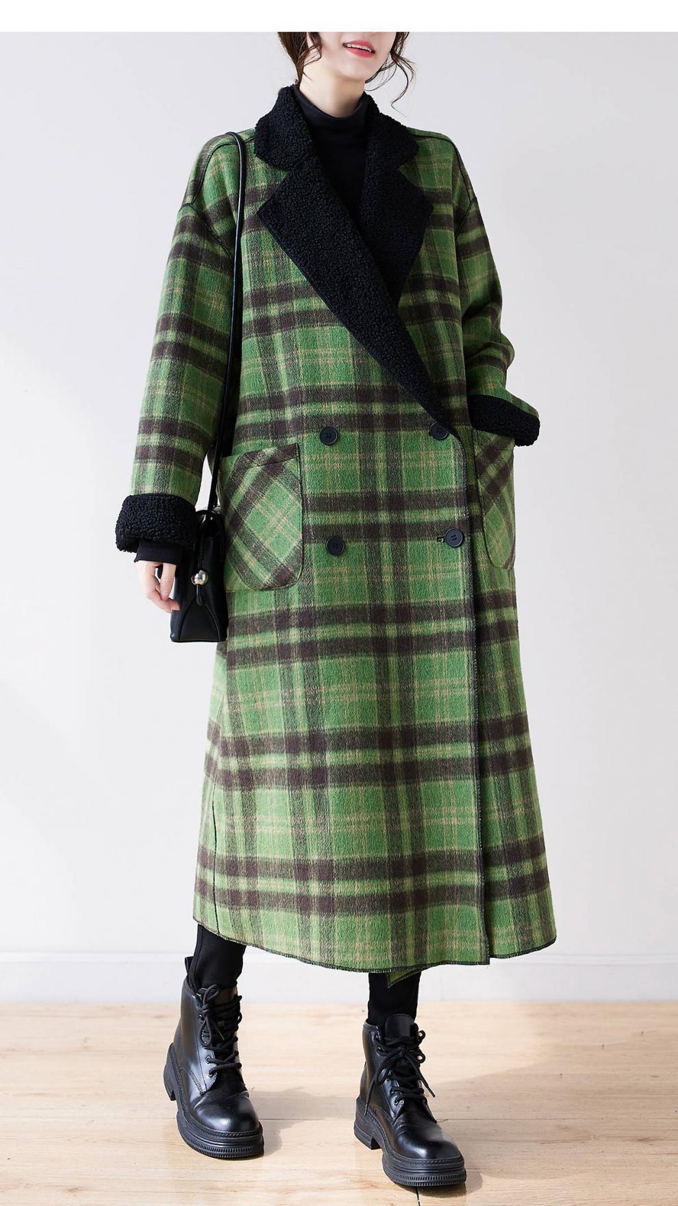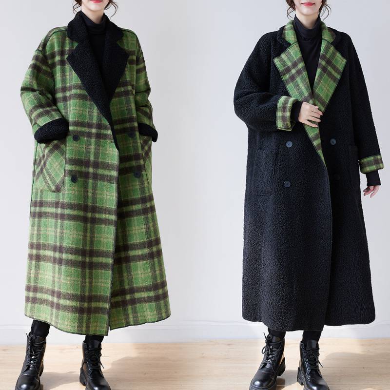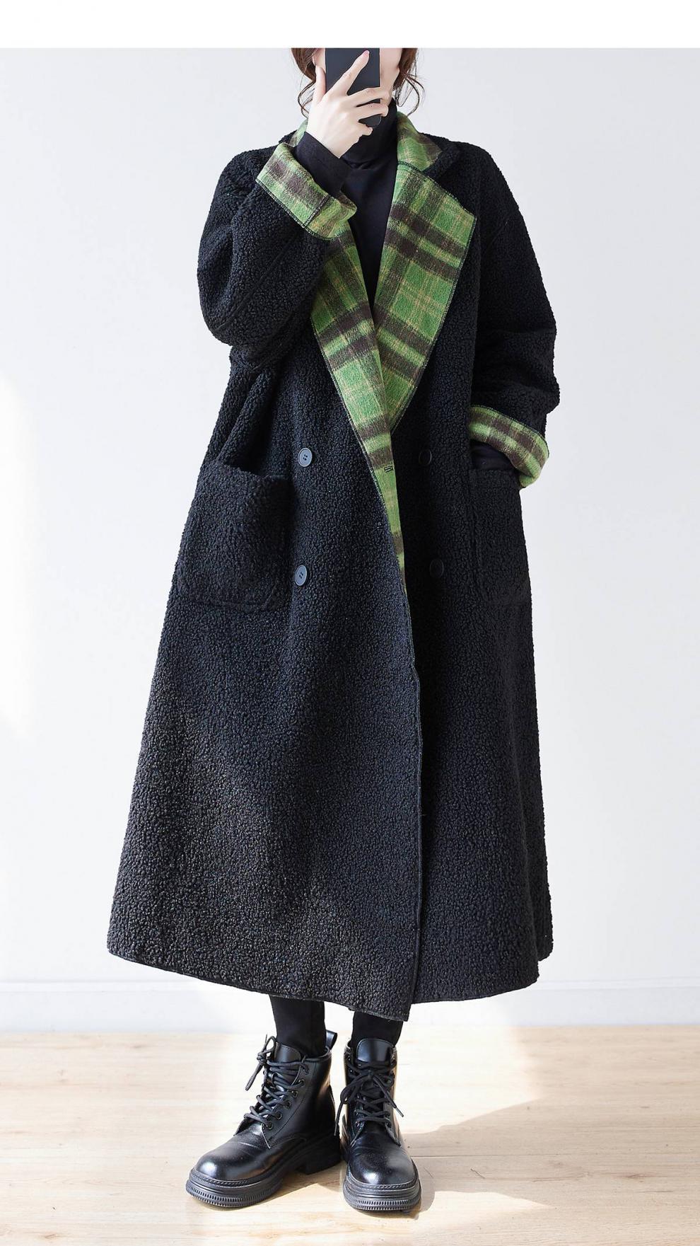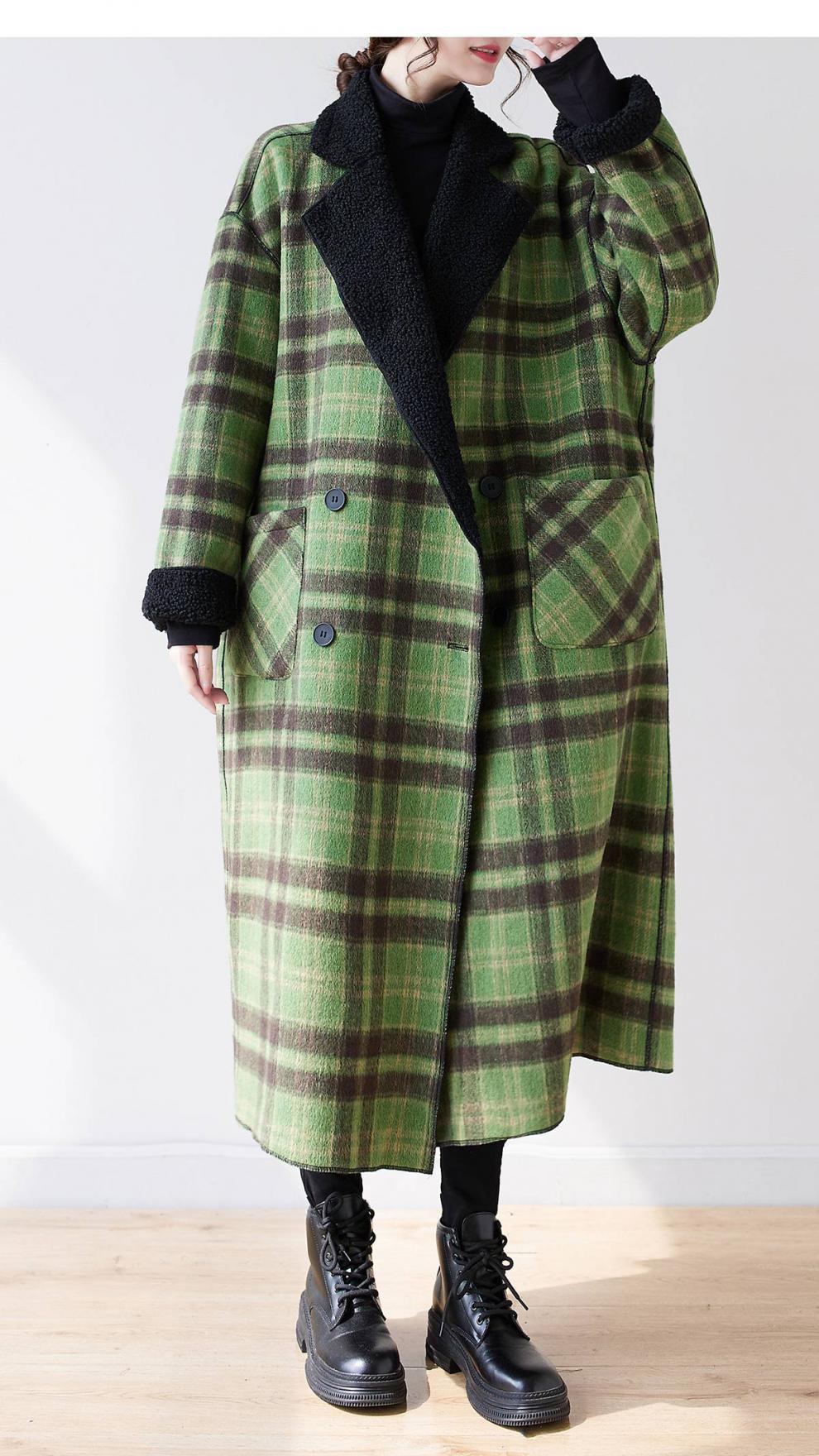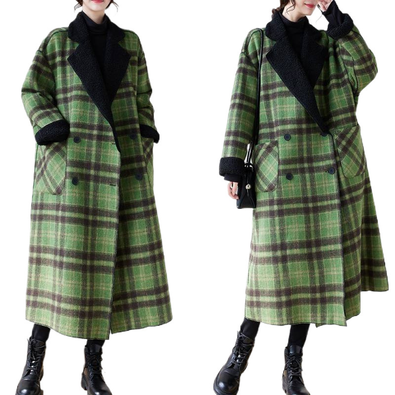 Женская зимняя одежда больших размеров, двустороннее длинное свободное пальто в клетку из овечьей шерсти на флисовой подкладке и утолщенное.