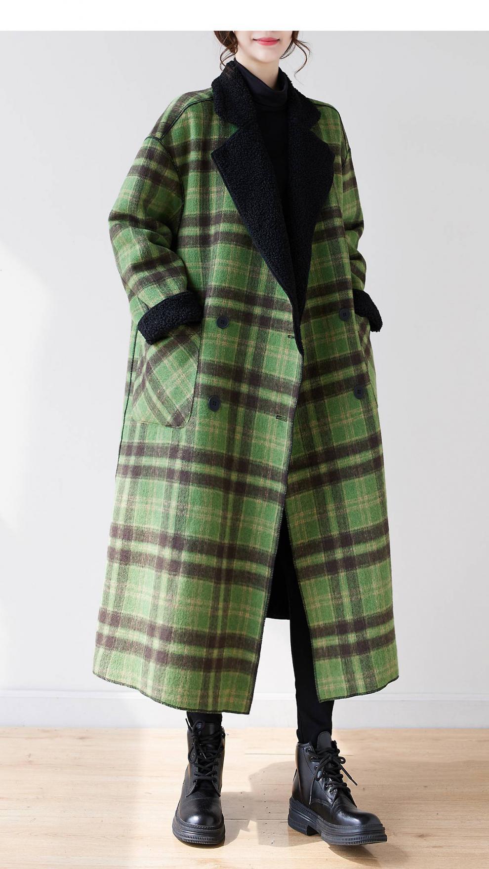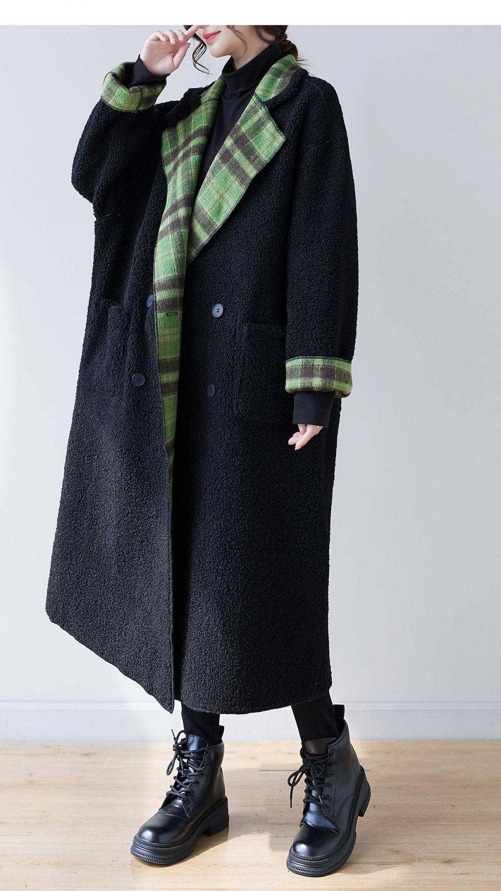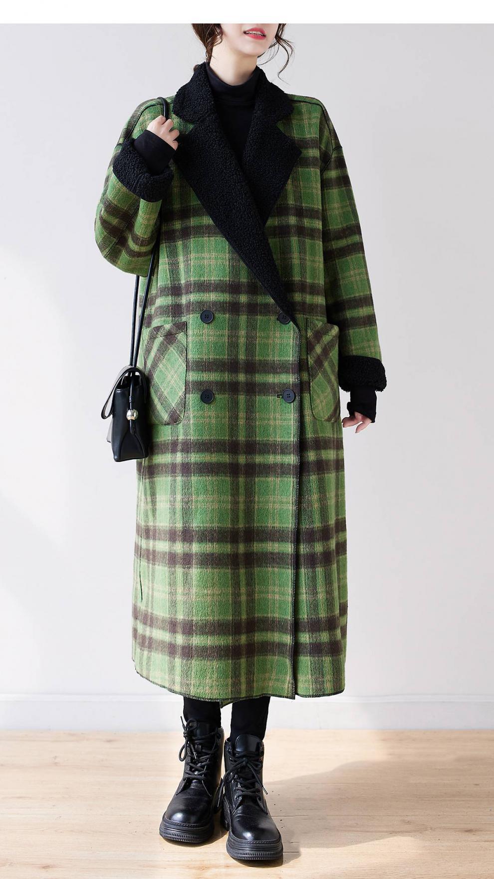 Женская зимняя одежда больших размеров, двустороннее длинное свободное пальто в клетку из овечьей шерсти на флисовой подкладке и утолщенное.