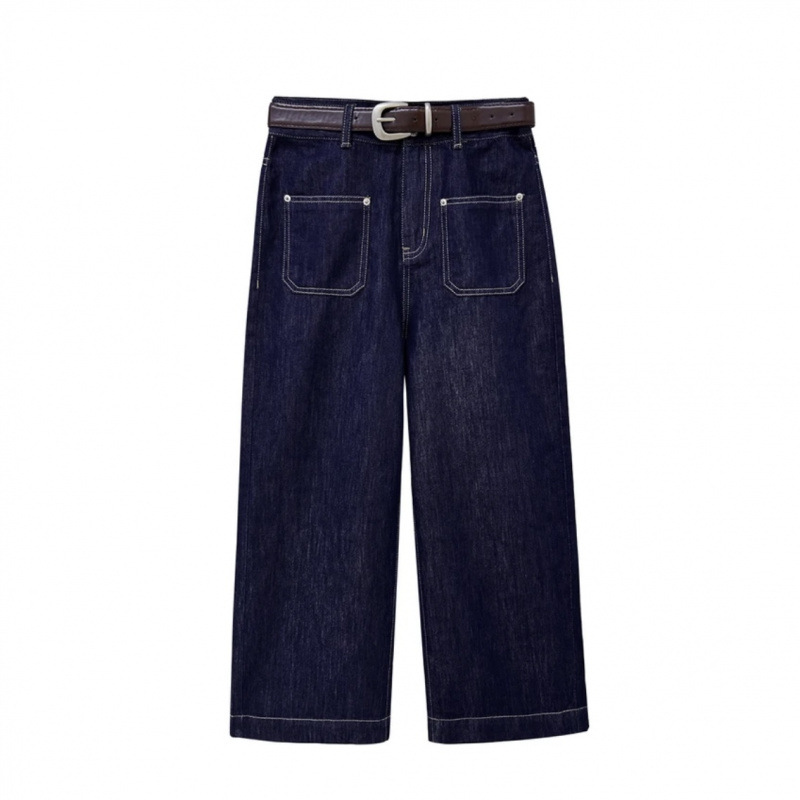 Топ в красную полоску с синей биркой; синие джинсовые брюки; Топ в полоску с синим воротником + синие джинсовые брюки