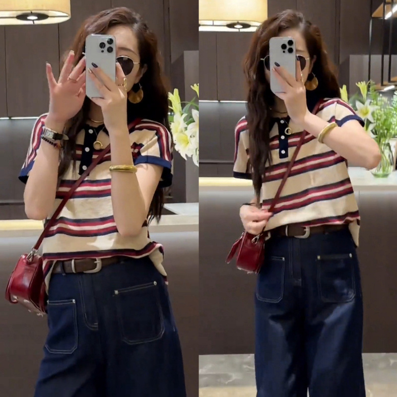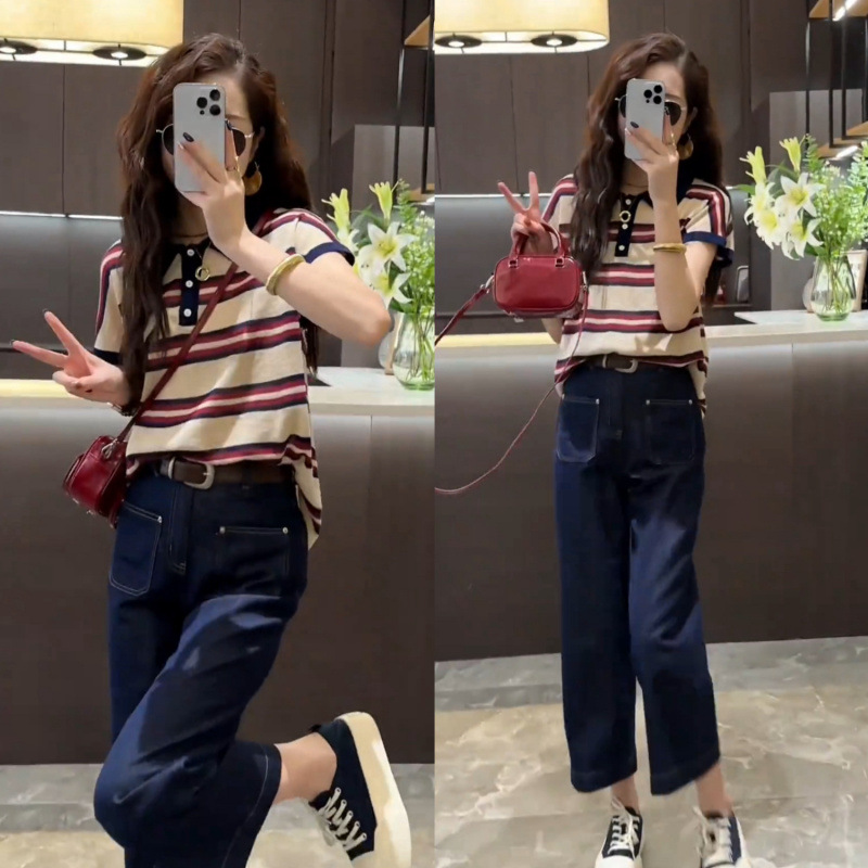 Летний дизайн 2025 года: комплект из прямых джинсов чистого цвета и полосатого поло с коротким рукавом