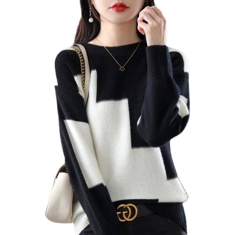 Новый трансграничный годовый распродажа ~ Счетный возврат трикотажных топов с вырезанной этикеткой, женских хлопчатобумажных рубашек для внешней торговли, базовых свитеров с цветными блоками.