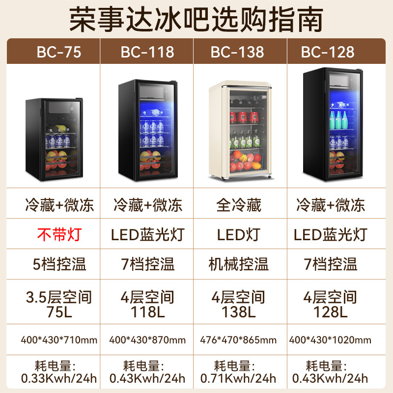 50 л (полностью охлажден + светодиодная подсветка + энергоэффективность уровня 1); 75 л (холодильник + энергоэффективность уровня 1); 98 л (охлажденное + слегка замороженное + энергоэффективность уровня 1); 118л (холодильник + слегка замороженный + LFD свет + энергоэффективность уровня 1); 138л (холодильник + слегка замороженный + светодиодная подсветка + замок + энергоэффективность уровня 1); 158л (охлаждение + слегка замороженное + светодиодная подсветка + замок + энергоэффективность уровня 1); 178 л (холодильник + слегка замороженный + светодиодная подсветка + энергоэффективность уровня 1); 198 л (холодильник + слегка замороженный + светодиодная подсветка + энергоэффективность уровня 1); 238 л (полностью охлажден + светодиодная подсветка + энергоэффективность уровня 1); Модель с цифровым дисплеем объемом 238 л (полностью охлажден + светодиодная подсветка + энергоэффективность уровня 1); 258 л (полностью охлажден + светодиодная подсветка + энергоэффективность уровня 1); Модель с цифровым дисплеем объемом 258 л (полностью охлажден + светодиодная подсветка + энергоэффективность уровня 1); Двойная дверь 118л (заморозка + охлаждение + светодиодная подсветка); Ретро-бар Dundun объемом 96 л (полностью охлажден + светодиодное освещение + энергоэффективность уровня 1); Ретро-бар Dundun объемом 118 л (полностью охлажден + светодиодное освещение + энергоэффективность уровня 1); Ретро-бар Dundun объемом 138 л (полностью охлажден + светодиодное освещение + энергоэффективность уровня 1); Ретро-бар Dundun объемом 198 л (полностью охлажден + светодиодное освещение + энергоэффективность уровня 1); Ретро-бар Dundun 218L (холодильник с заморозкой + светодиодная подсветка + энергоэффективность уровня 1); Ретро-бар Dundun объемом 238 л (холодильник с заморозкой + светодиодная подсветка + энергоэффективность уровня 1)