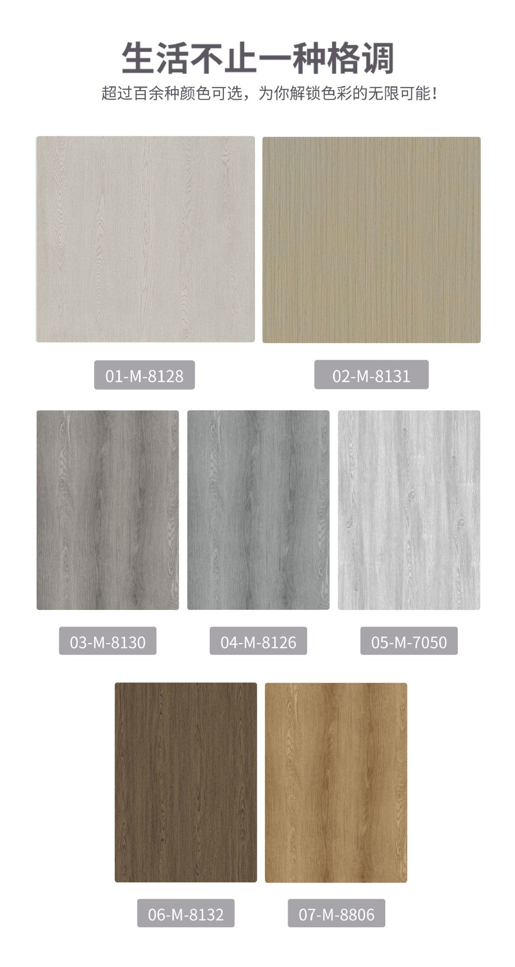 Белый (имитация древесины белого дуба); Бежевый (имитация европейского дуба); Бежевый (имитация европейского дуба); Желтый (имитация зерна европейского дуба); Коричневый (имитация древесного зерна джатобы); Коричневый (имитация зерна кофейного дуба); Коричневый (имитация европейского дуба); Коричневый (старинная текстура древесины Yisu); Коричневый (имитация древесины красного персика); Серый (имитация европейского дуба); Серый (имитация дымчатого дуба)