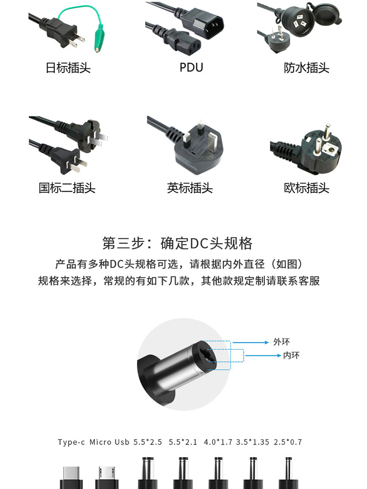 линия переменного тока; 9V3A; 12V2A; 12V3A; 12V4A; 12V5A; 12V6A; 12V7A; 12V8A; 12V10A; 12V12A; 12V15A; 12V16A; 12V20A; 12V12.5A; 14V2A; 15V4A; 18V3A; 19V4.74A; 20V3A; 20V5A; 20V7.5A; 24V1.5A; 24V2.5A; 24V2.75A; 24V3A; 24V4A; 24V5A; 24V6.25A; 24V8A; 24V10A; 24V12.5A; 30V10A; 36V5A; 48V5A; 48V2A; 54V4A; 54V5A; 56V5A