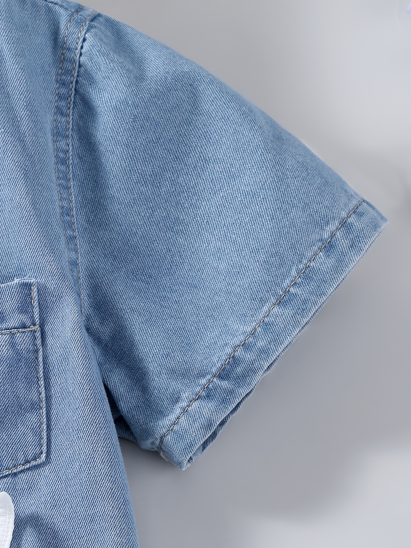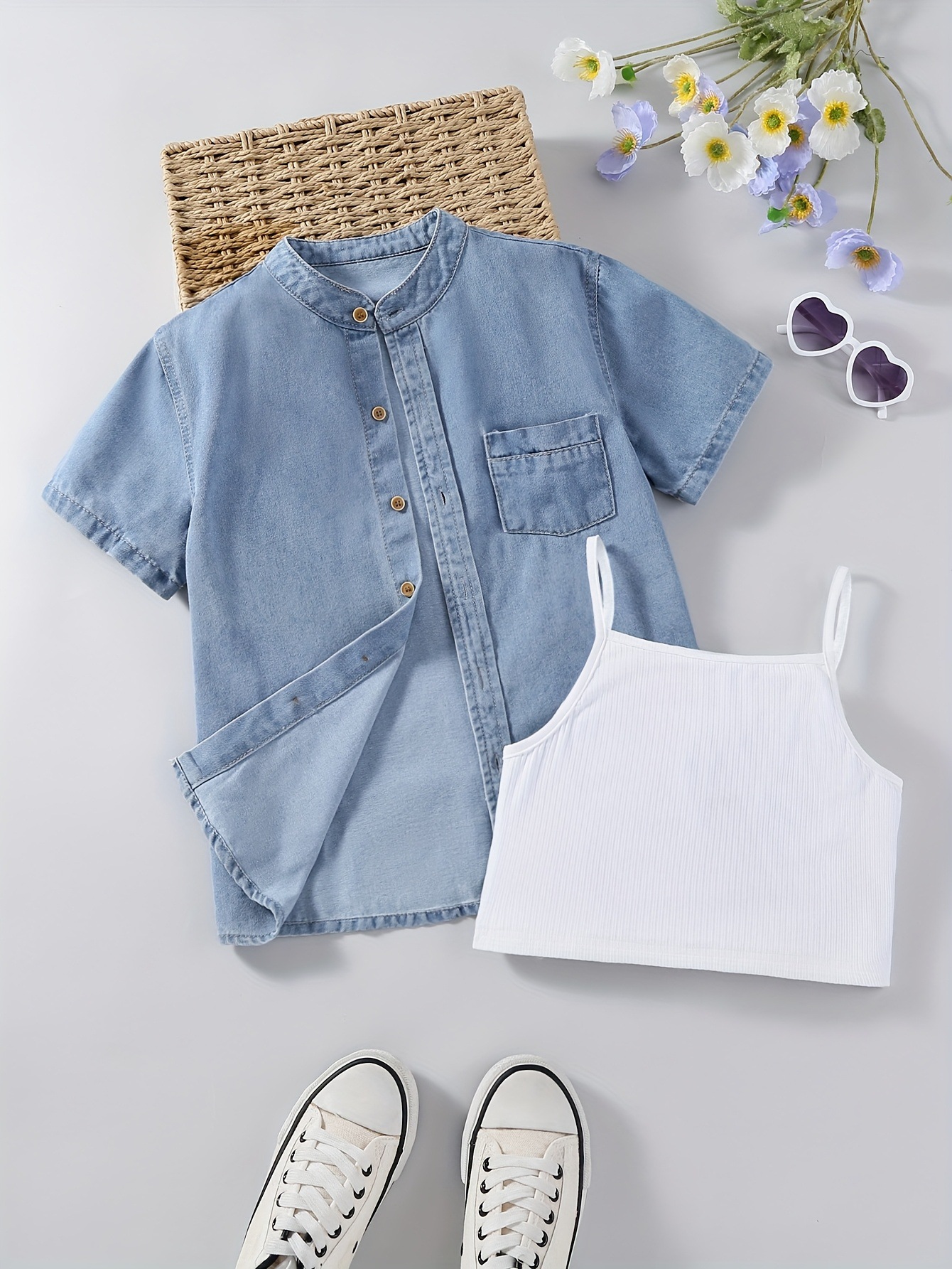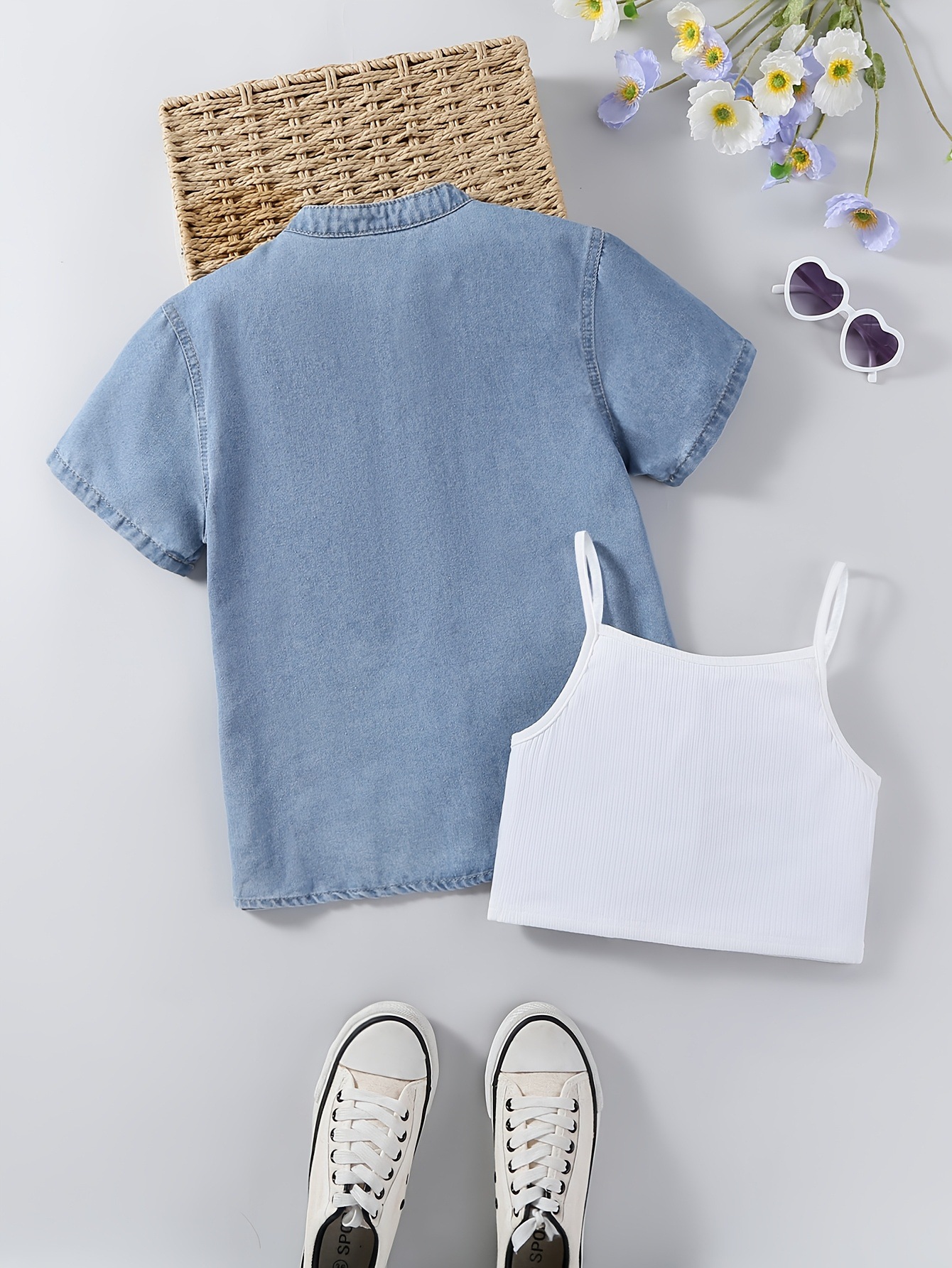 Летний комплект для девочек: топ-камзол с круглым вырезом и короткими рукавами, джинсовая куртка, модный многослойный двухсоставной набор