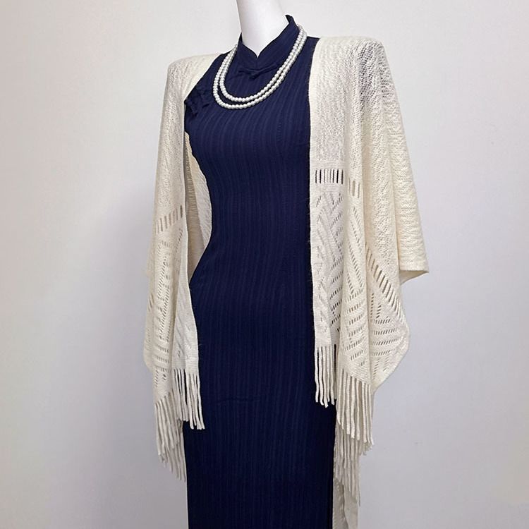 Темно-синий чонсам; Легкая шаль цвета хаки