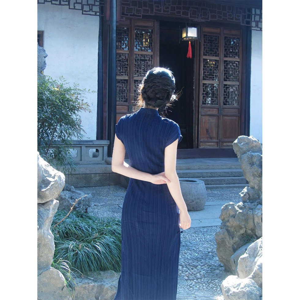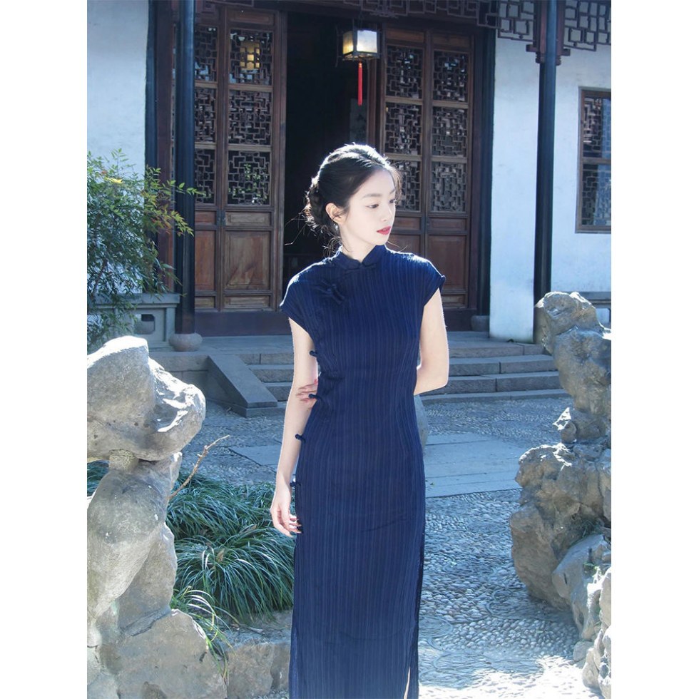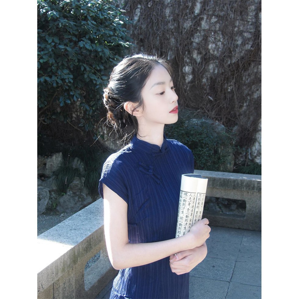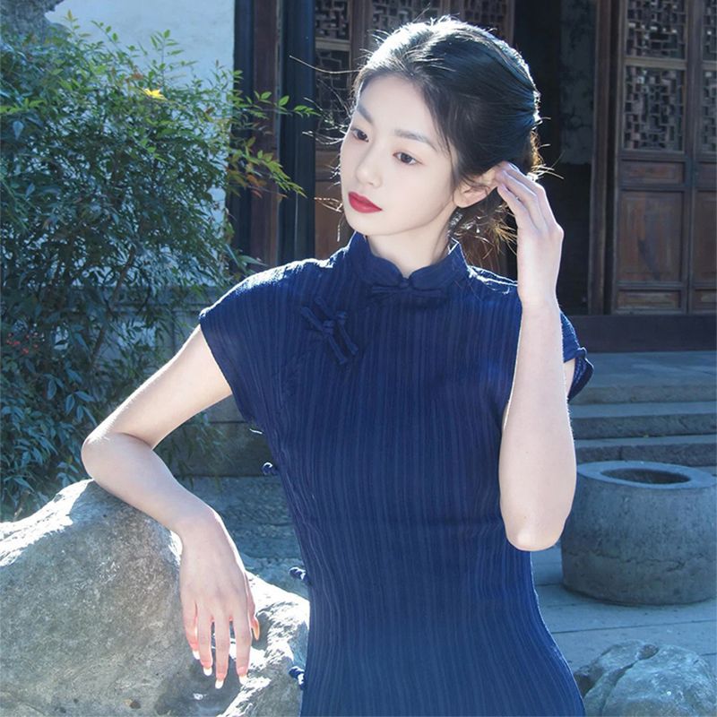 Новый китайский стиль потрясает темно-синий улучшенный чонсам женский летний 2025 ретро
