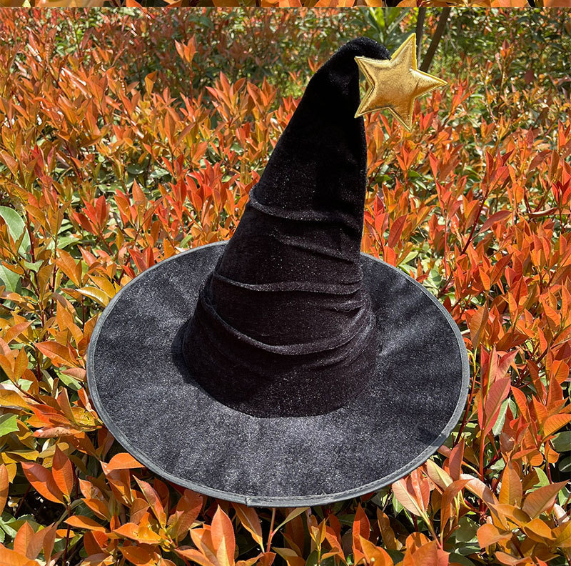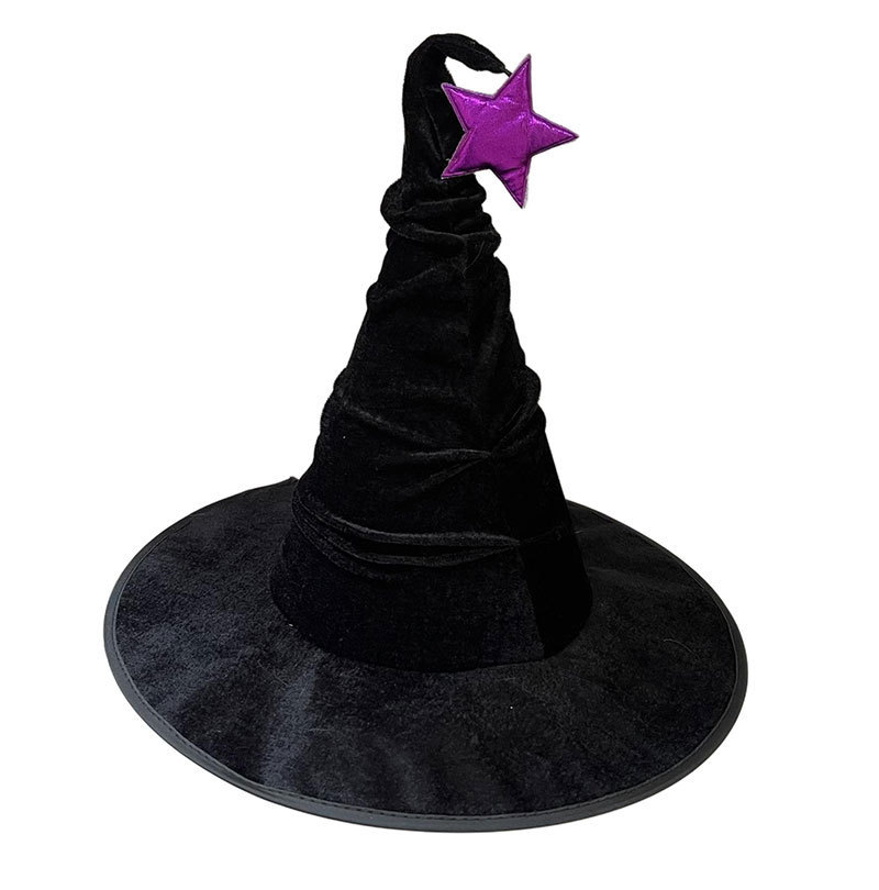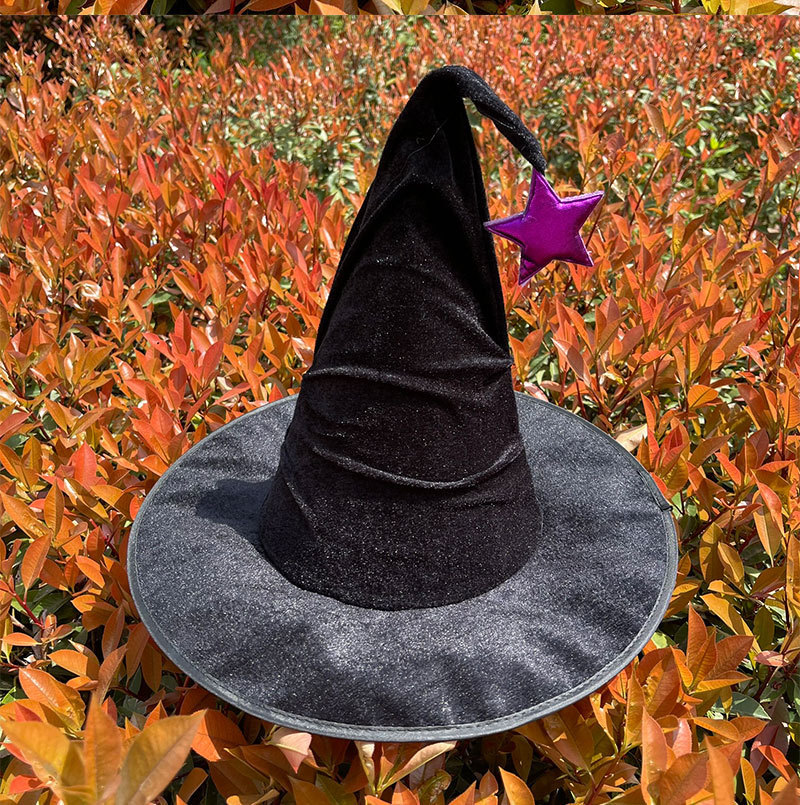 Гладкая бархатная мятая шляпа ведьмы; Бархатная мятая шляпа ведьмы: добавьте фиолетовую пятиконечную звезду; Бархатная мятая шляпа ведьмы: с оранжевой пятиконечной звездой; Гладкая бархатная мятая шляпа ведьмы: добавьте фиолетовую ленту; Бархатная мятая шляпа ведьмы: с украшениями в виде летучей мыши