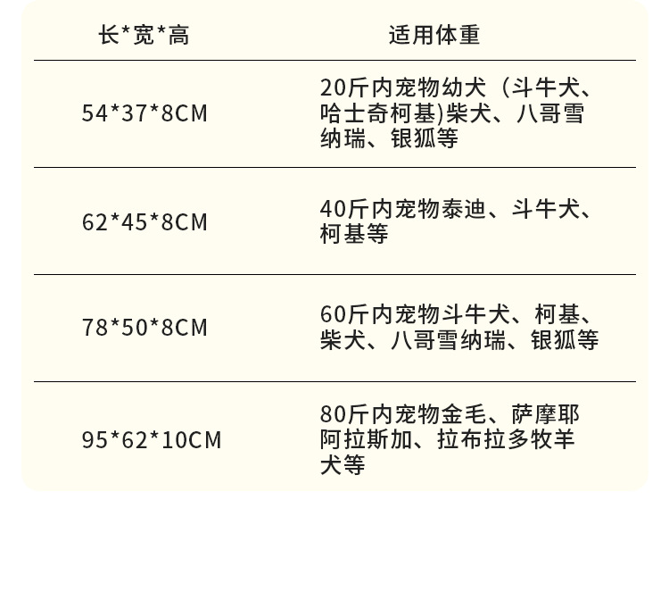 【54*37*8 см】Специально для щенков; 【61*45*8 см】Подходит для маленьких собак.; 【78*50*8 см】Подходит для собак среднего размера.; 【95*62*10 см】Подходит для средних и крупных собак.