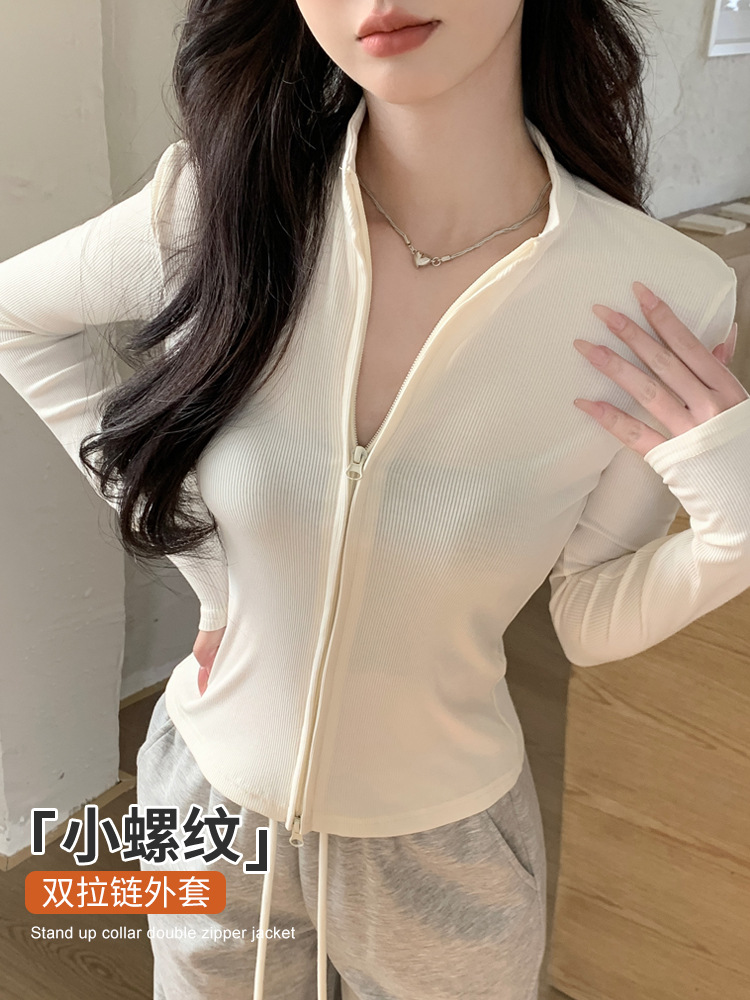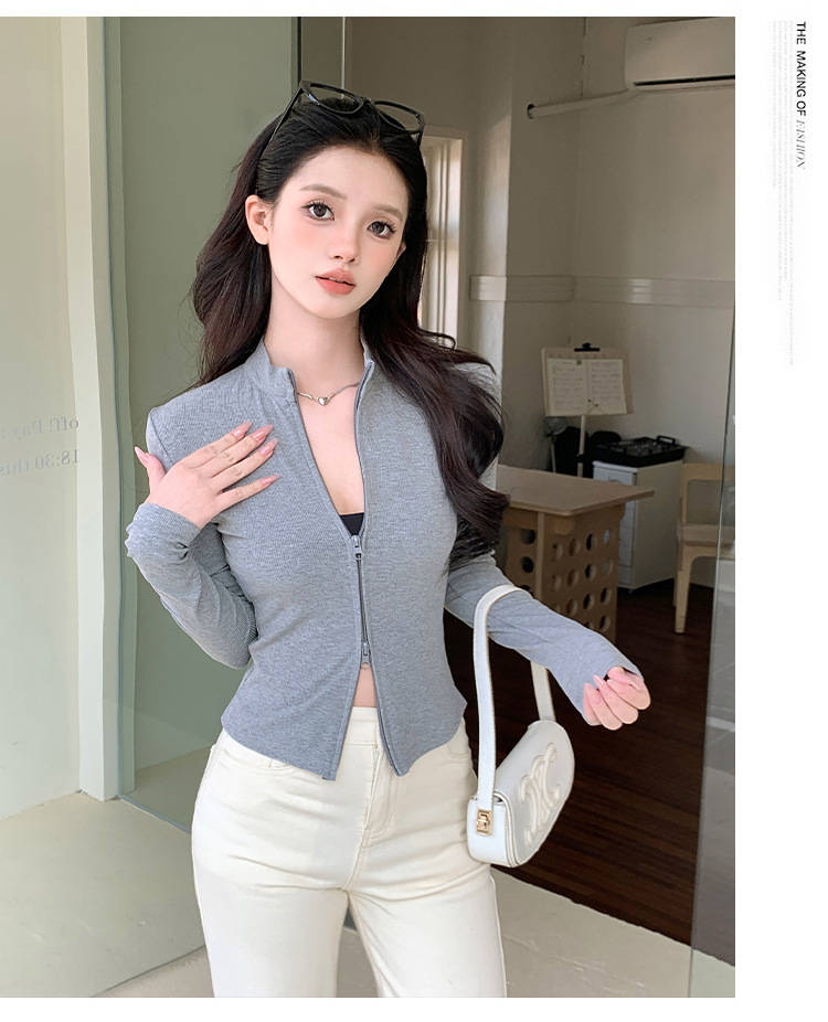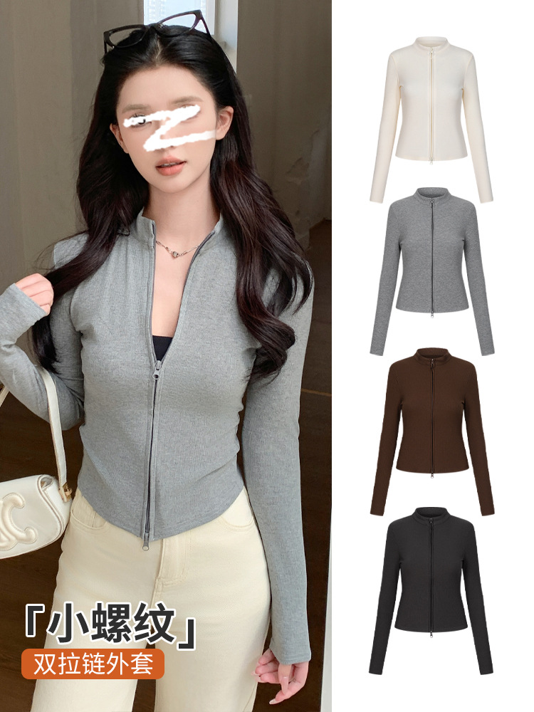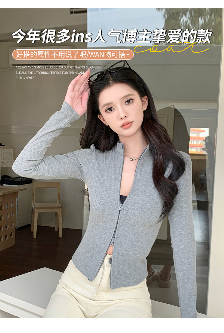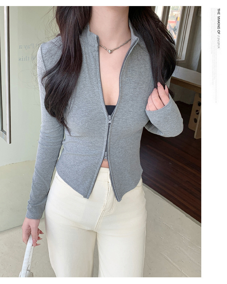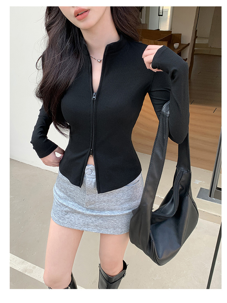 H823 куртка с двойной молнией и воротником-стойкой, женская весенне-осенняя новая вязаная куртка-кардиган, облегающий универсальный короткий топ с длинными рукавами