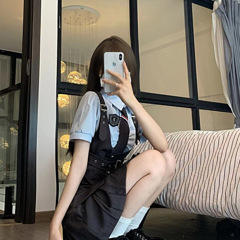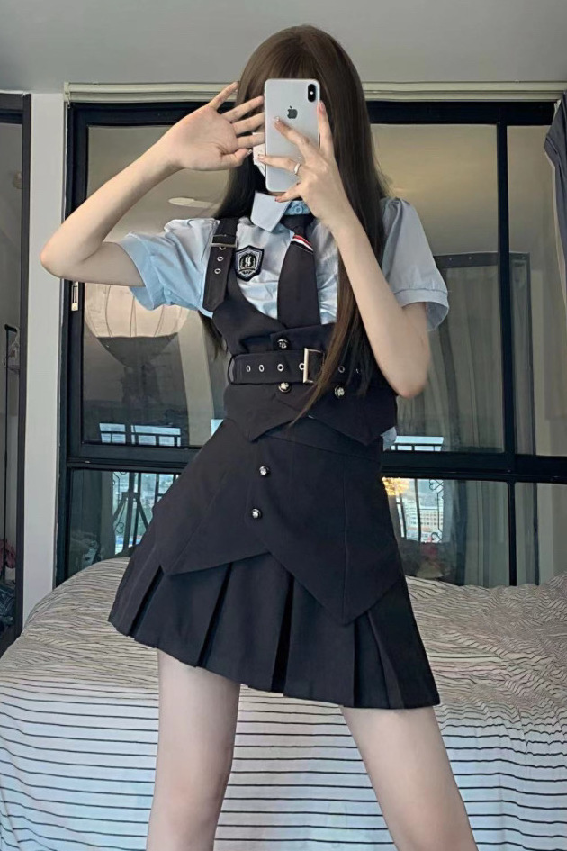 Одинарная синяя рубашка (без значка на галстуке); Синяя рубашка + галстук + значок; Одинарный жилет (с поясом); одинарная юбка; Костюм рубашка+галстук+пояс+юбка