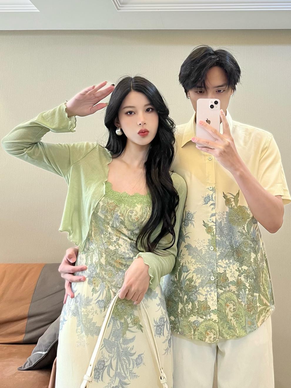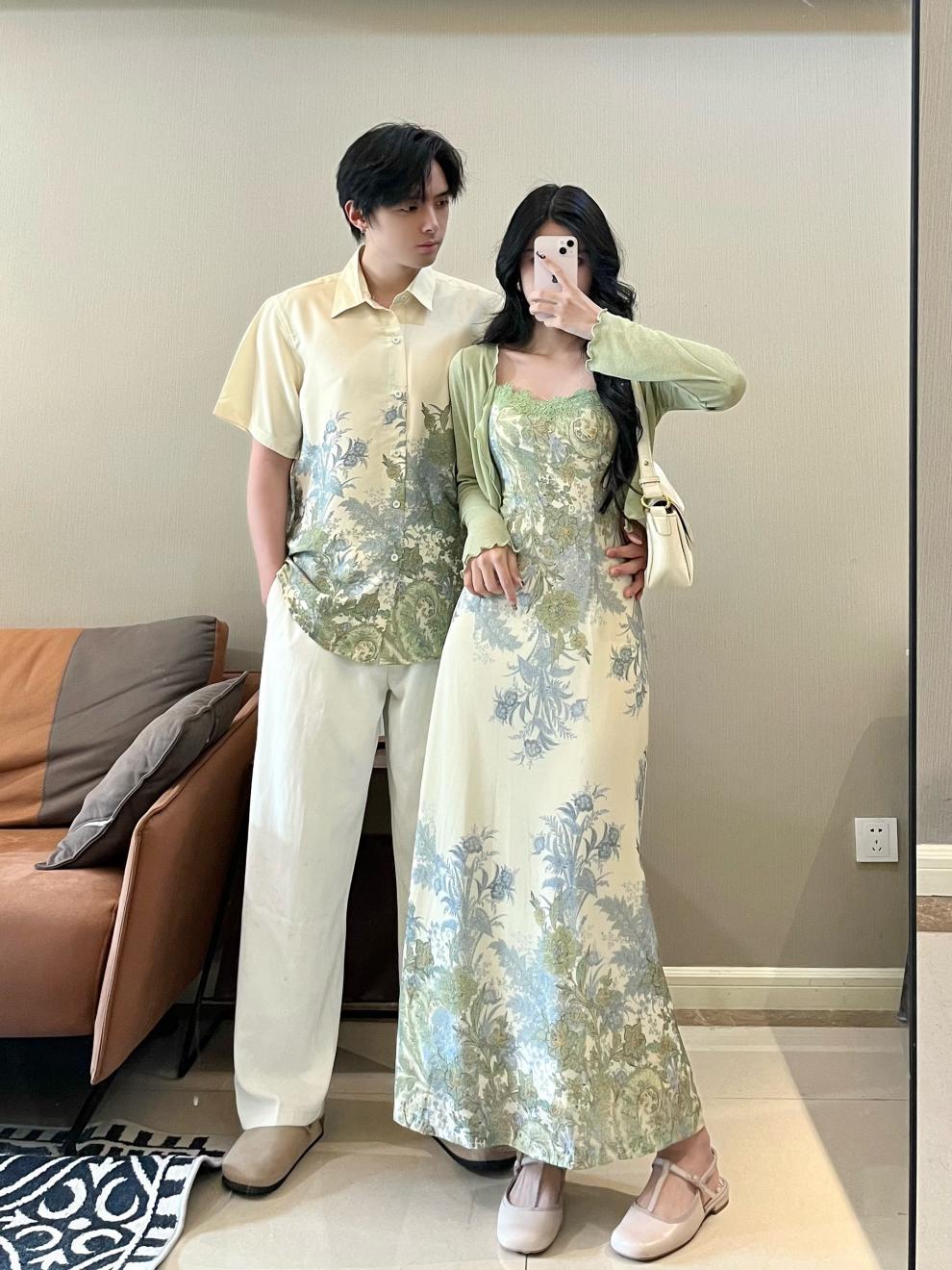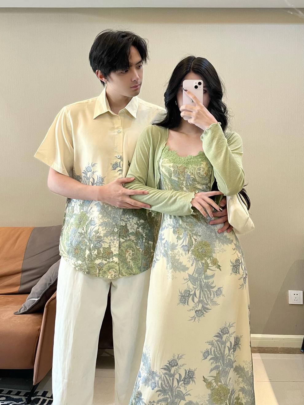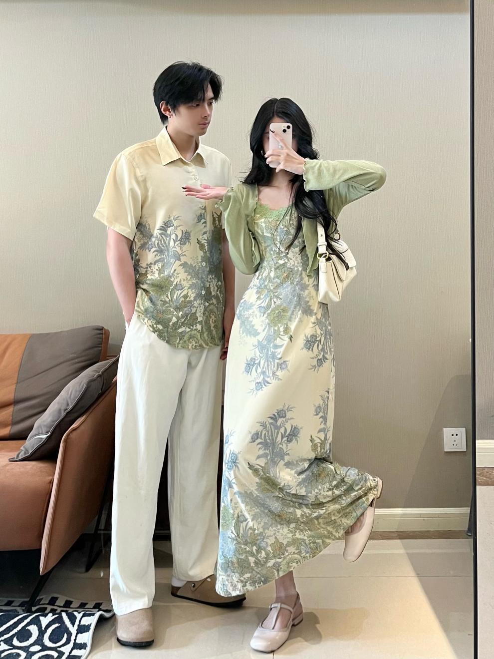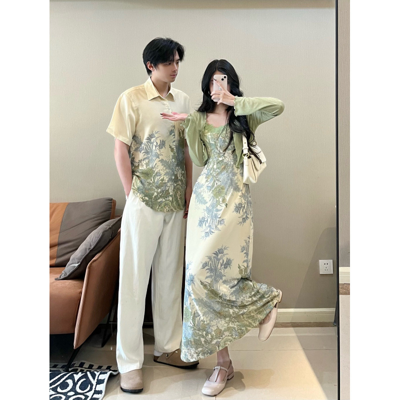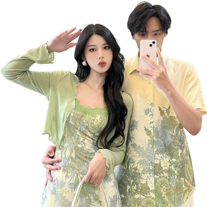 2025 Летний наряд для пар Новое платье в китайском стиле Мужская рубашка из двух частей Путешествие пляжного сезона
