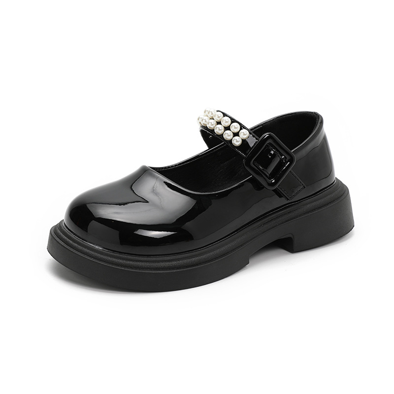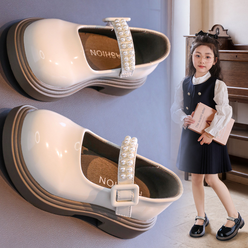 2025 Весенние новые кожаные туфли для девочек, универсальные модные повседневные туфли-принцессы для старших детей, туфли для выступлений с жемчужной завязкой для школьниц.