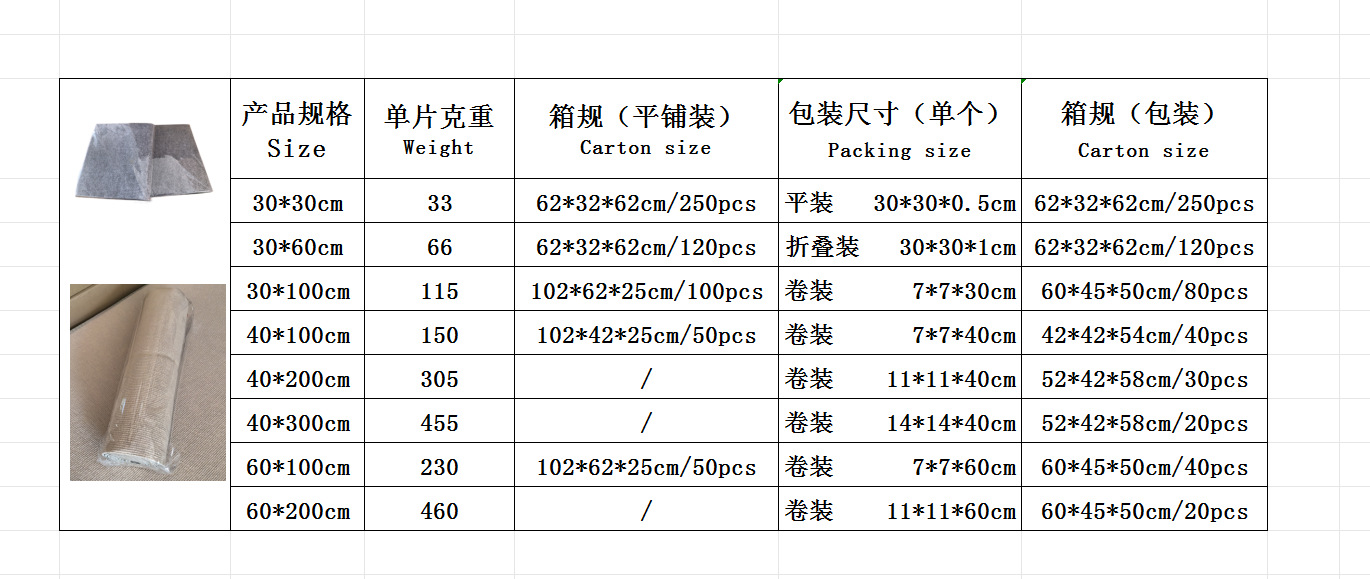 30cm*30cm; 30cm*60cm; 30cm*100cm; 40cm*100cm; 60cm*100cm; 40cm*200cm; 40cm*300cm