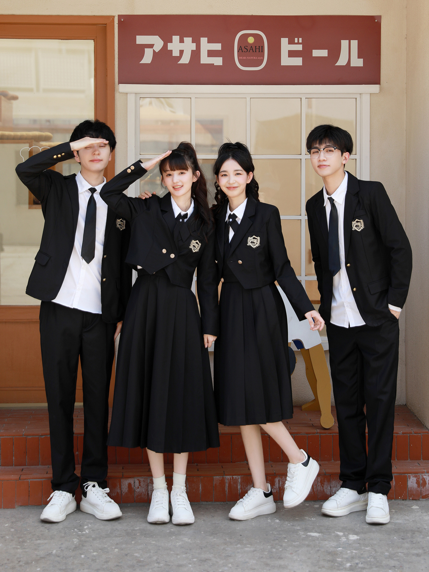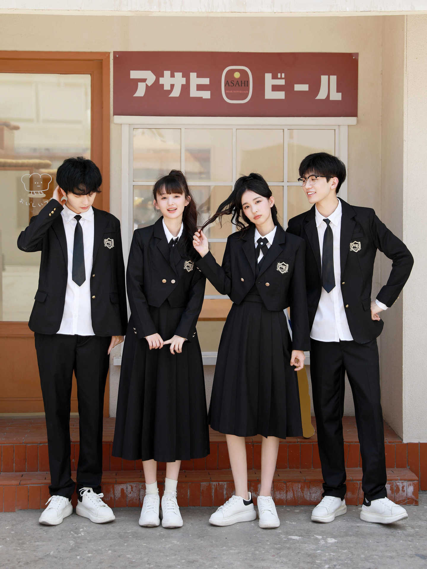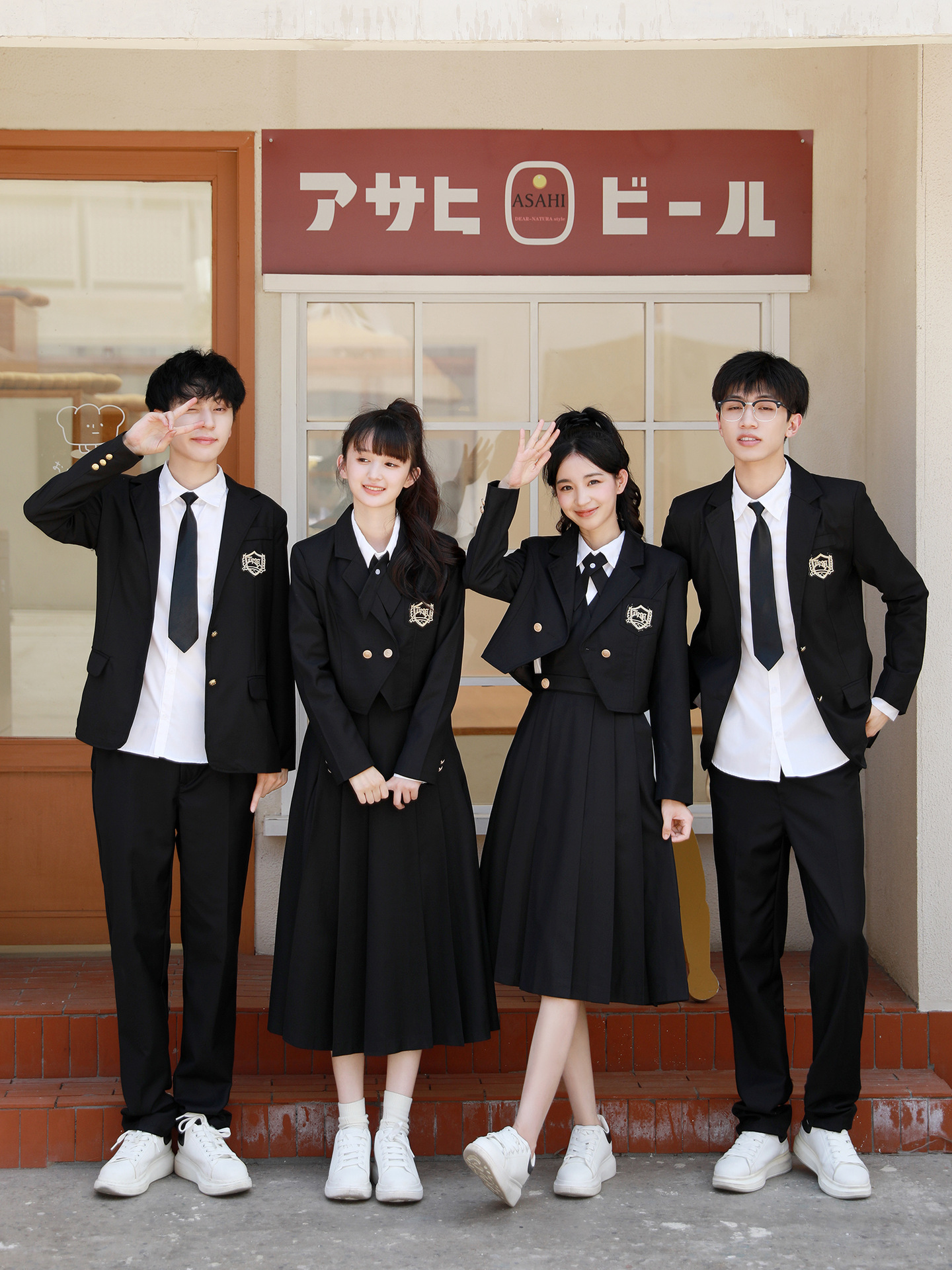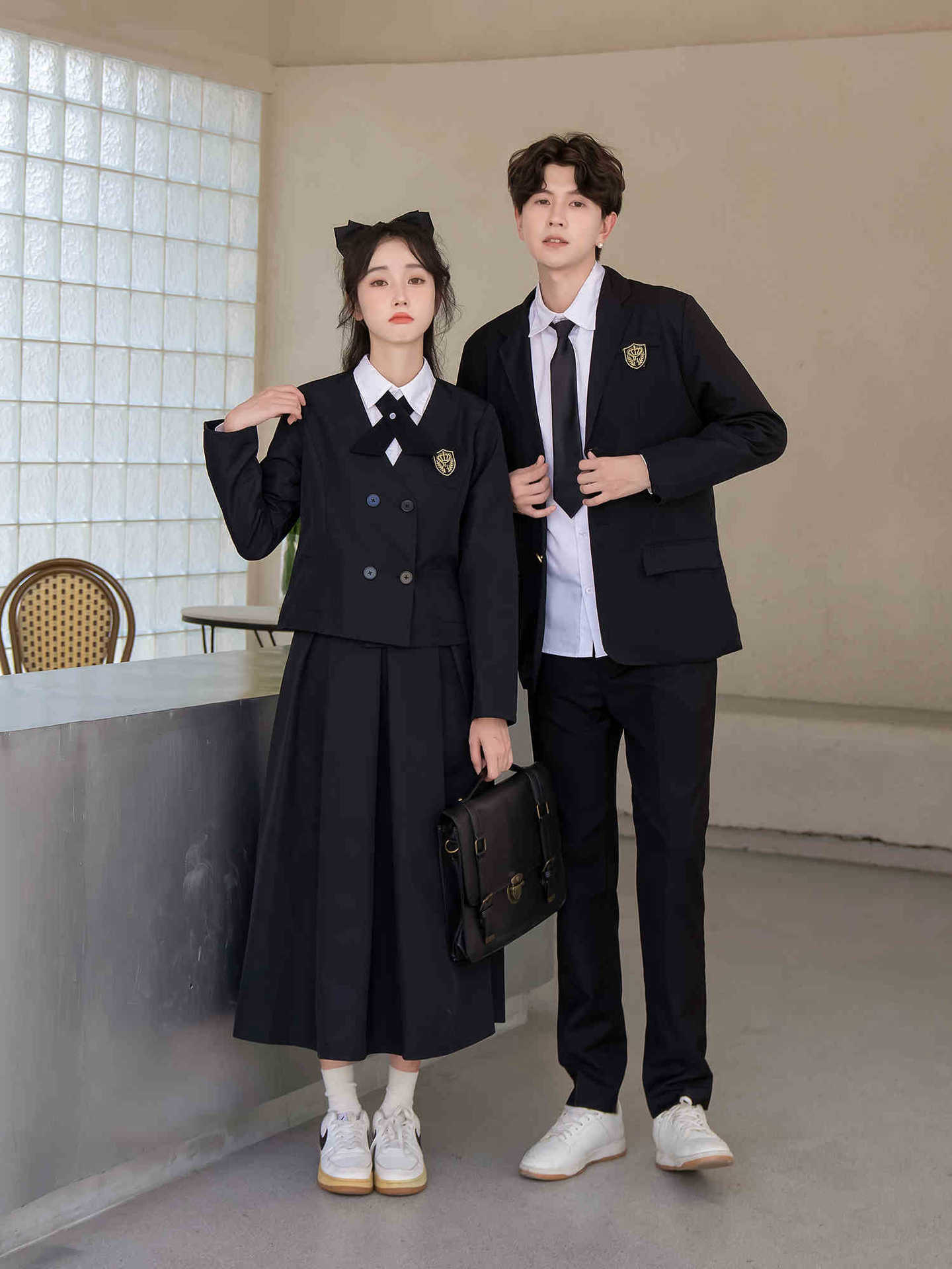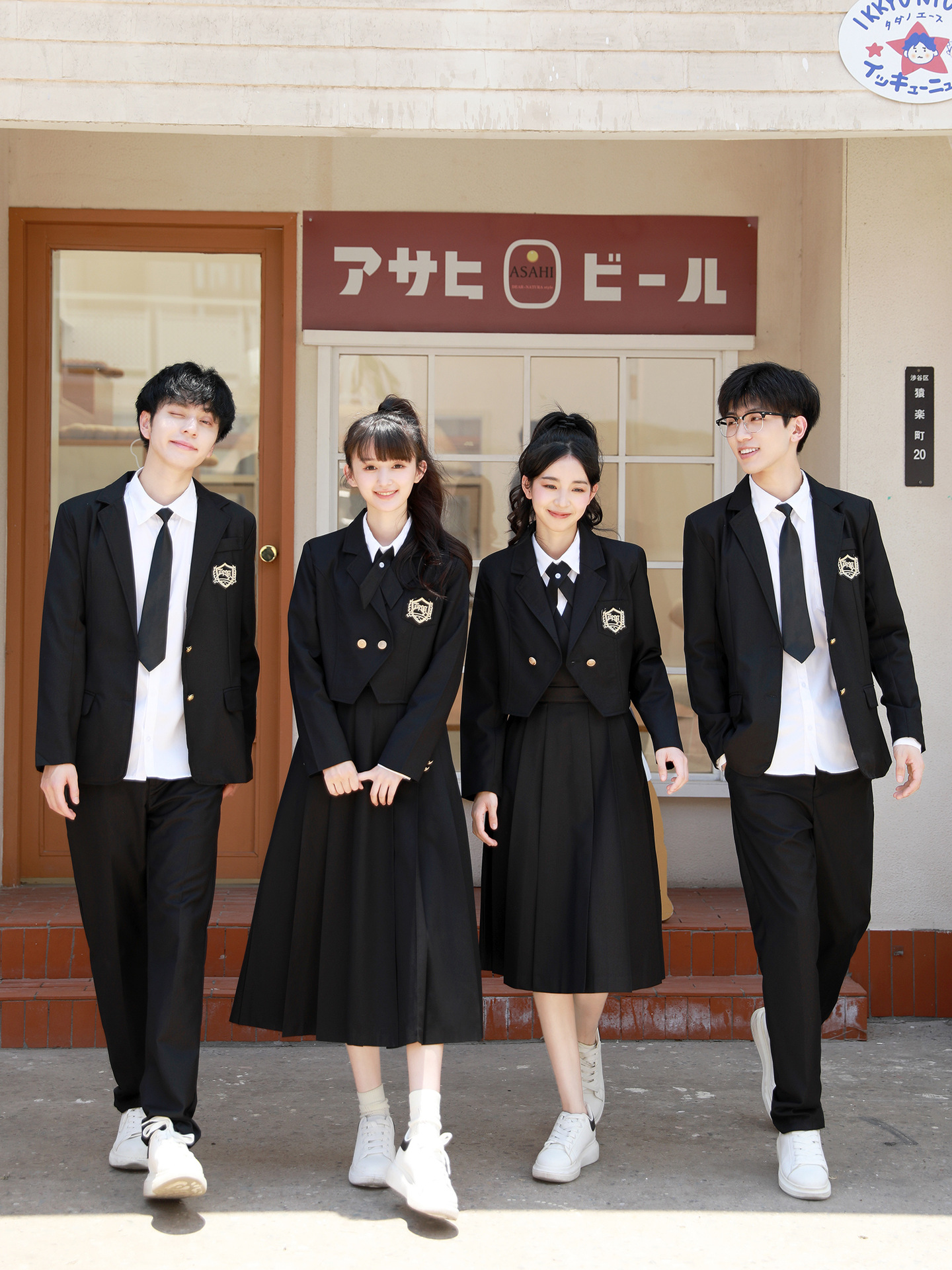 Женский белый длинный рукав + черная юбка + короткий костюм + крестовый узел; Женский белый длинный рукав + черная юбка миди + короткий костюм + перекрестный узел; Женский белый длинный рукав + черная длинная юбка + короткий костюм + перекрестный узел; Мужские белые длинные рукава + черные брюки + черный костюм + черный галстук; Белые короткие рукава + крестик.; Белые короткие рукава + черный галстук.