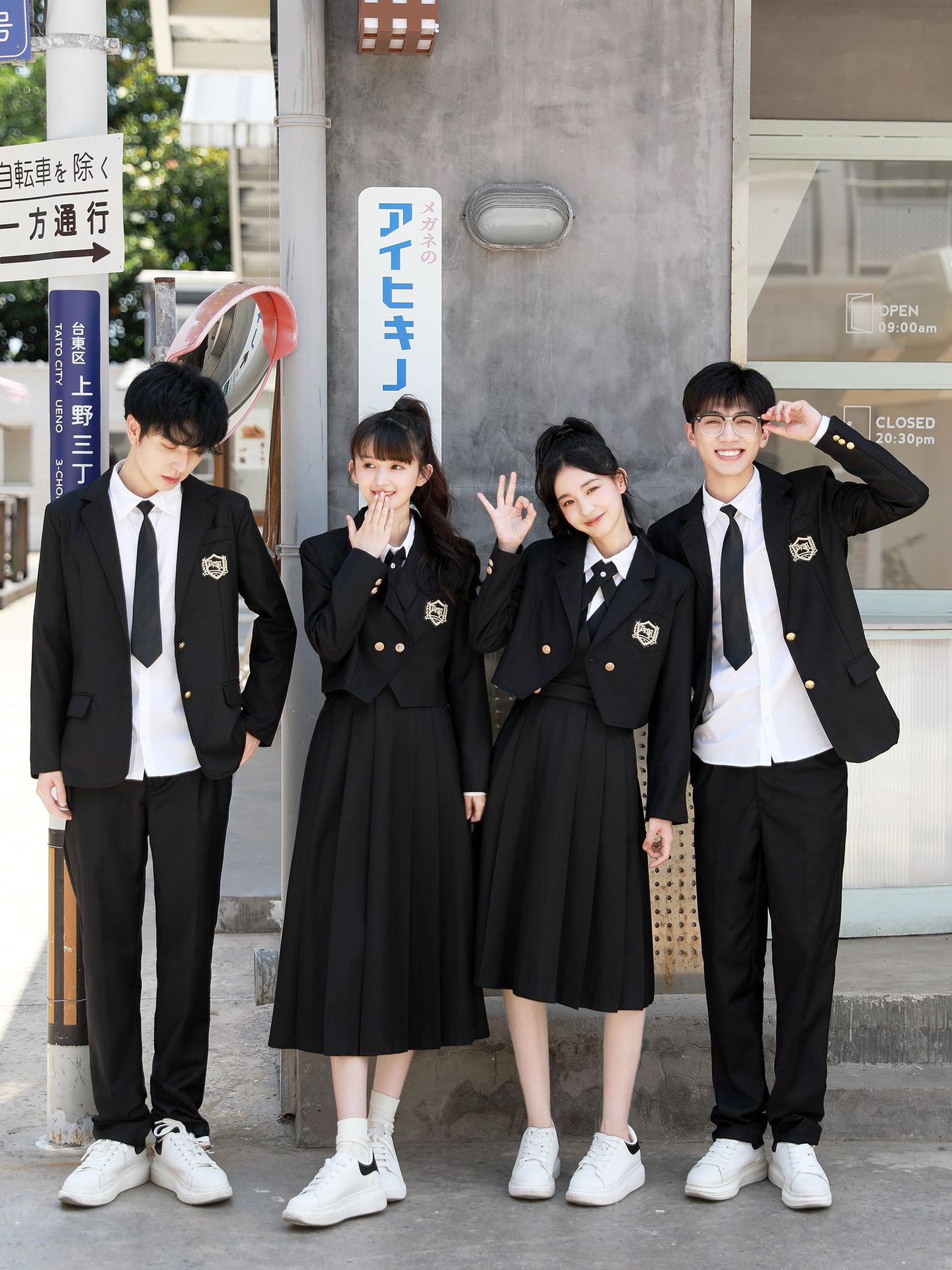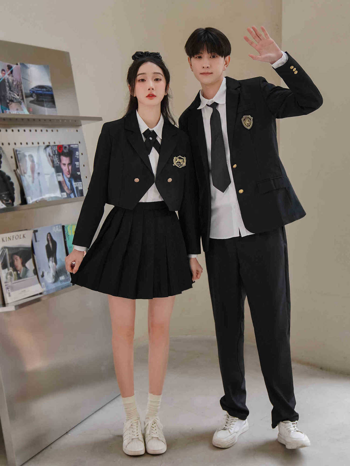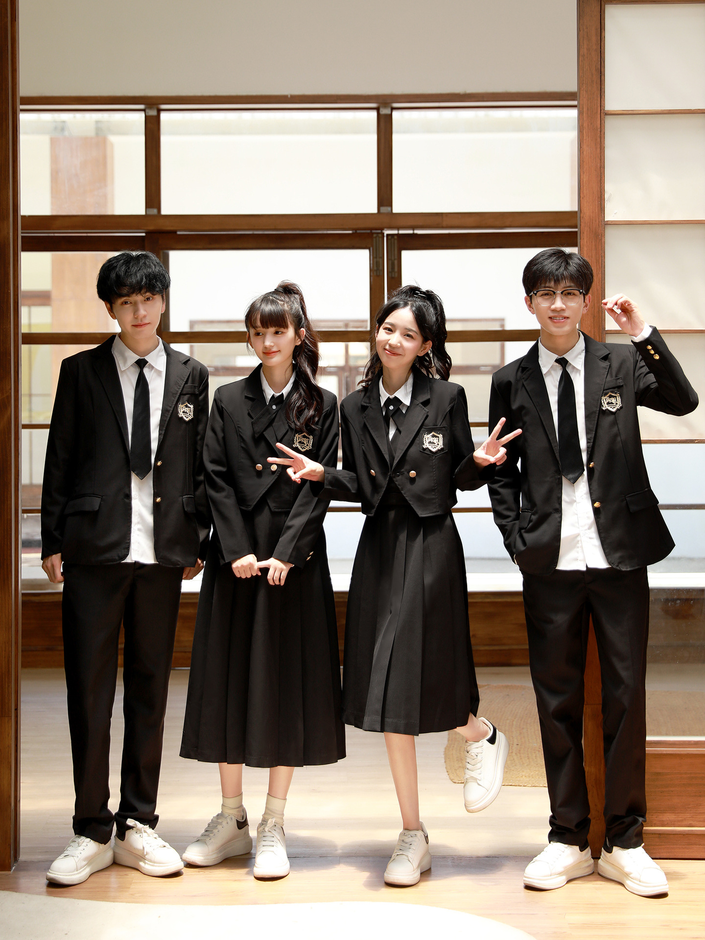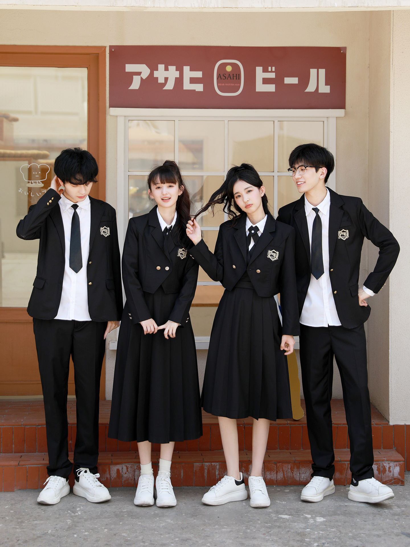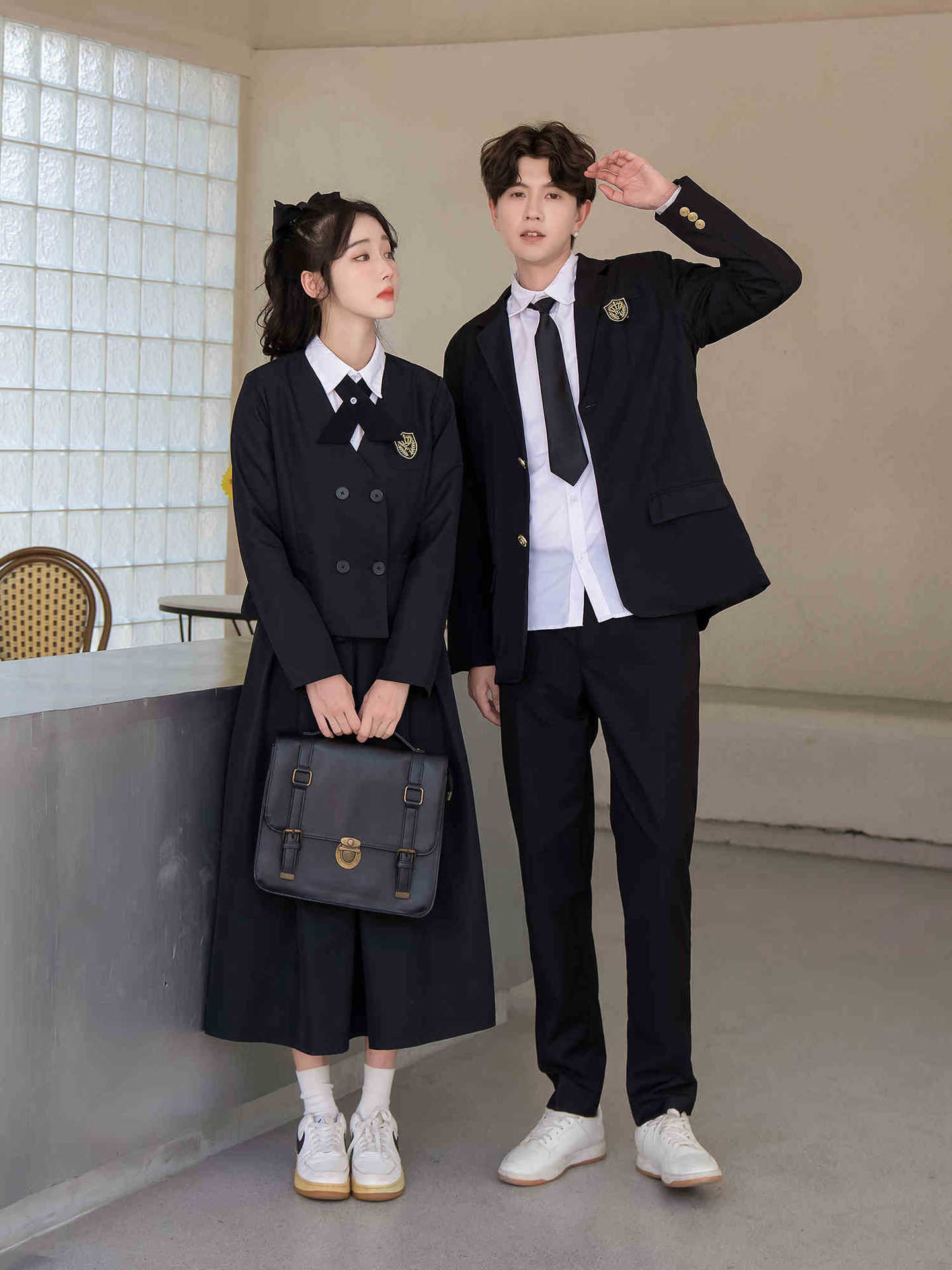 Женский белый длинный рукав + черная юбка + короткий костюм + крестовый узел; Женский белый длинный рукав + черная юбка миди + короткий костюм + перекрестный узел; Женский белый длинный рукав + черная длинная юбка + короткий костюм + перекрестный узел; Мужские белые длинные рукава + черные брюки + черный костюм + черный галстук; Белые короткие рукава + крестик.; Белые короткие рукава + черный галстук.