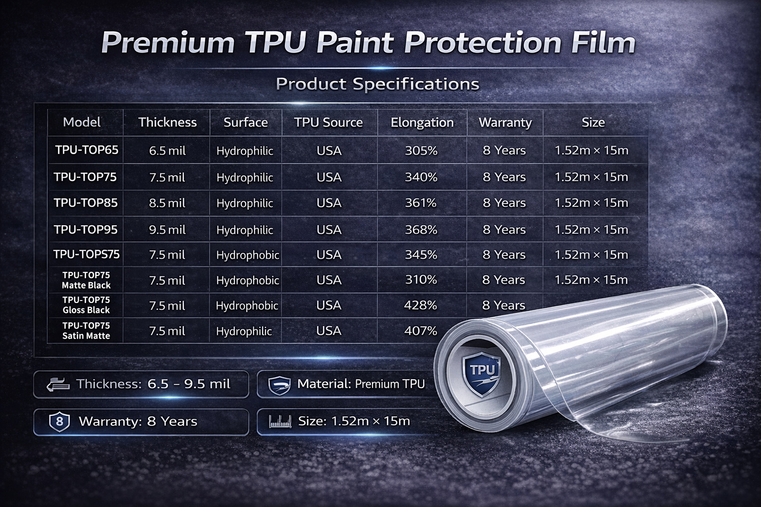ТПУ-C75 (гидрофильное покрытие); ТПУ-CS75 (гидрофобное покрытие); ТПУ-KL75 (высокая прочность на разрыв); ТПУ-KW75 (высокая устойчивость к пятнам); TPU-R75 (высокая производительность при низкой стоимости); TPU-XM1 (высокий отскок без скручивания); Для получения информации о дополнительных моделях и настройках, пожалуйста, обратитесь в службу поддержки.
