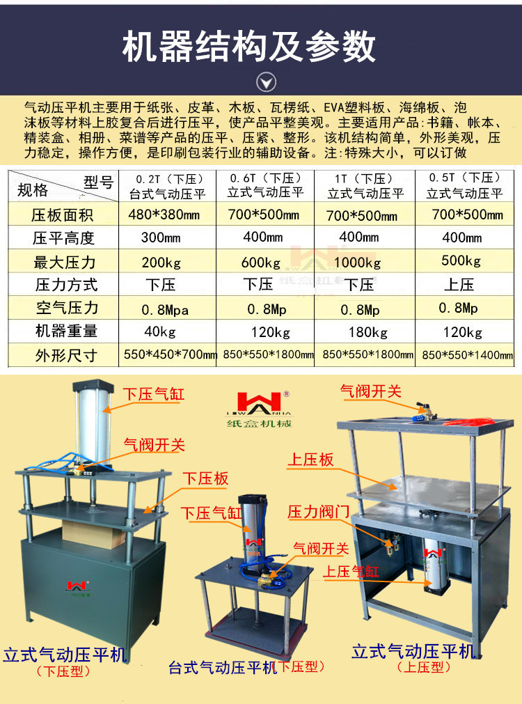 Пневматическая выравнивающая машина (давление вниз 0,6 т); Пневматическая уплощающая машина (давление вниз 1 тонна); Пневматическая уравнивающая машина (верхнее давление 0,5 т); Пневматическая уплощающая машина (задержка 0,5 т/верхнее давление); Настольная пневматическая выравнивающая машина (давление вниз 0,2 т)