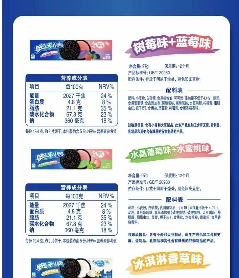 及时解决消费者售后问题.热心解答.以 服务为根本.以诚信求生存. 奥利奥97g,多种口味,1箱24盒,批发购买请按24的倍数购买,便于发货。欢迎实体商超批发客户合作