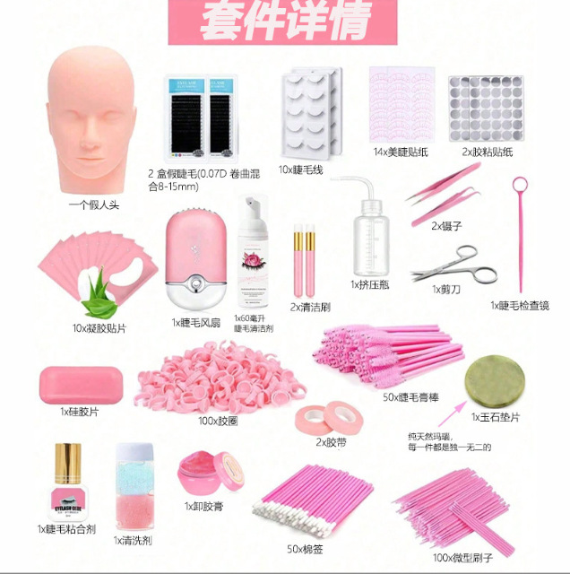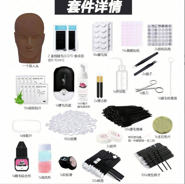 - 【专业睫毛套装】这款睫毛延长套件带人体模型头、睫毛扇、观察镜、硅胶睫毛延长垫、睫毛镊子、胶带、眼底凝胶垫、一次性睫毛刷、胶水环支架、清洁刷、镊子睫毛胶去除器、胶粘剂、玉石、一次性微刷涂抹器、眼底定位纸、练习睫毛、个人睫毛。 2、眼睫毛、 眼睫毛睫毛胶水去除器(仅适用于人体模型头部)和睫毛剪刀。